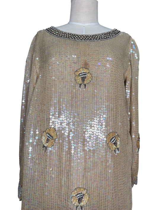 1970s ShoMax Beige Iridescent Sequined Silk Gown