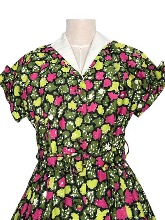 1940s/1950s Belted Geometric Green and Pink Circle Skirt Dress