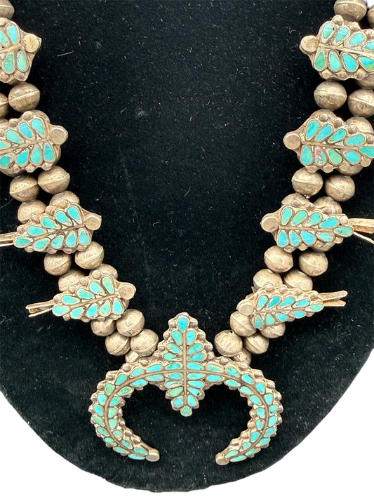 1930s Zuni Turquoise and Silver Squash Blossom Necklace