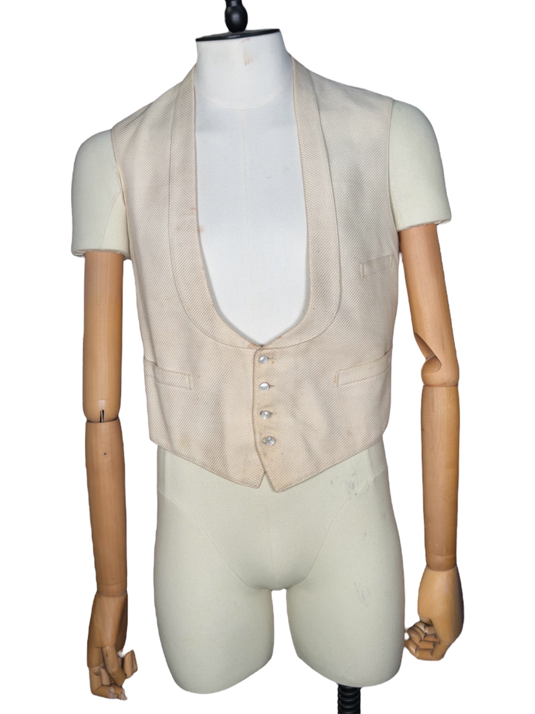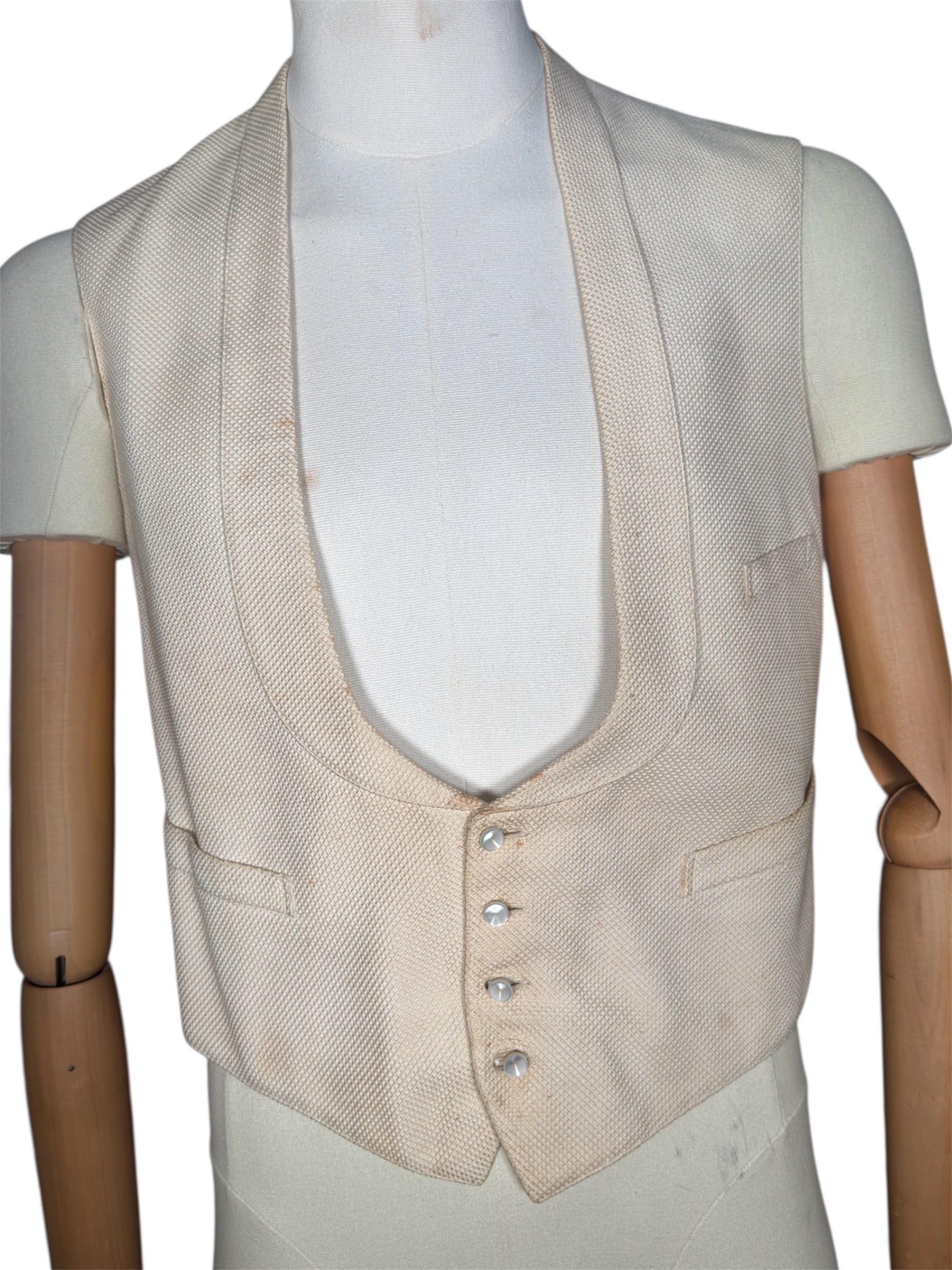 1920s Art Deco men's vest. This distressed vest features a cream color, a low-cut design, four plastic buttons attaching the vest in the back, and an adjustable belt on the back. There is significant staining throughout the vest, all pictured in the photos. There are also two pockets on the front of the vest.