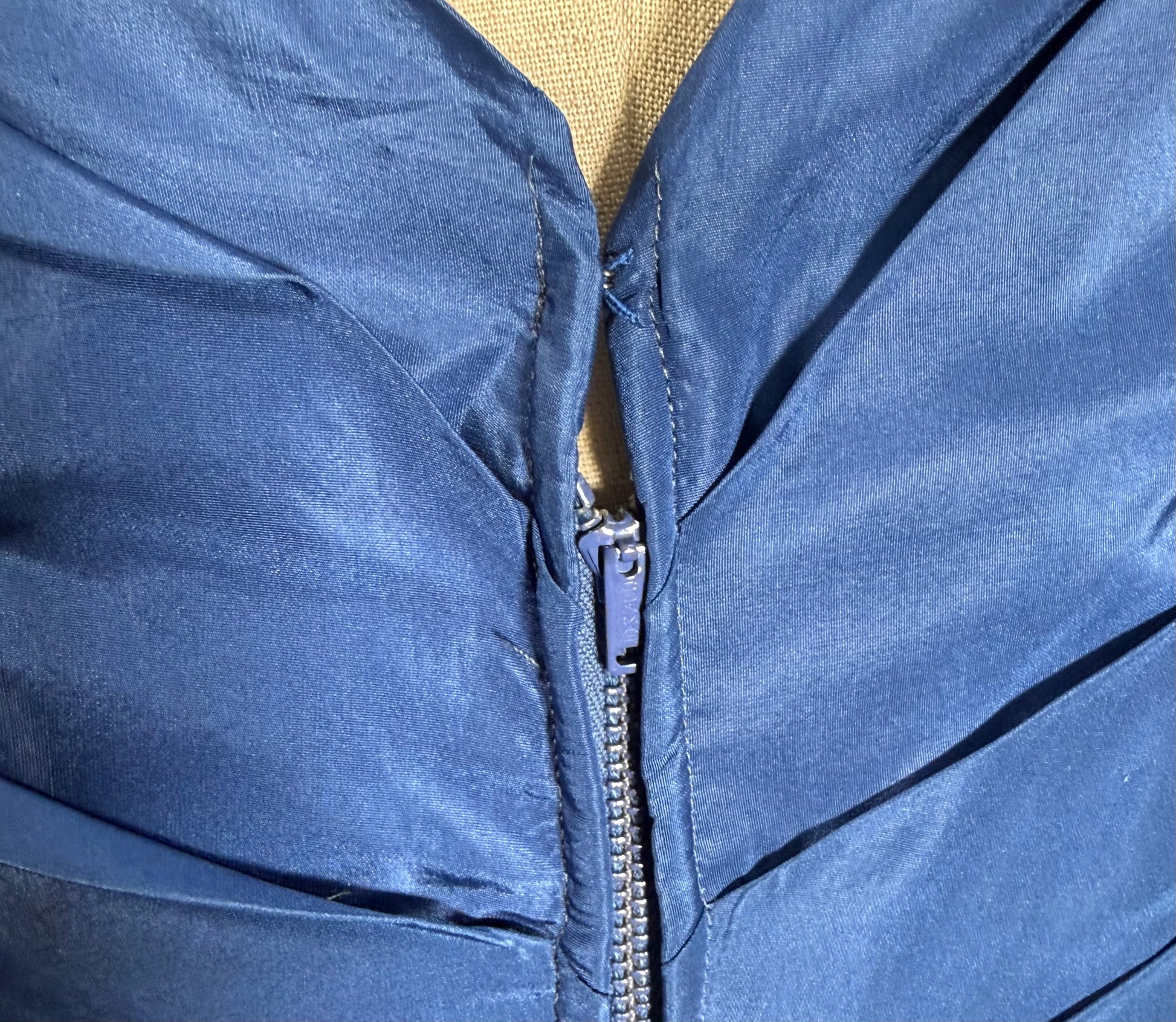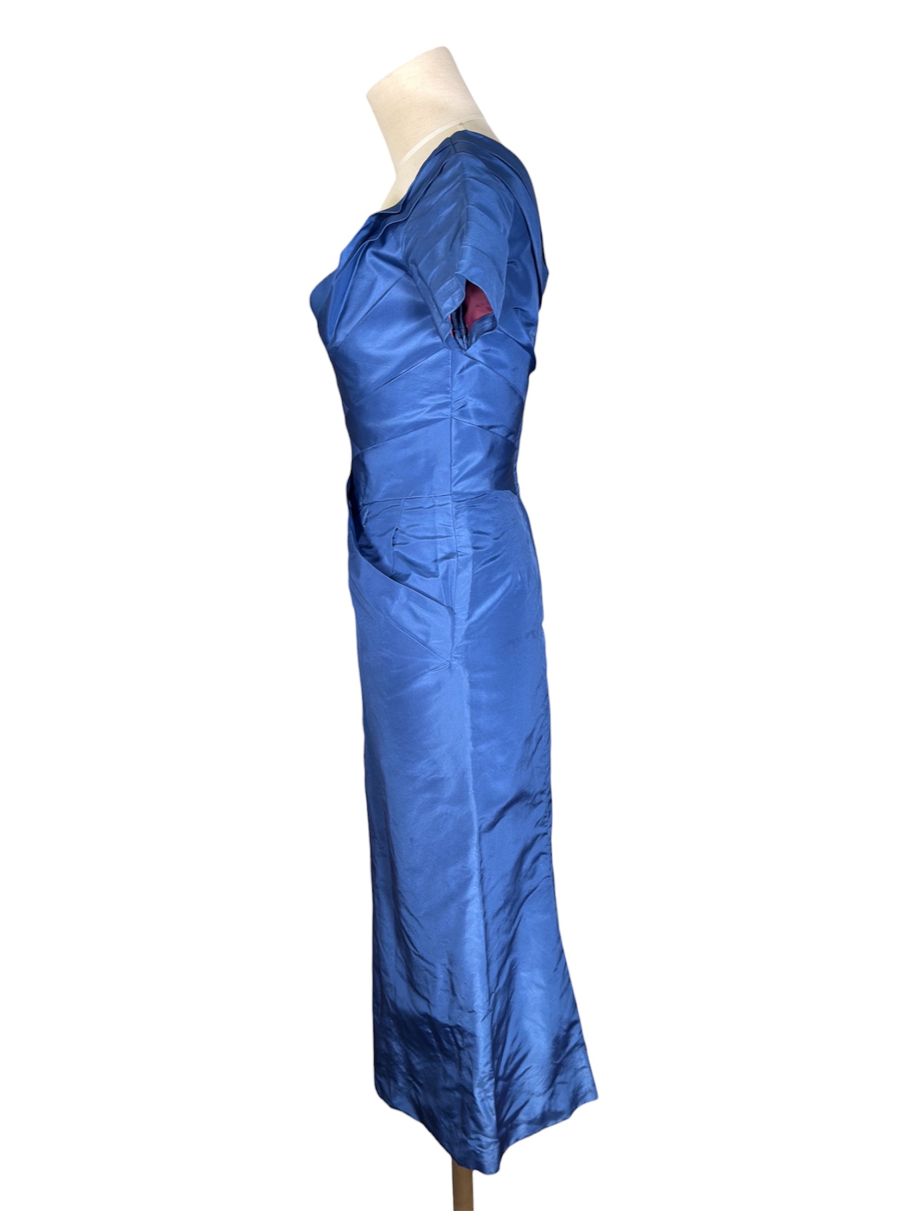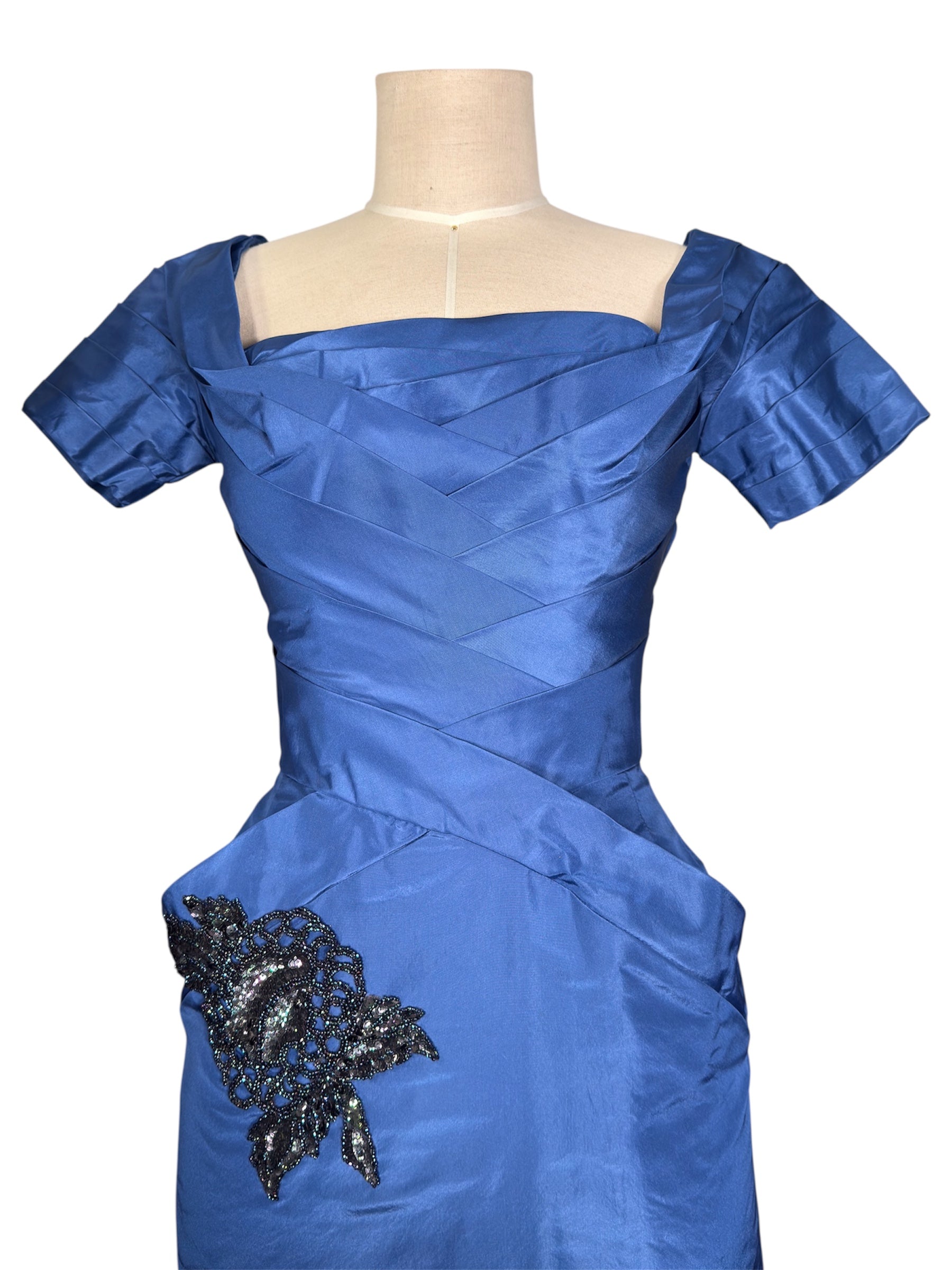 1950s Ceil Chapman evening dress featuring structured pleated bodice, short sleeves, and a fitted silhouette. The dress is crafted in vibrant blue fabric with an ornate black beaded and sequined floral appliqué at the hip and a full metal zipper at the back. The appliqué is a later edition. Perfect for cocktail events. There were no noticed flaws with this piece, it is in excellent condition.