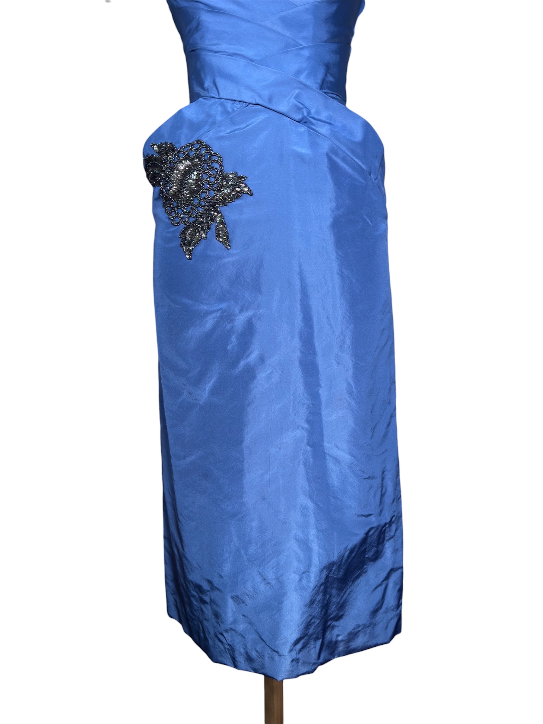 1950s Ceil Chapman Fitted Blue Dress With Beaded Appliqué