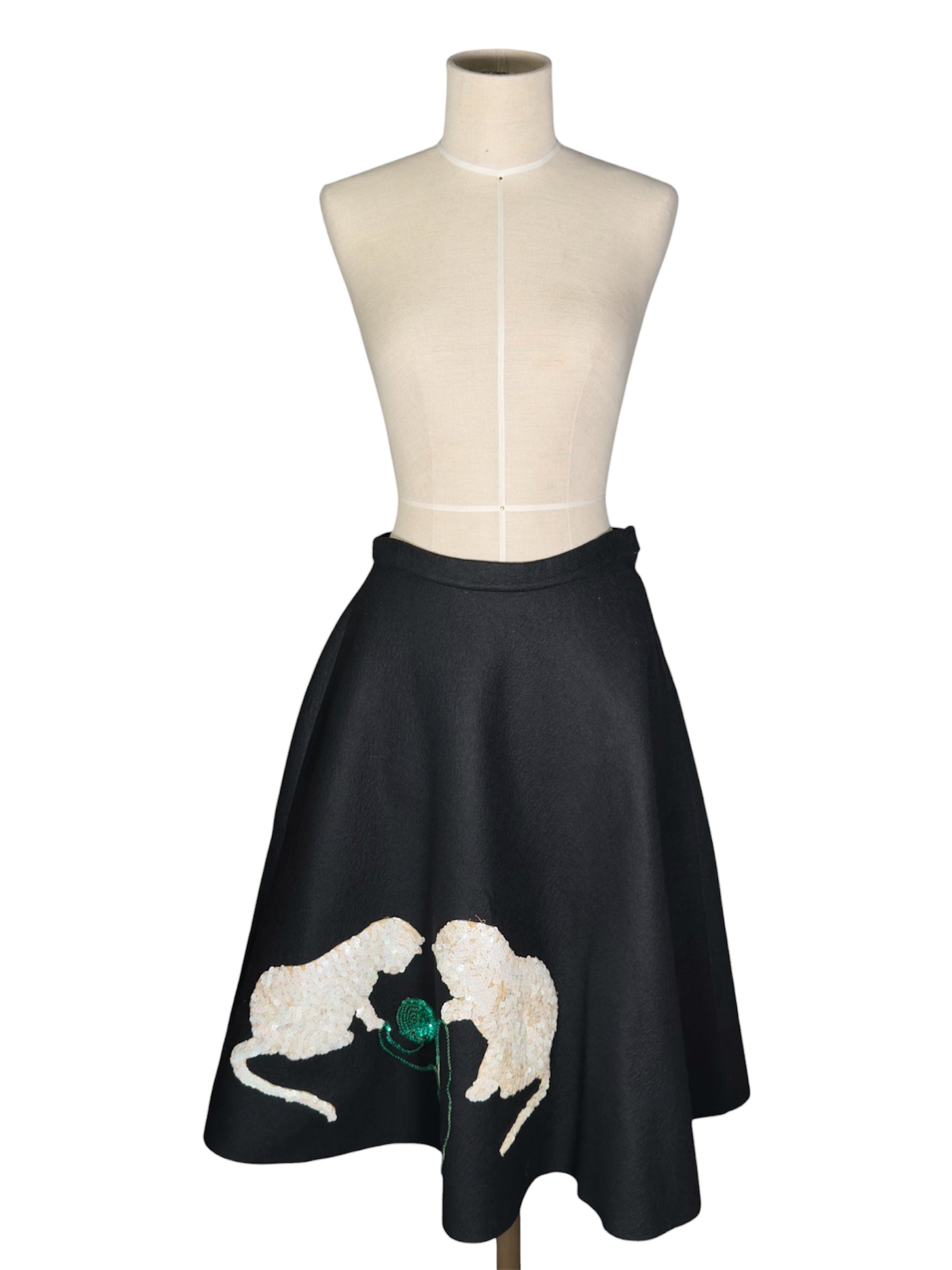 1950s Joan Rafferty Black Wool Circle Skirt With Sequin Cat Appliqué