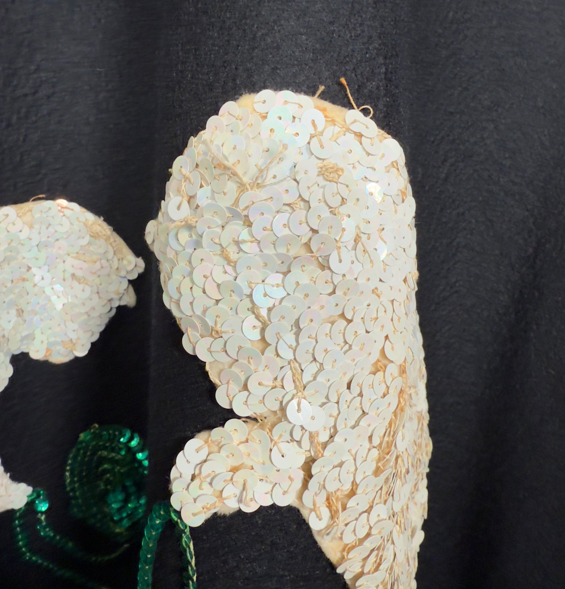 1950s Joan Rafferty skirt. Black full circle skirt with two sequin-embellished cats playing with a green yarn ball motif, detailed novelty design, and high-waisted silhouette. Attaches at the side with a metal zipper and two hook and eyes above. There are some condition issues with this piece, pictured in the last two photos. There is a tiny brown mark on the front top of the skirt and some loose strings in the sequins of the cat on the right.