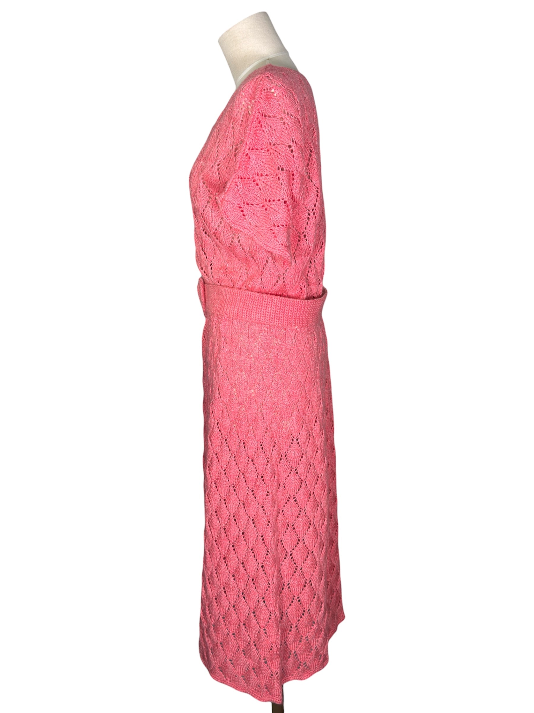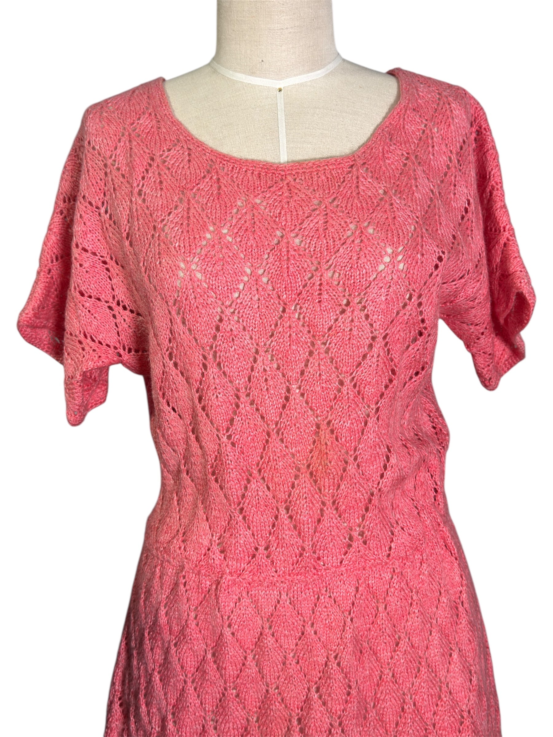 1950s unlabeled pink openwork knit dress featuring a matching waist belt, short sleeves, and diamond pattern ideal for summer or spring gatherings. The belt is elastic on the back, suitable for a range of sizes and the elastic is in good condition, not crunchy. There are no fastenings on this dress, it is a pullover. There is a condition issue with this piece, pictured in the last photo. There is discoloration on the front, right above the waist.
