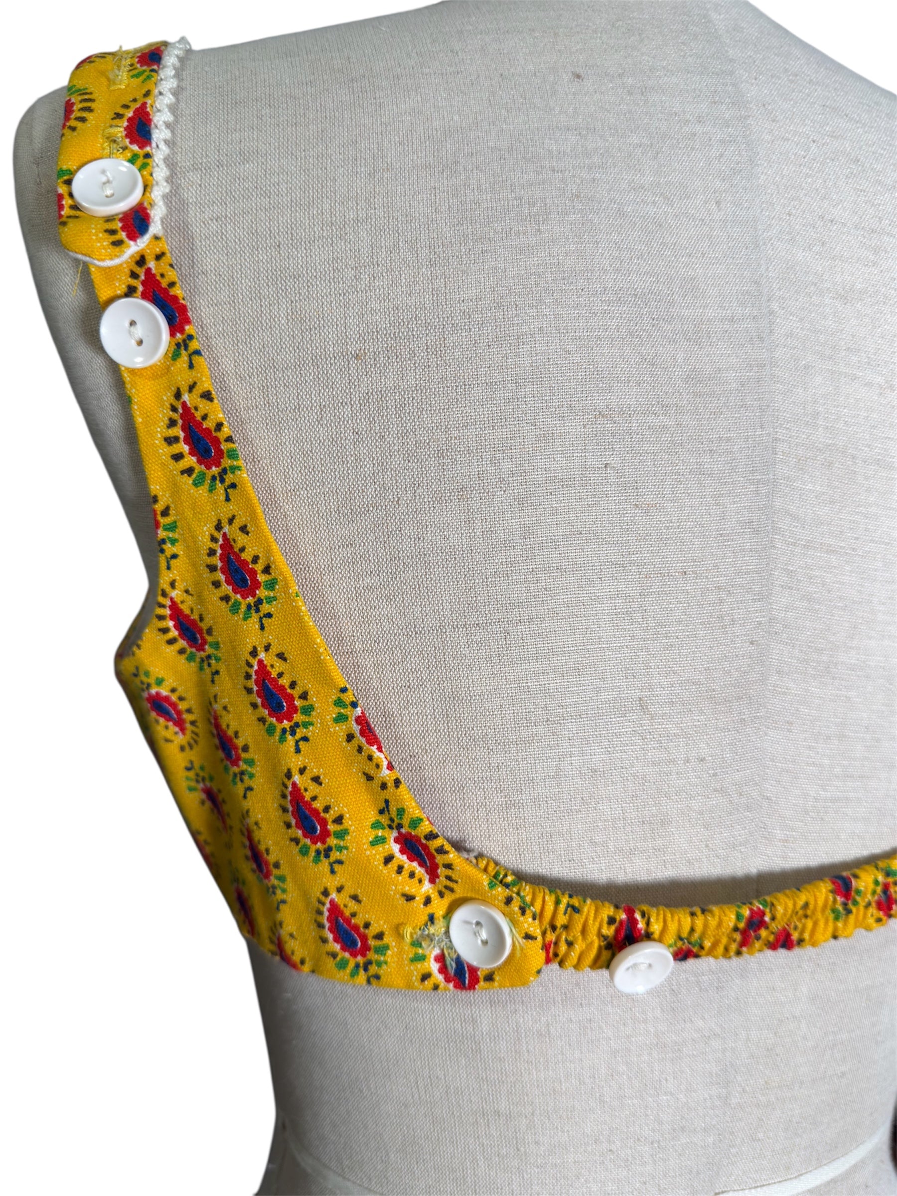 1960s unlabeled cotton two piece swimsuit set featuring a vibrant yellow paisley print bikini top and matching high-waisted swim shorts. The top has a square neckline, white adjustable button closures at the shoulders and back, and lace trim along the neckline. The top also has an elastic band at the bottom, that is in excellent condition and is not crunchy. The shorts have a back metal zip closure, along with an above hook and eye closure, and are trimmed with white lace at the hem. Lined top and shorts, with built-in cups in the top for structure and comfort. Fun and bold for summer or lounging. In good vintage condition with minor expected wear for age.