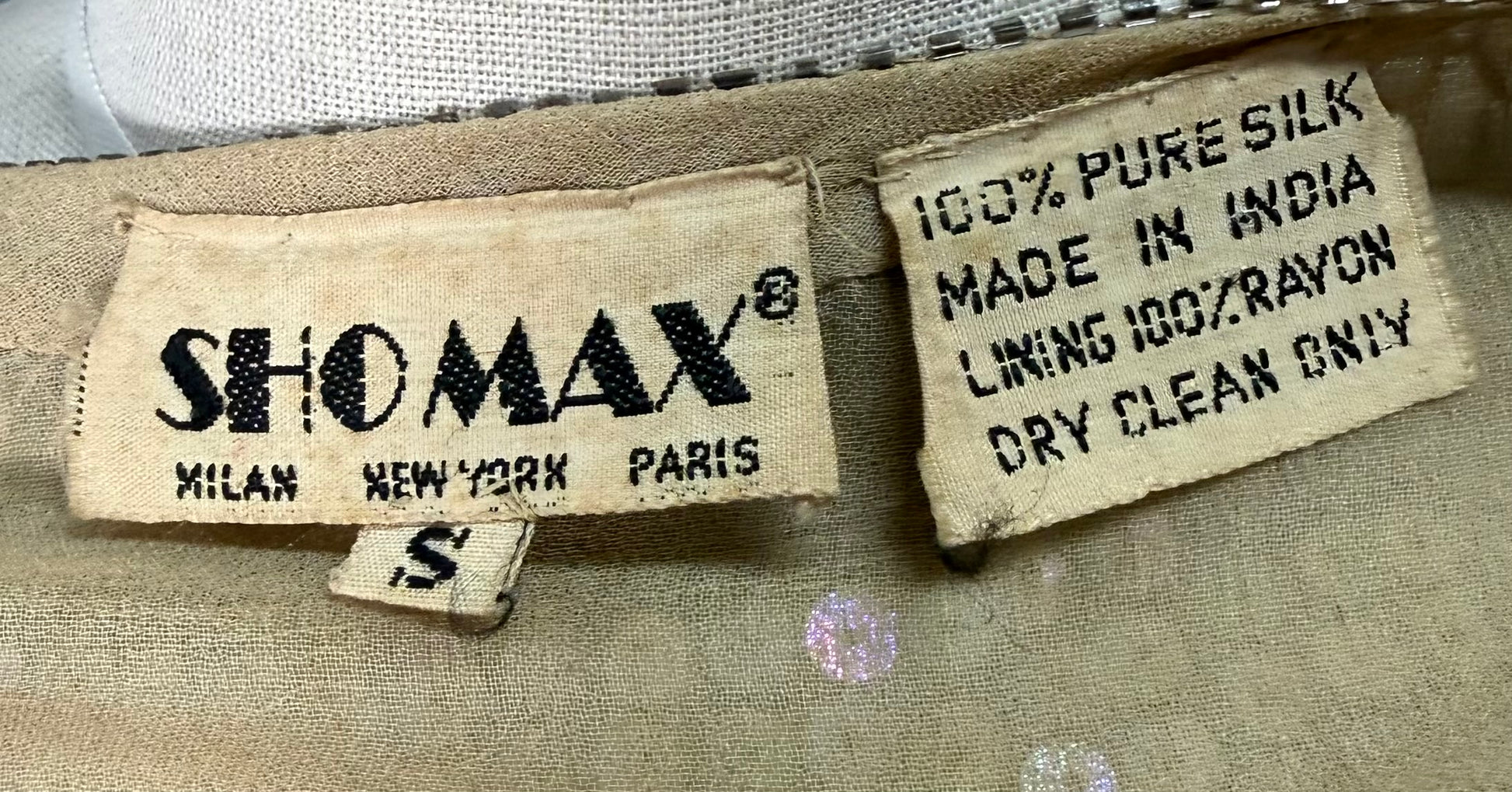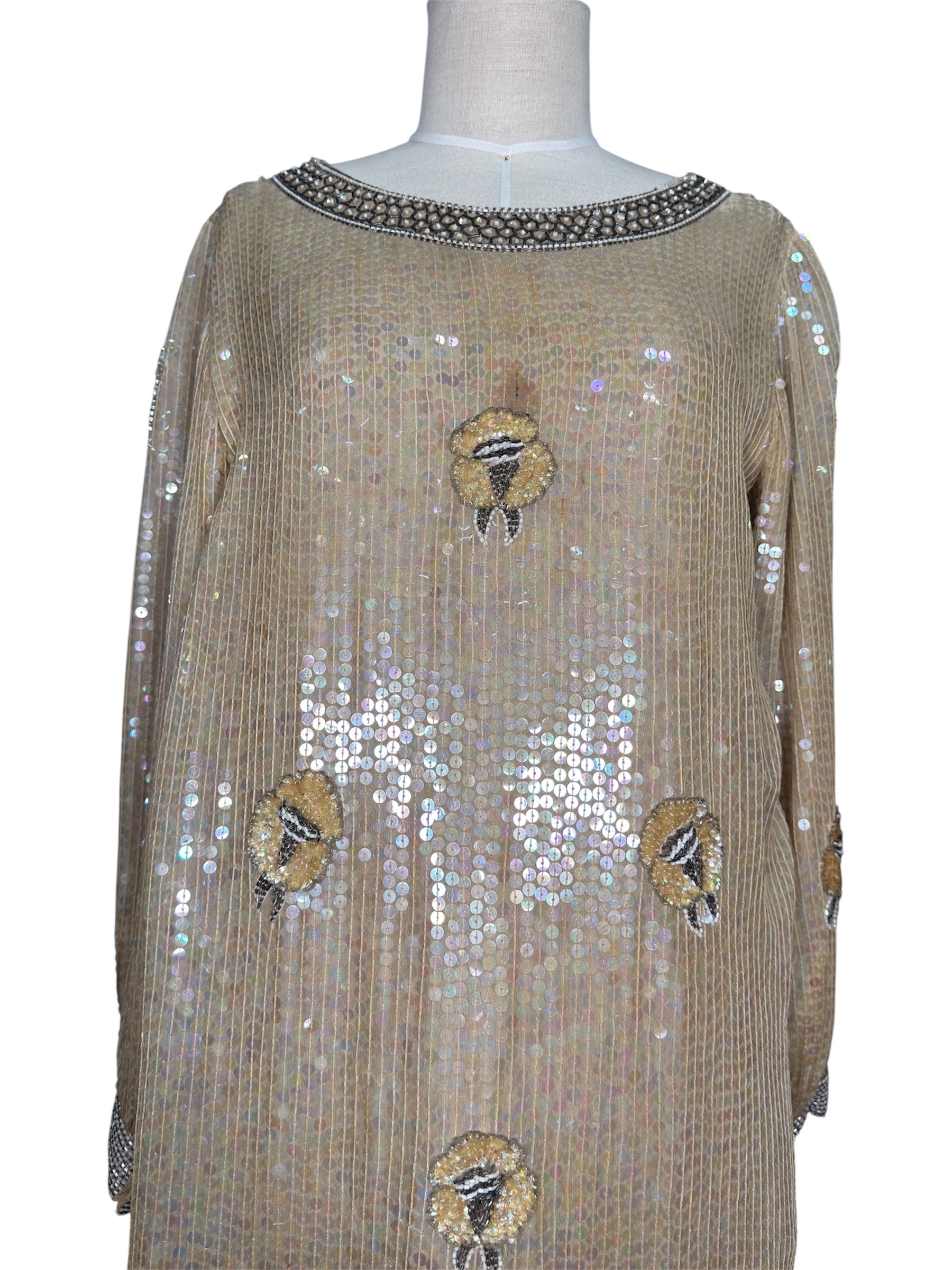 1970s Sho Max sequined and beaded floral gown. This long dress has beige/ivory sequins that turn iridescent multi-colored pastel colors in the light, with sequined flowers on the body and bottom of the dress. There is bead work on the collar, cuffs, and bottom of the dress as well. The dress is a loose, flowy cut with a round neckline and is 100% silk with a 100% rayon lining. The only fastenings on this dress are the snaps on the cuffs. This maxi dress is made in India and marked a size small, but please refer to the measurements as sizing changes based on the decade. There is a couple of condition issues with this piece, pictured in the last three photos. There is a discoloration on the front of the chest above the flower (shown in 2 photos), slight shattering of the silk on the left underarm facing the dress, and a few loose strings.