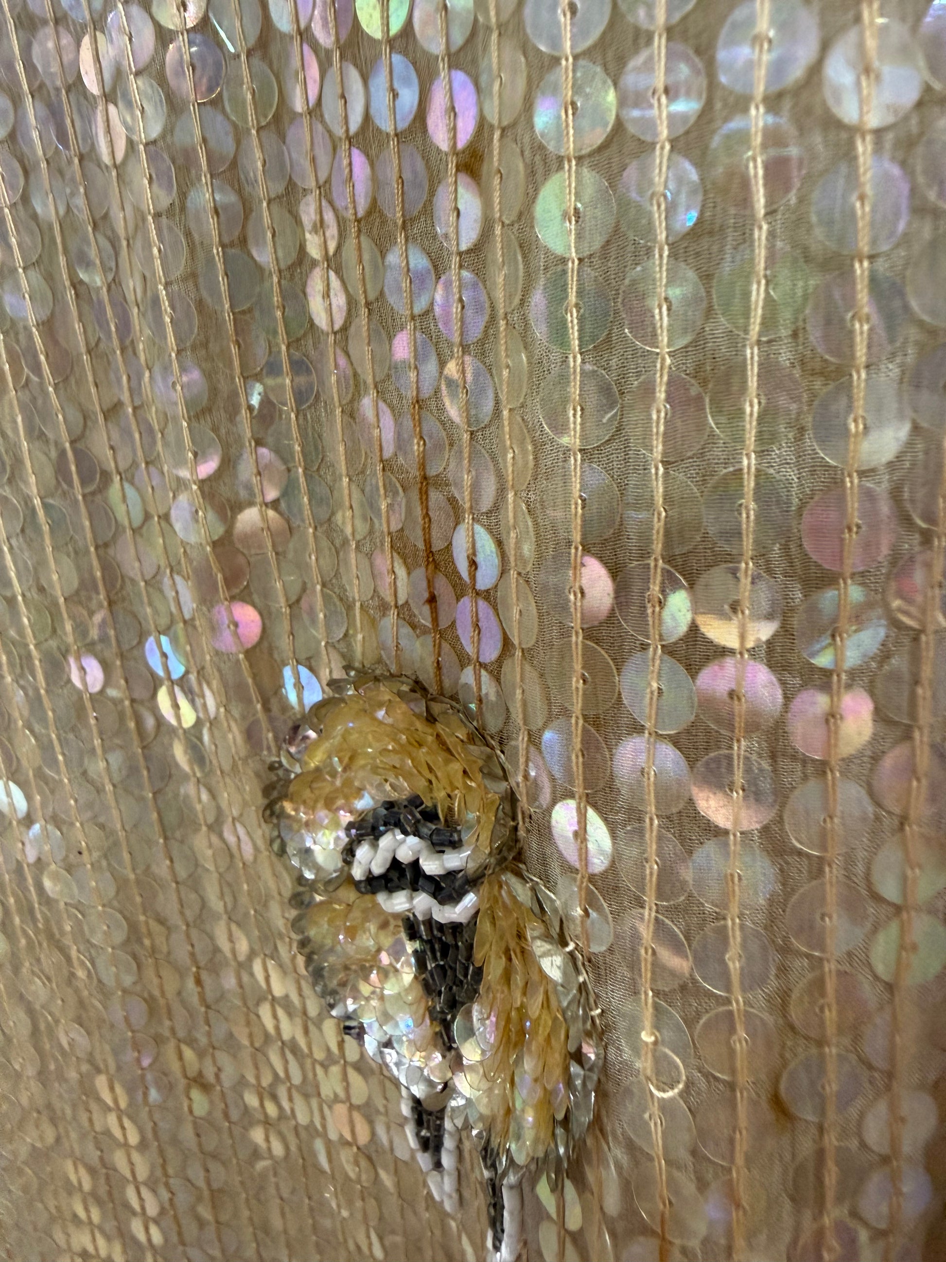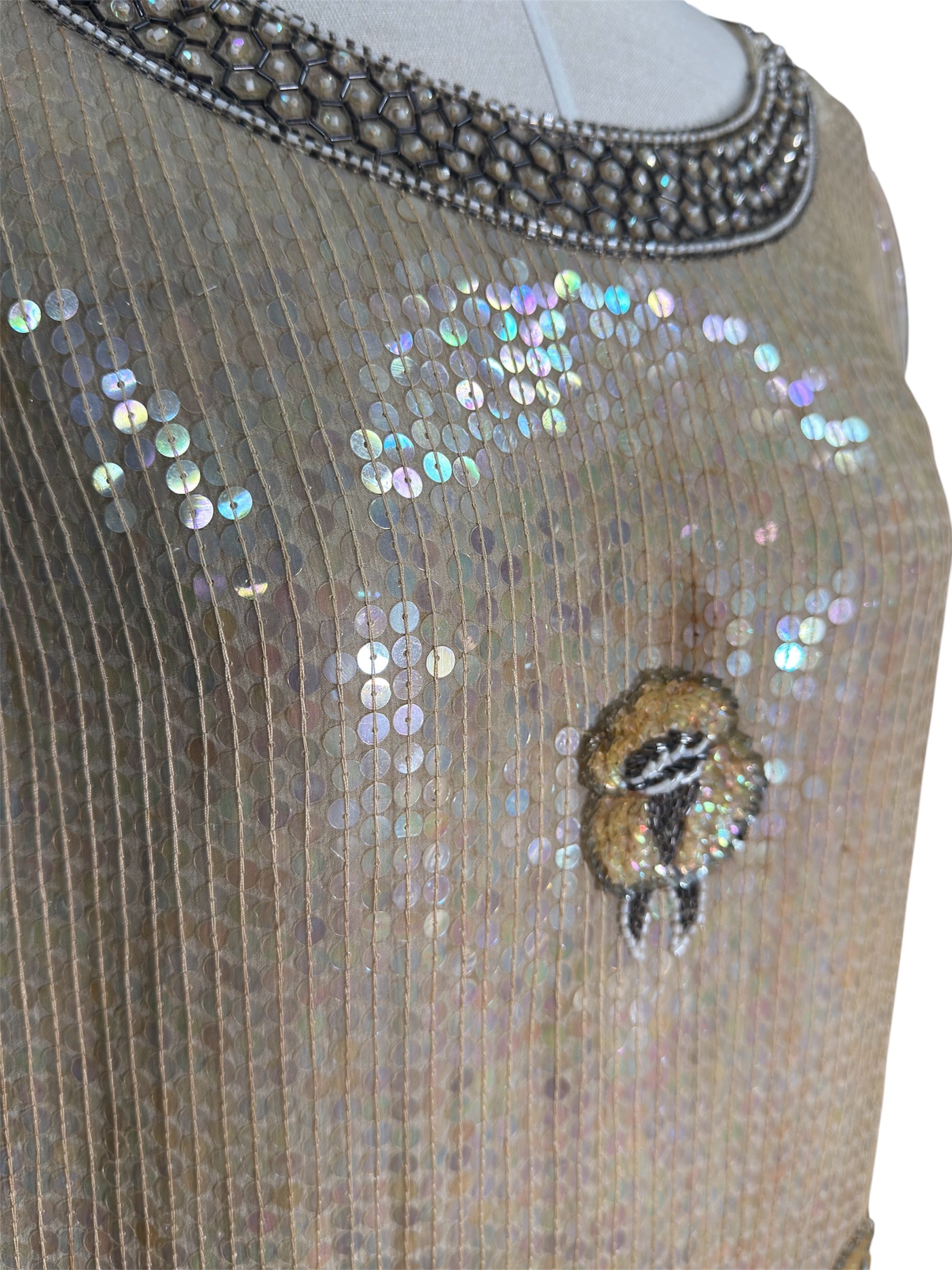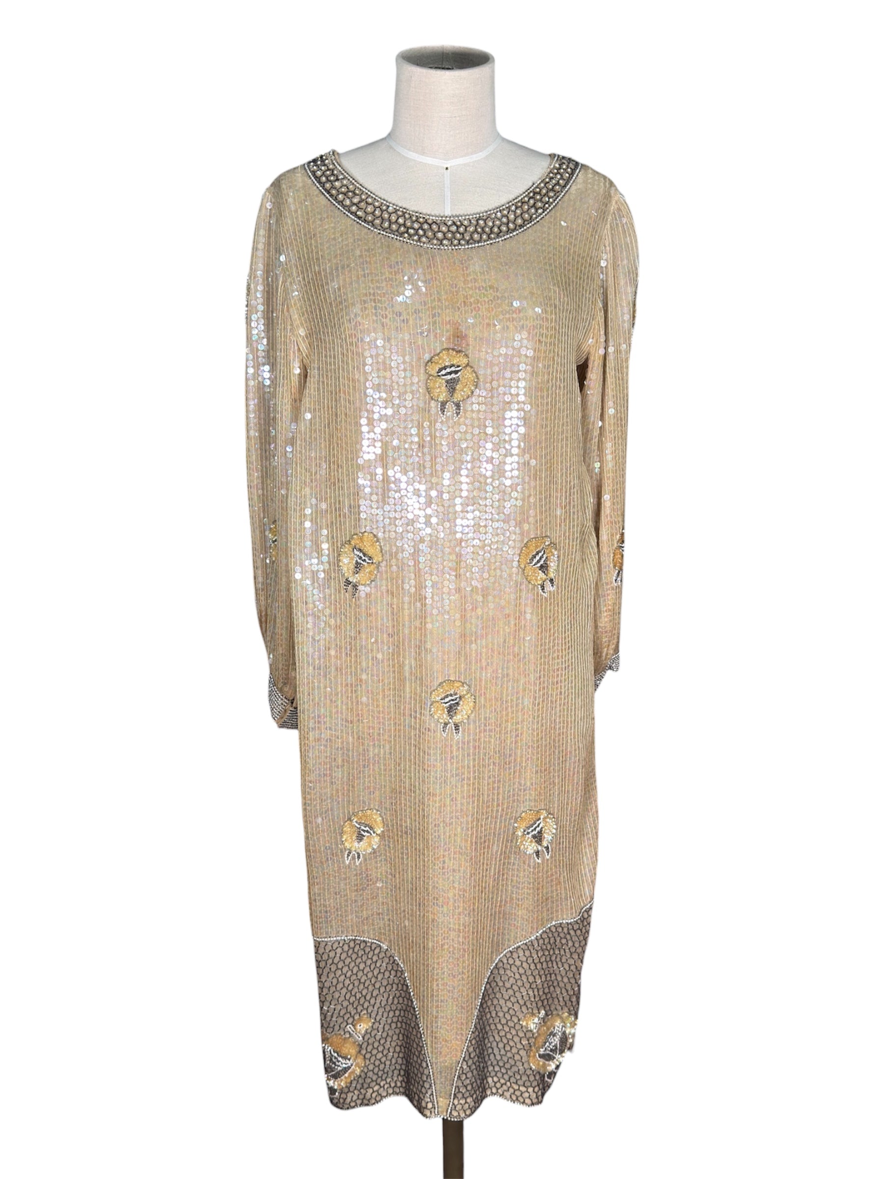 1970s ShoMax Beige Iridescent Sequined Silk Gown