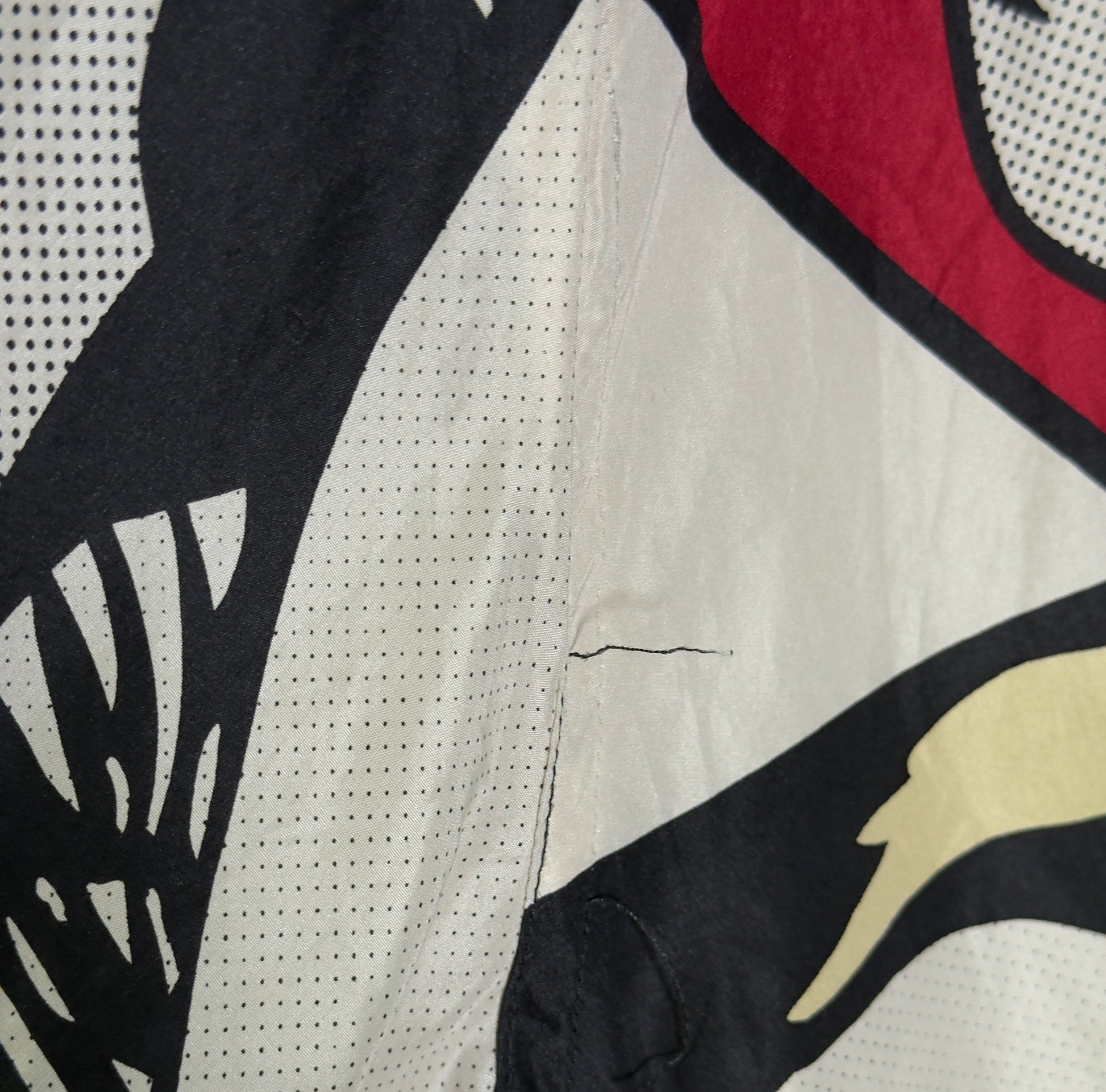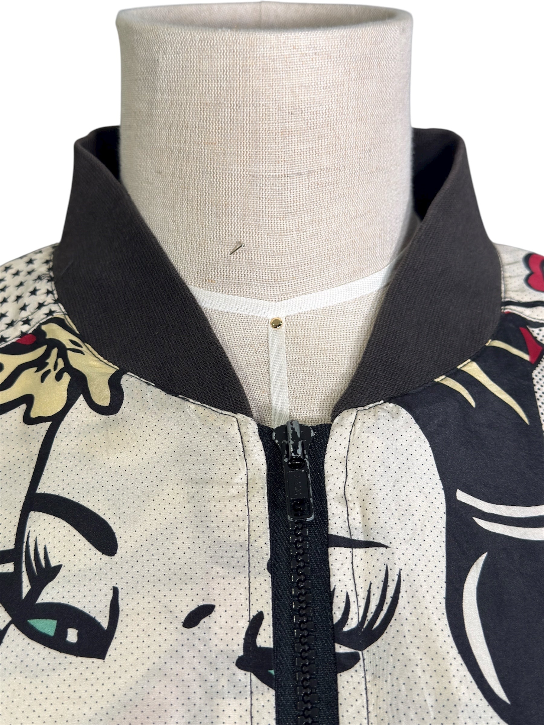 1980s/1990s Planet Silk 100% Silk bomber jacket featuring an allover pop art Lichtenstein style graphic print, zip front, ribbed collar and cuffs, and lightweight construction for a standout street look. There is no shoulder pads in this piece and there are pockets on the front of either hip. It is marked a size small, but please refer to the measurements. There is a slight condition issues with this piece, shown in the last two photos. There is some visible wear on the zipper and a few stitches coming out.