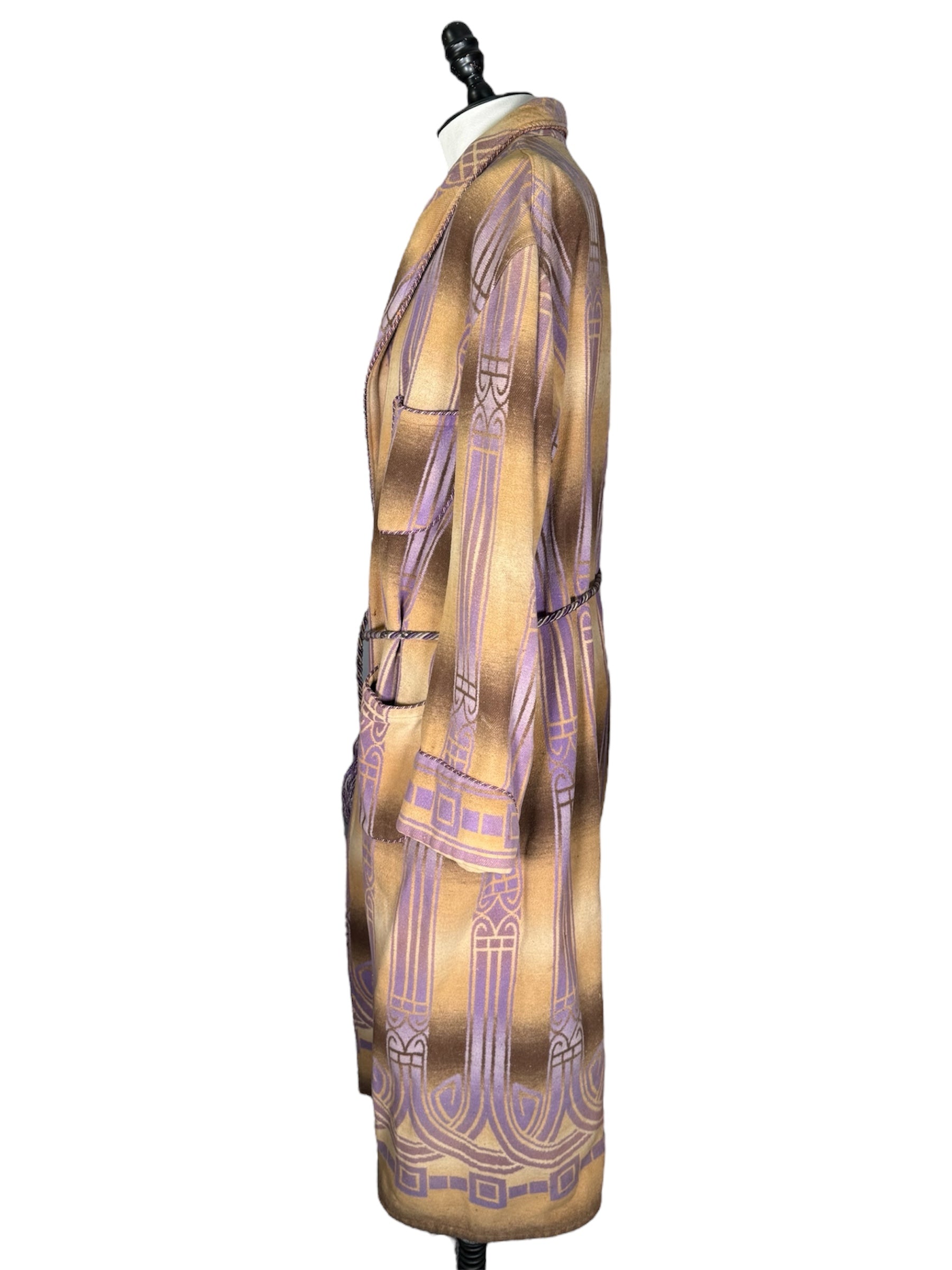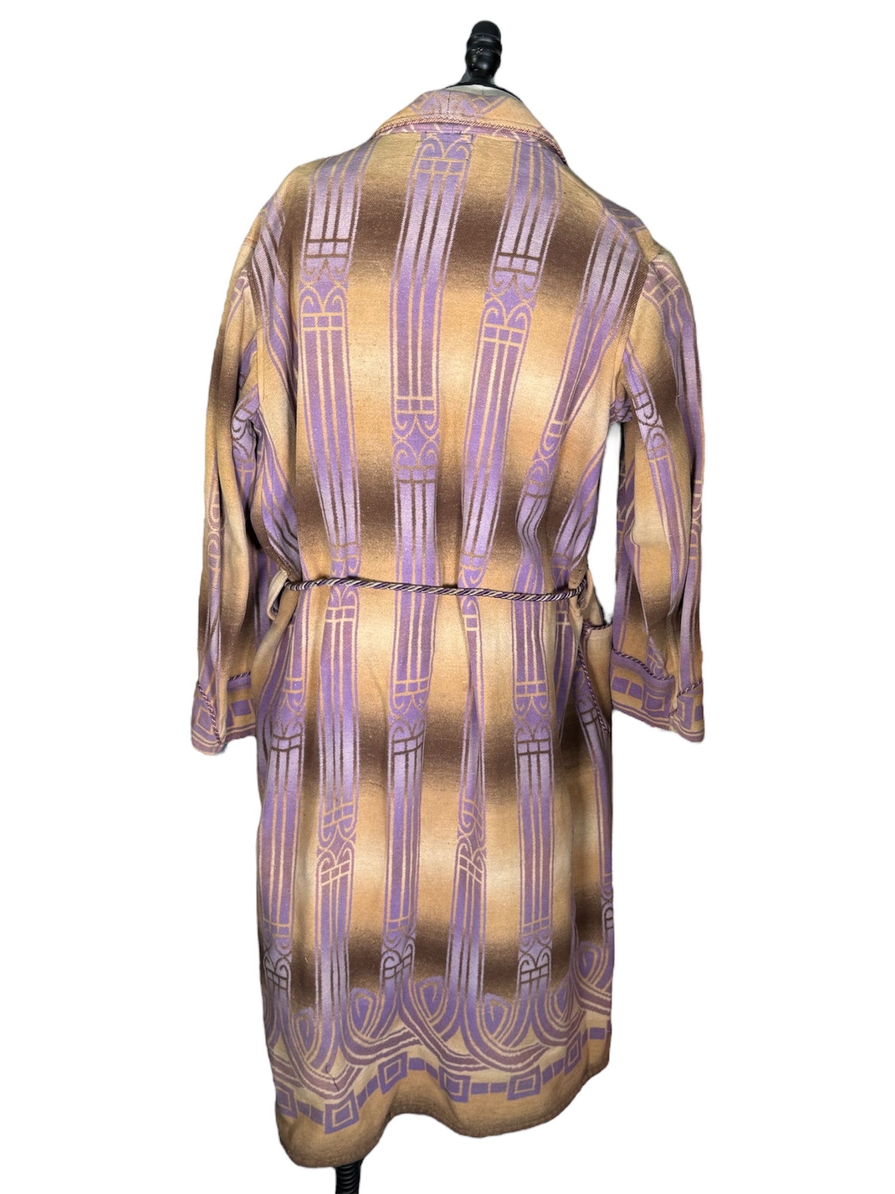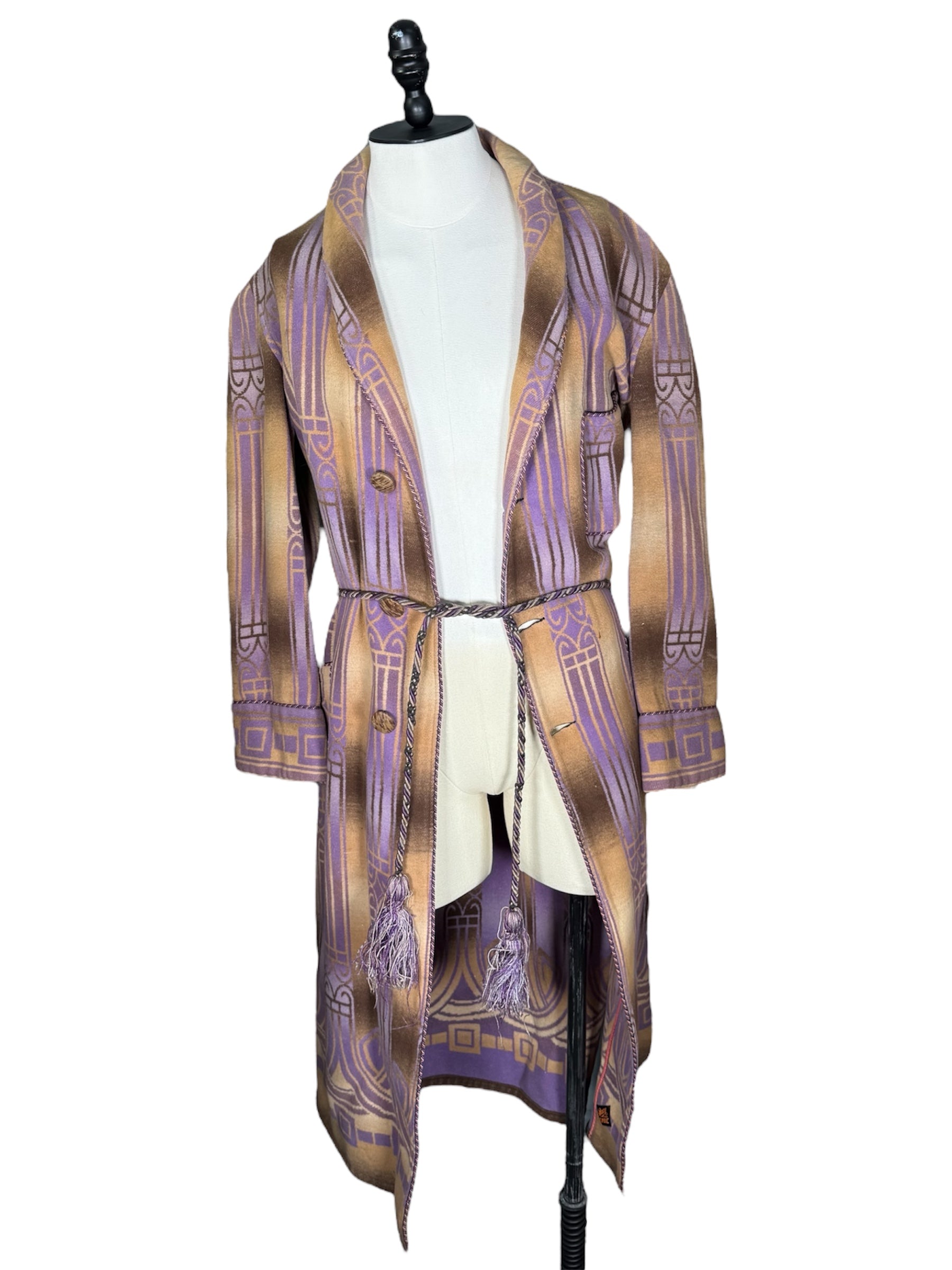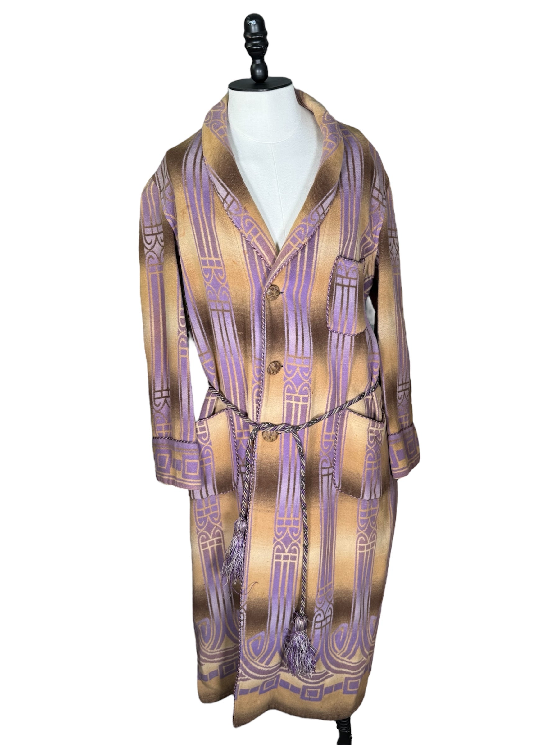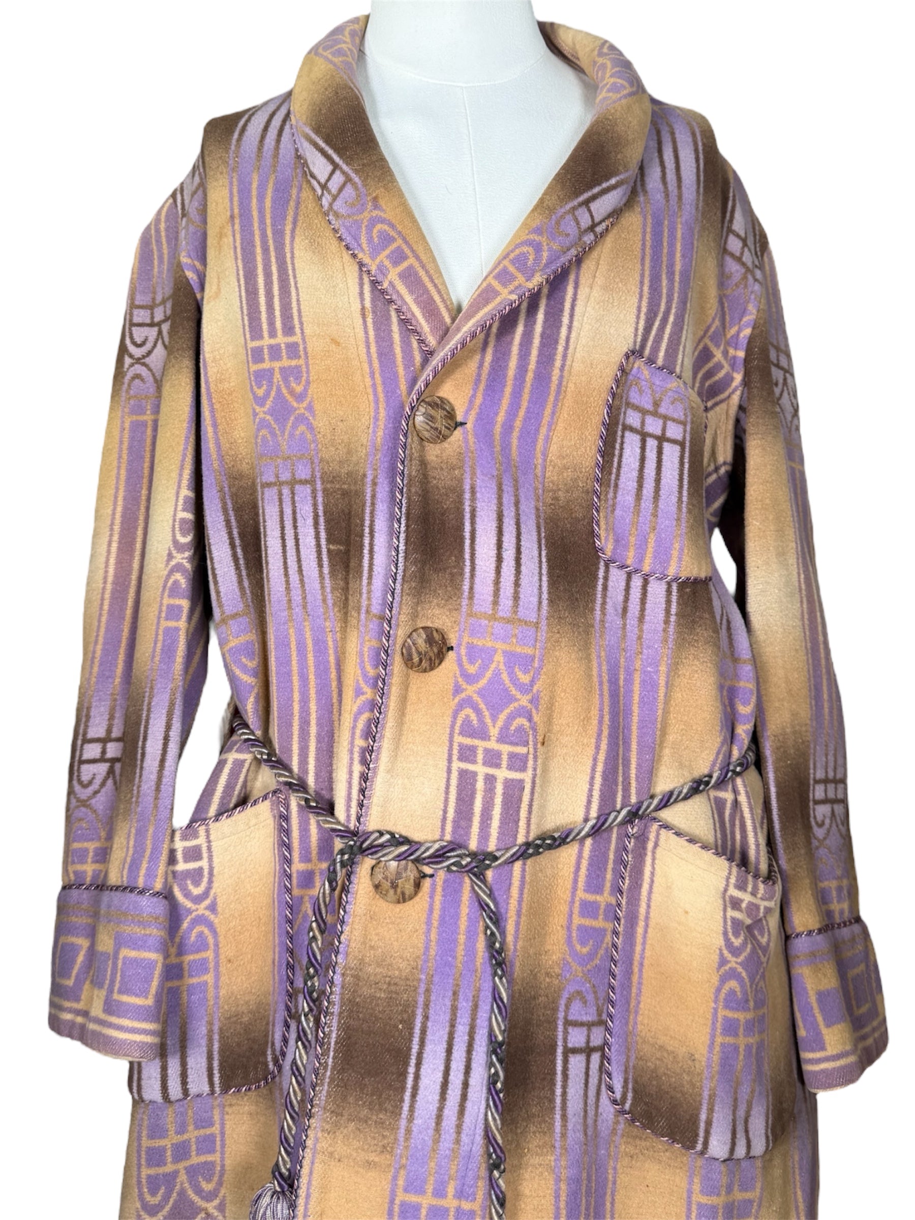 1920s Beacon Ombre by Frank's bathrobe. This Art Deco bathrobe features an ombre pattern of brown, tan, and purple colors. It has three wooden buttons that attach the bathrobe on the front, along with a possibly later addition, tassel belt. There is slight condition issues with this bathrobe, pictured in the last two photos. There is a couple of marks on the front of the chest, along with a mark on the front of the hip.