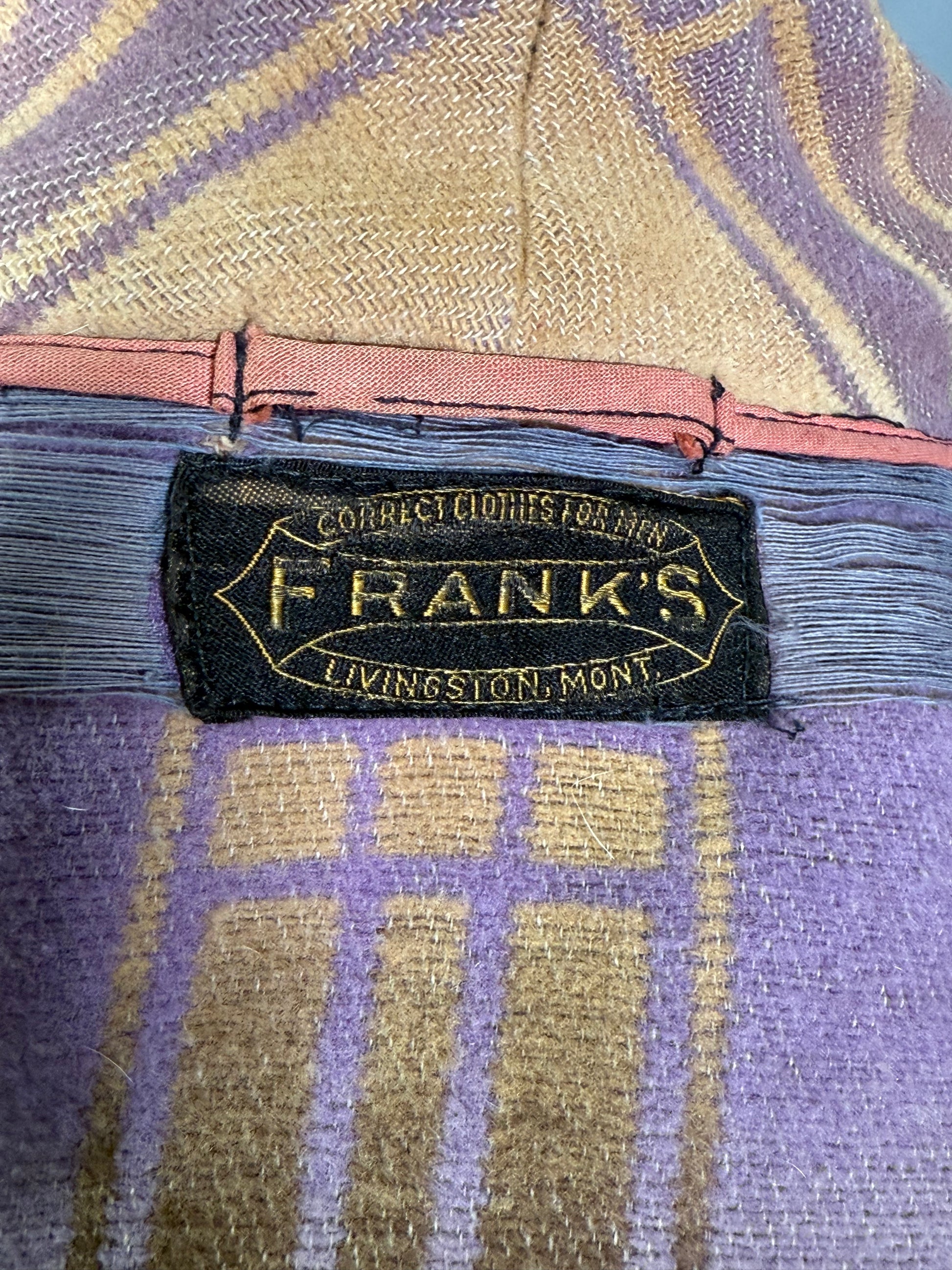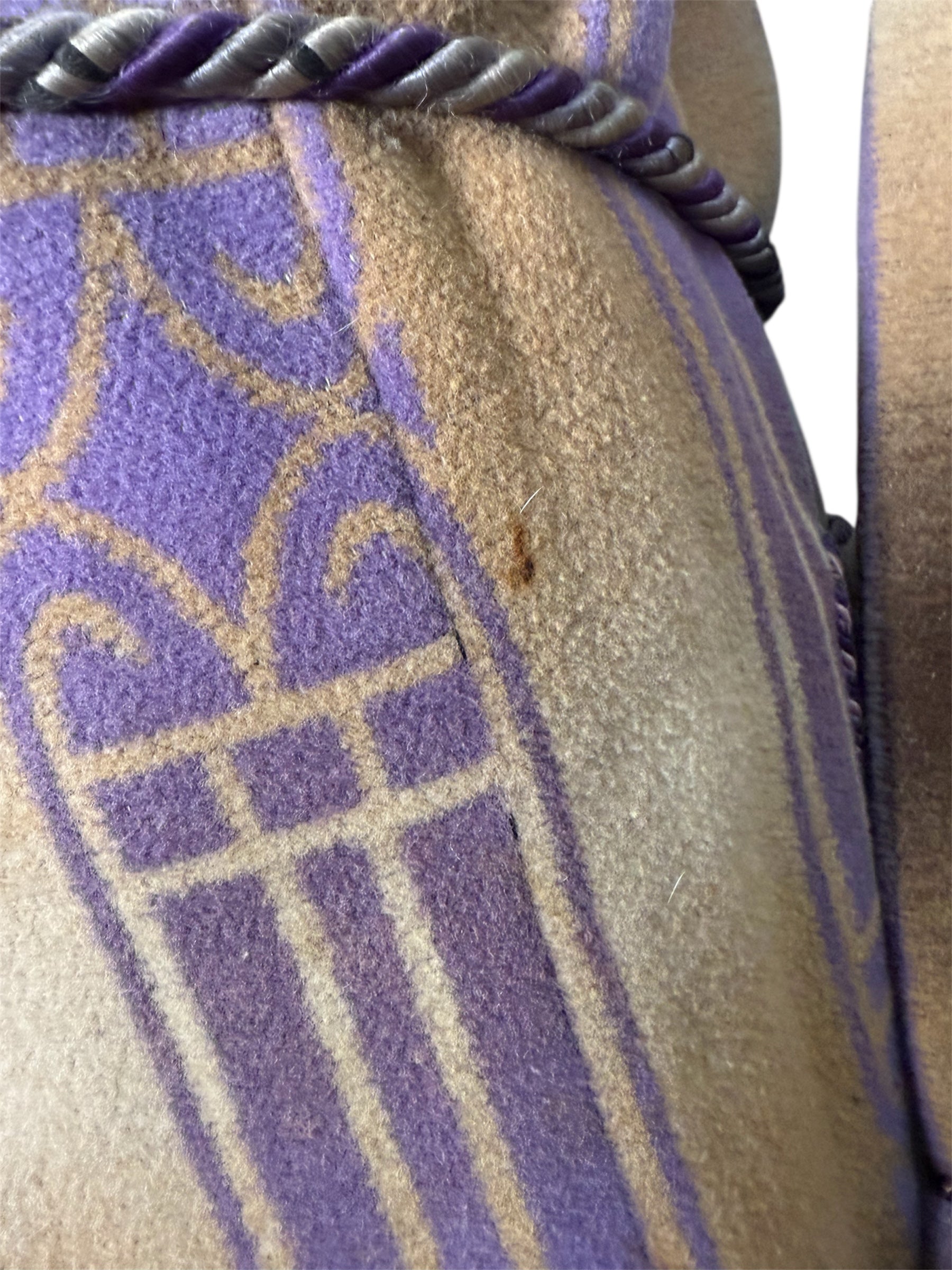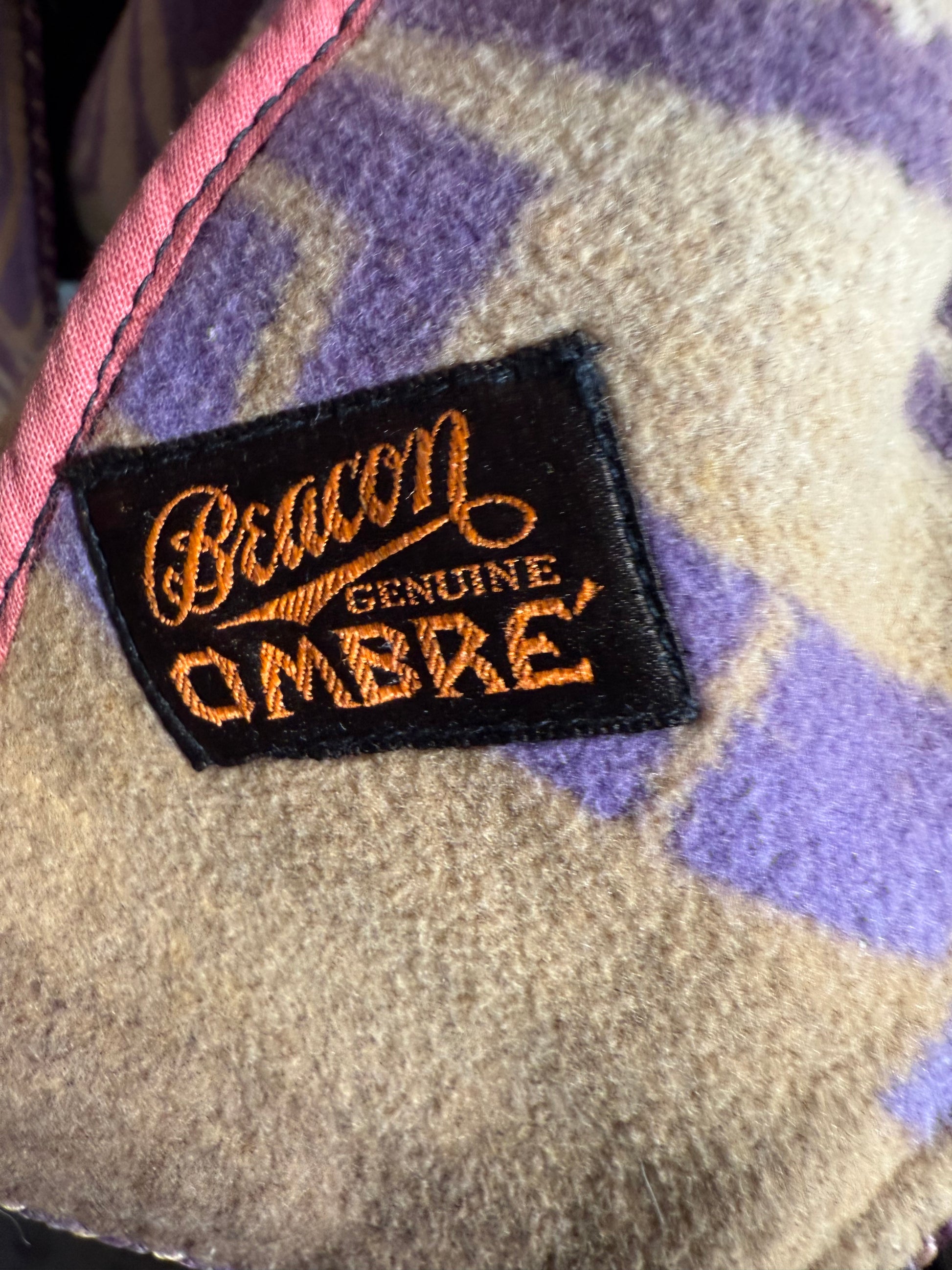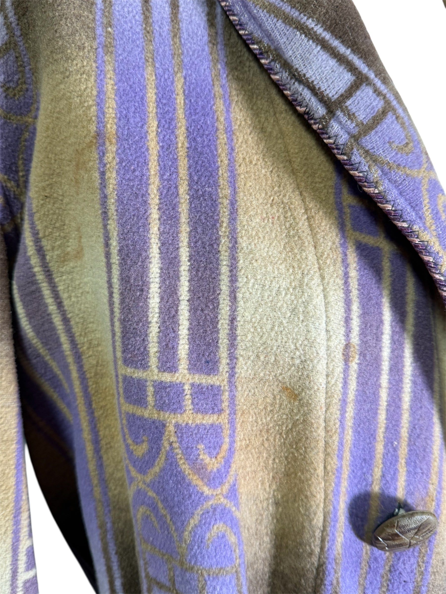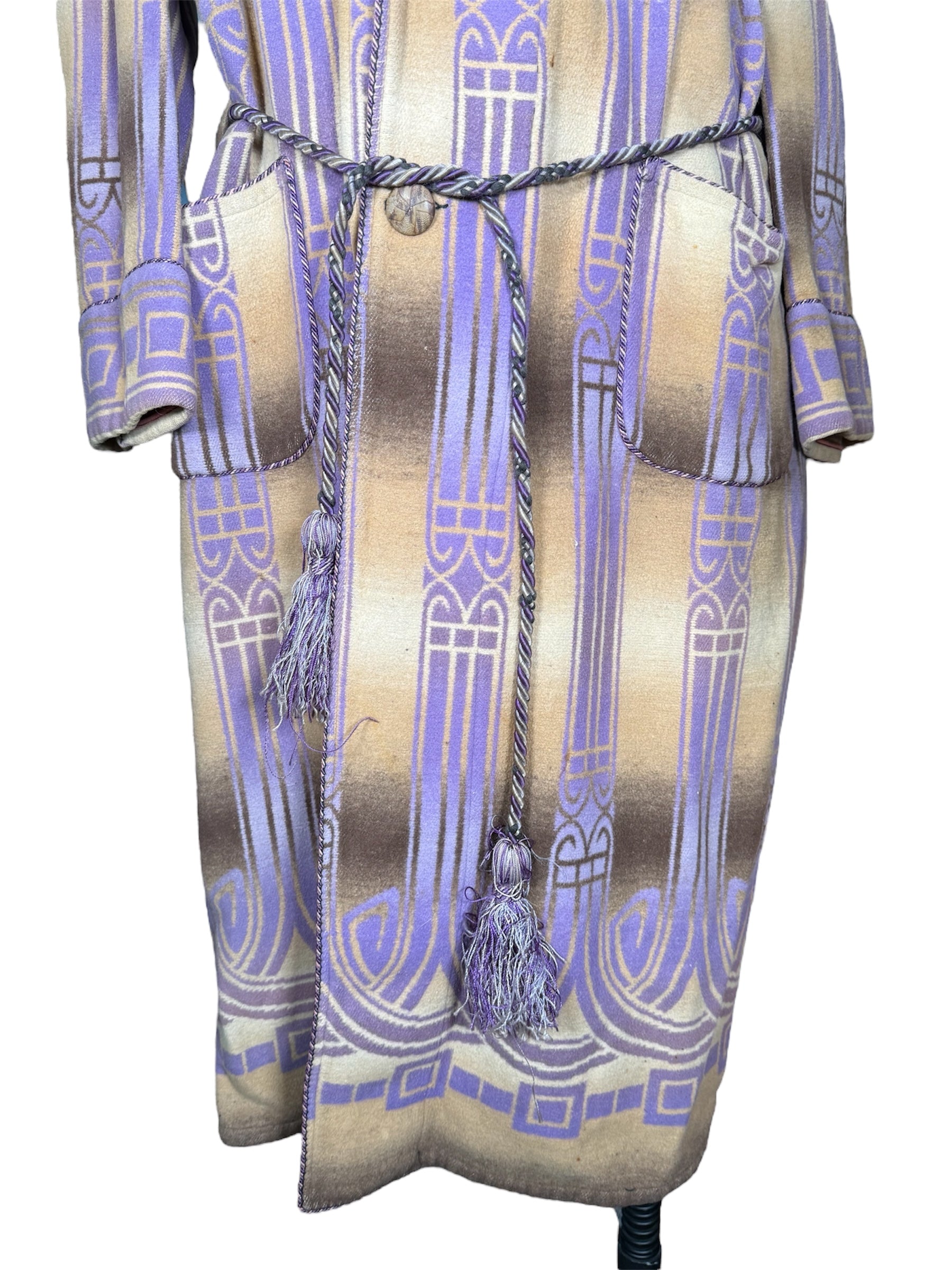 1920s Beacon Ombre by Frank's bathrobe. This Art Deco bathrobe features an ombre pattern of brown, tan, and purple colors. It has three wooden buttons that attach the bathrobe on the front, along with a possibly later addition, tassel belt. There is slight condition issues with this bathrobe, pictured in the last two photos. There is a couple of marks on the front of the chest, along with a mark on the front of the hip.
