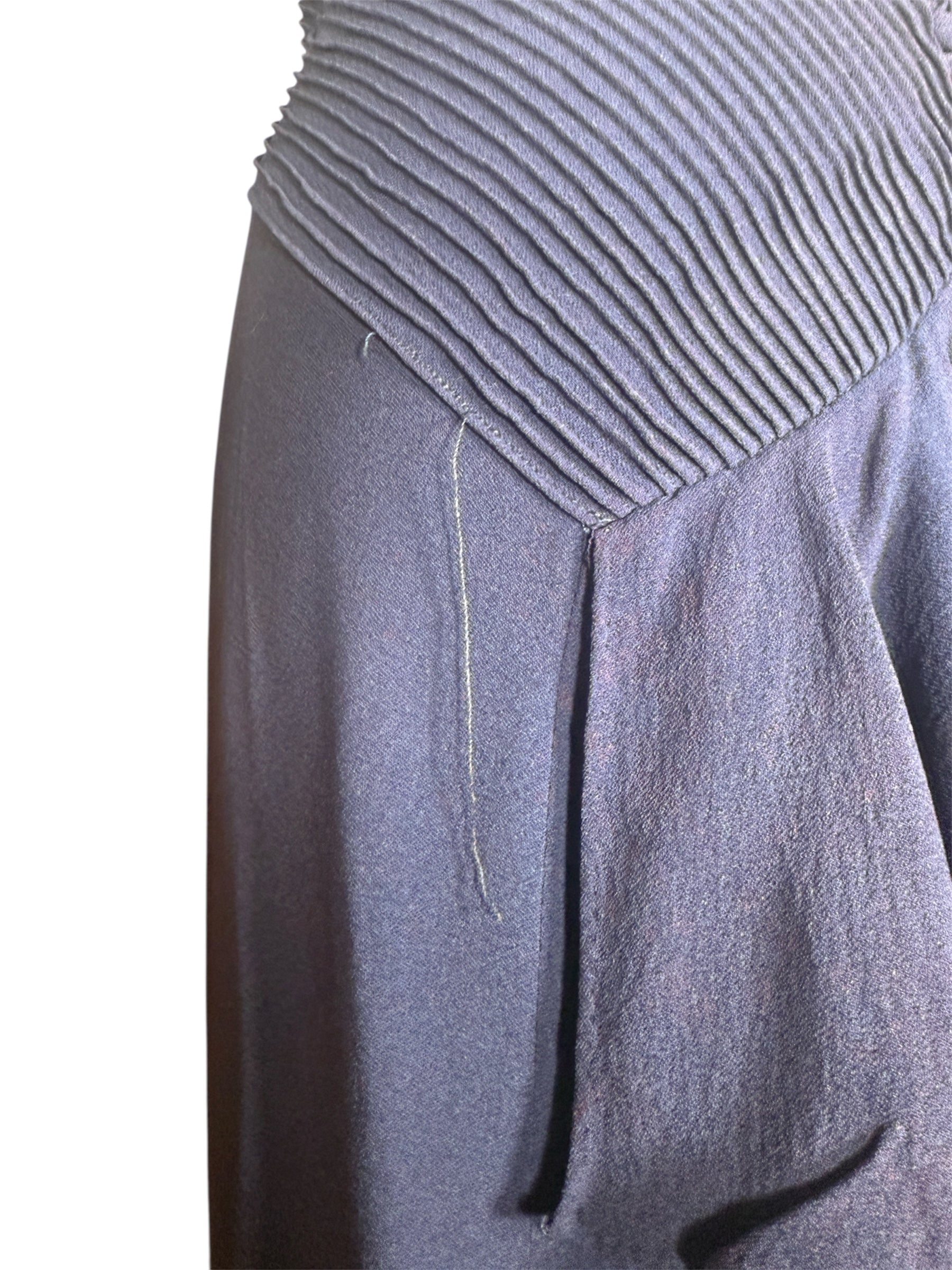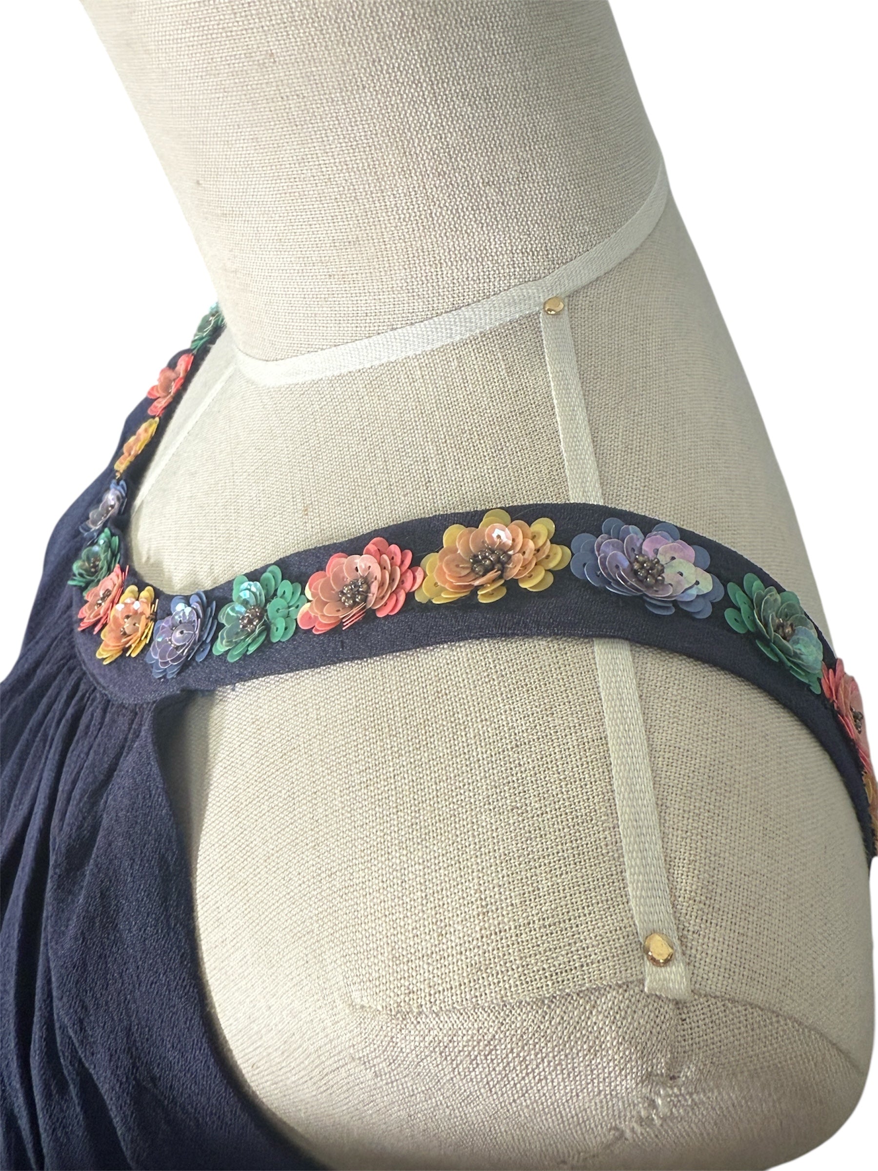 1930s unlabeled, navy gown with celluloid flowers on the straps. This full-length gown features a slit in the middle of the bust, gathered sides, multi-color celluloid flower decals, and a bustle on the back. This dress attaches at the back with fabric covered buttons. The gathering of the sides of the dress and the flow-y bust allow for multiple sizes to comfortably wear this piece. There is a slight condition issue with this piece, pictured in the last photo. There is a few loose strings that need to be trimmed.