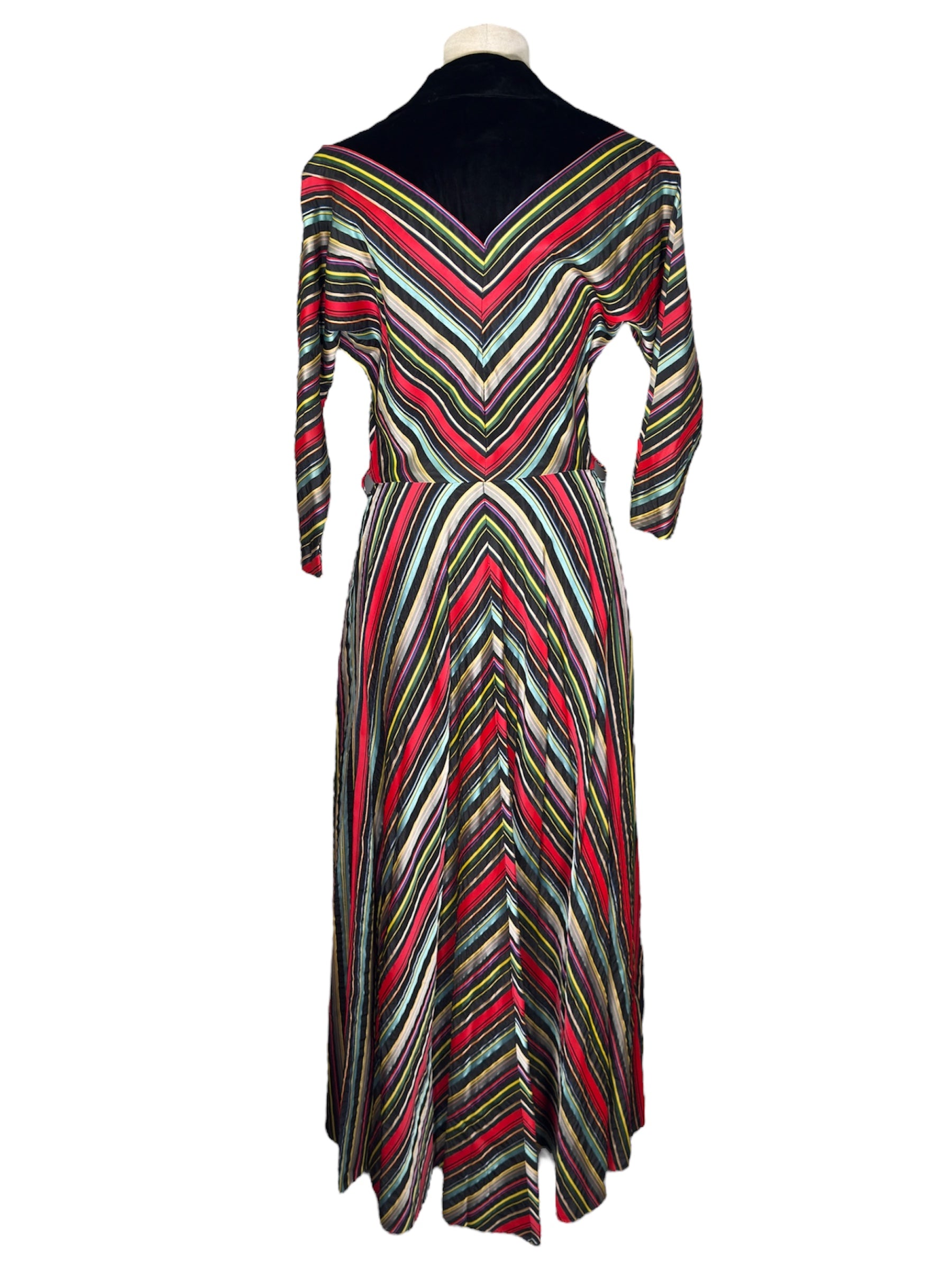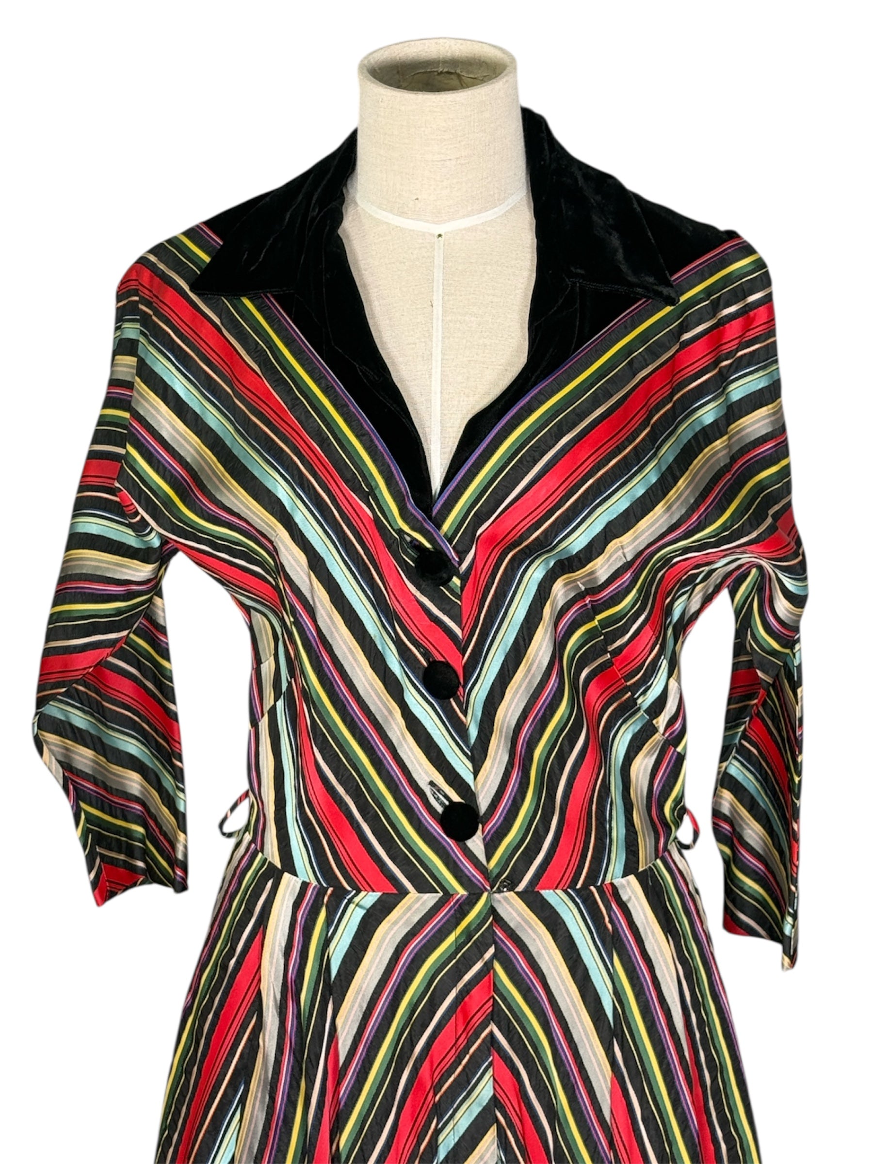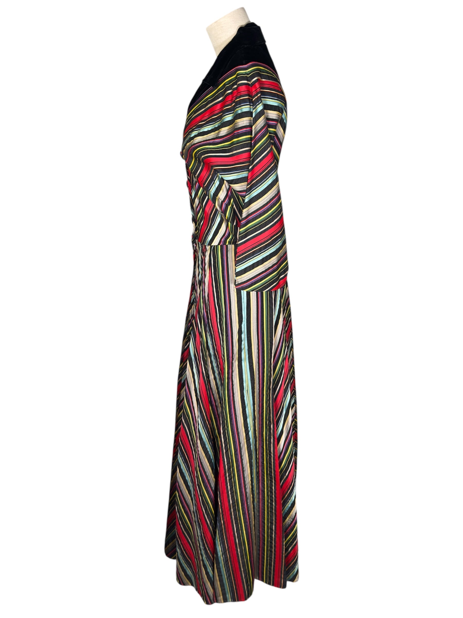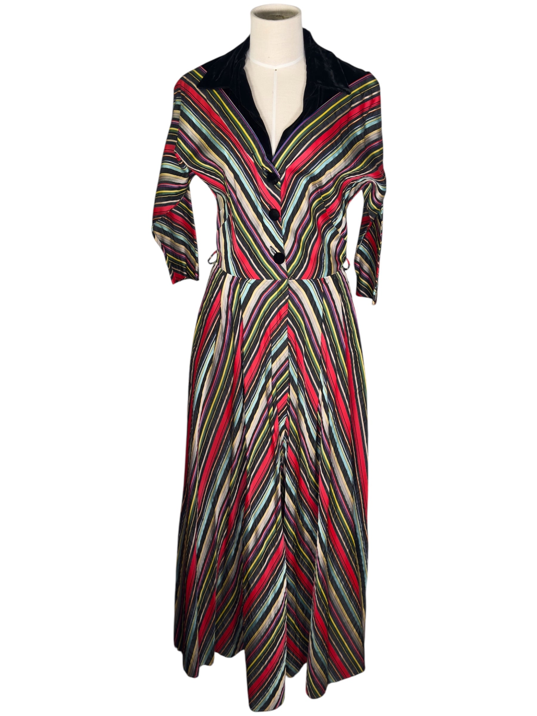 1940s/1950s Maxan hostess gown. This candy-striped dress features mostly red, black, orange, and blue colors. The gown has a wide collar and fabric covered buttons, along with three-fourth dolman sleeves. There are also fairly hidden pockets on the side of either hip. Unfortunately, the dress is missing the belt but has intact belt loops if you would like to add your own. This full-length gown attaches at the front with three buttons and a hidden zipper in the front of the skirt. There are no visible condition issues with this piece.