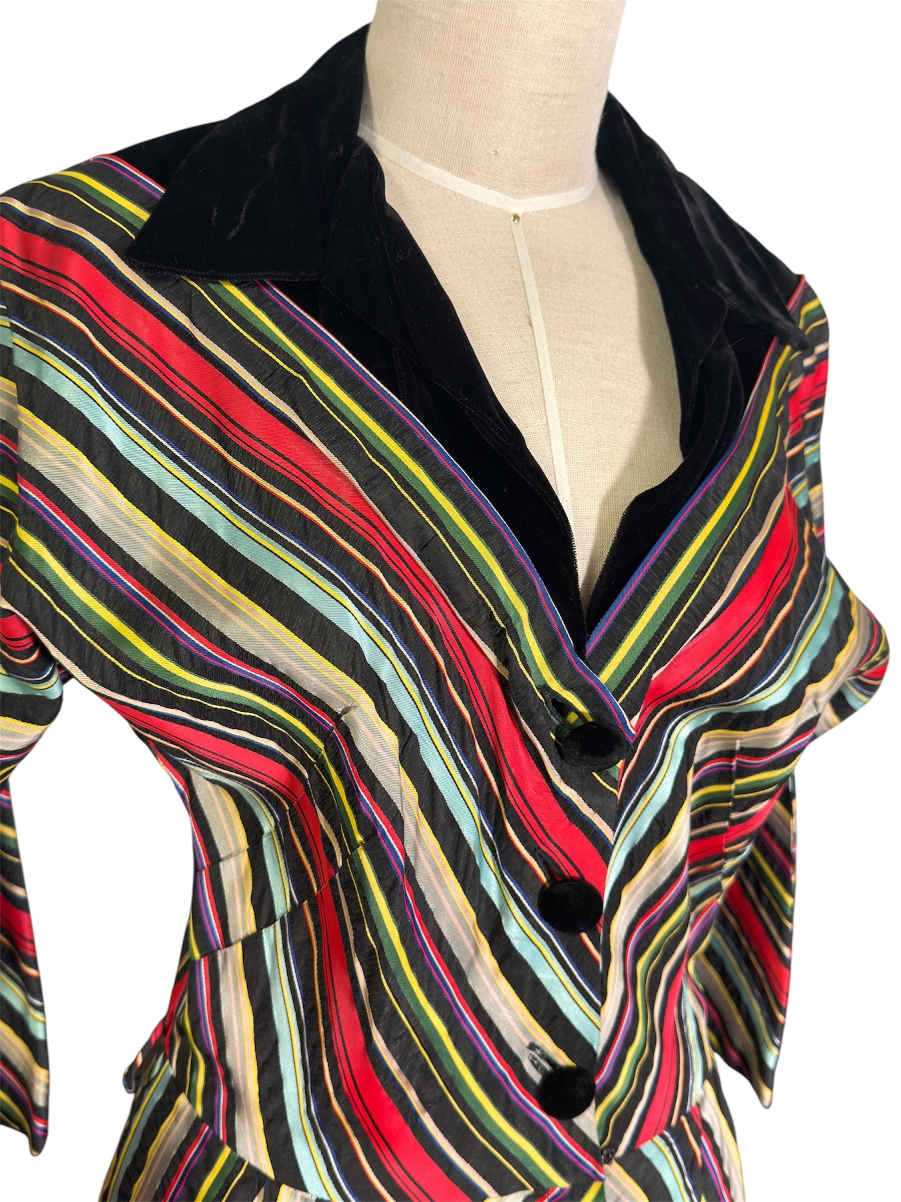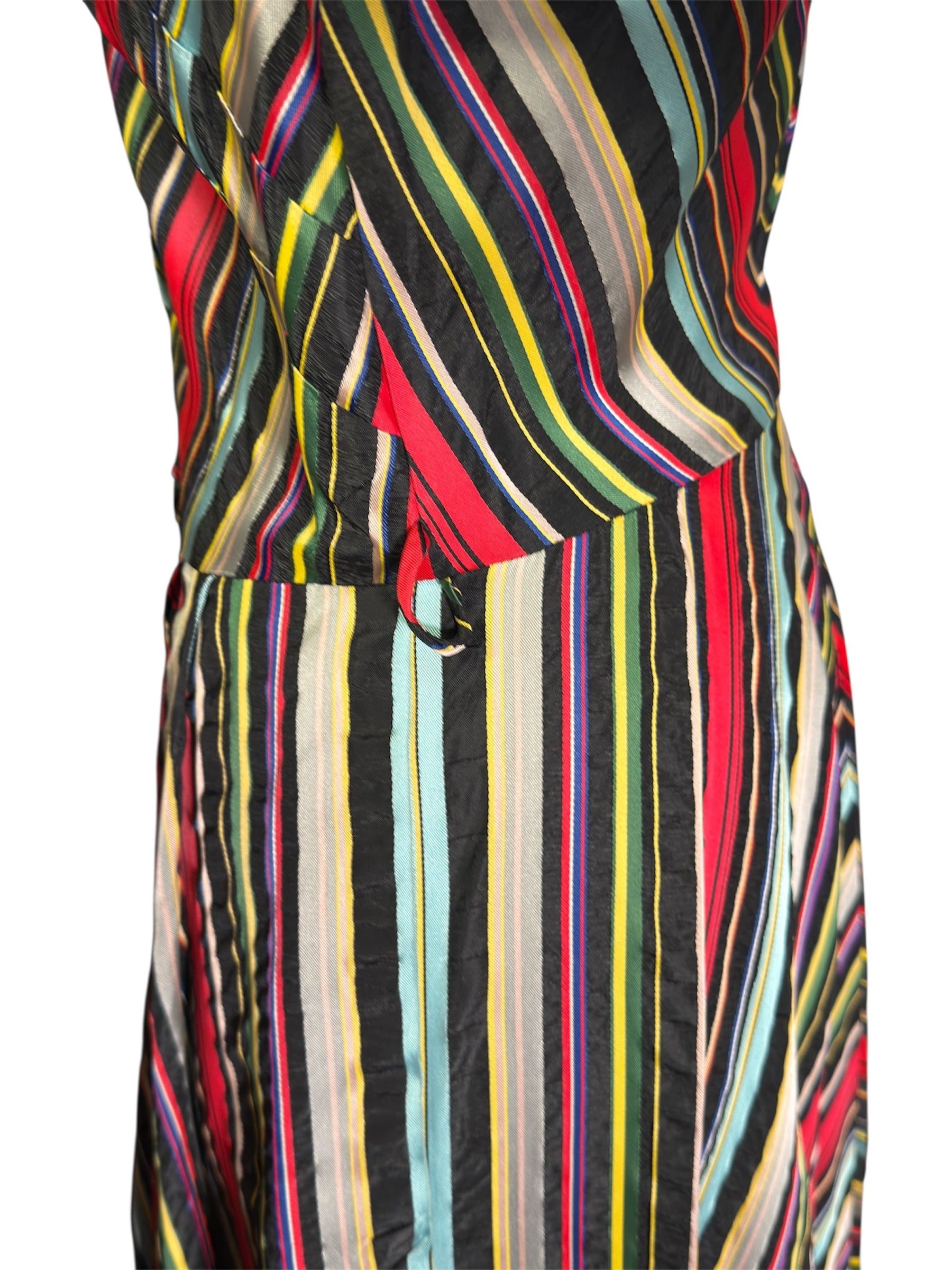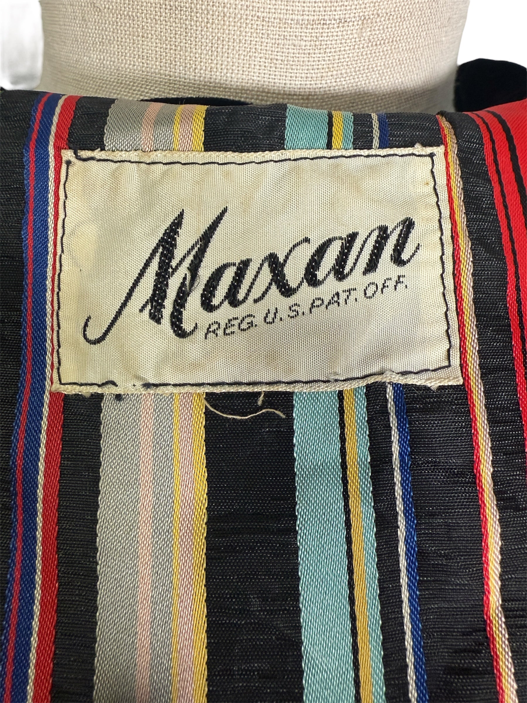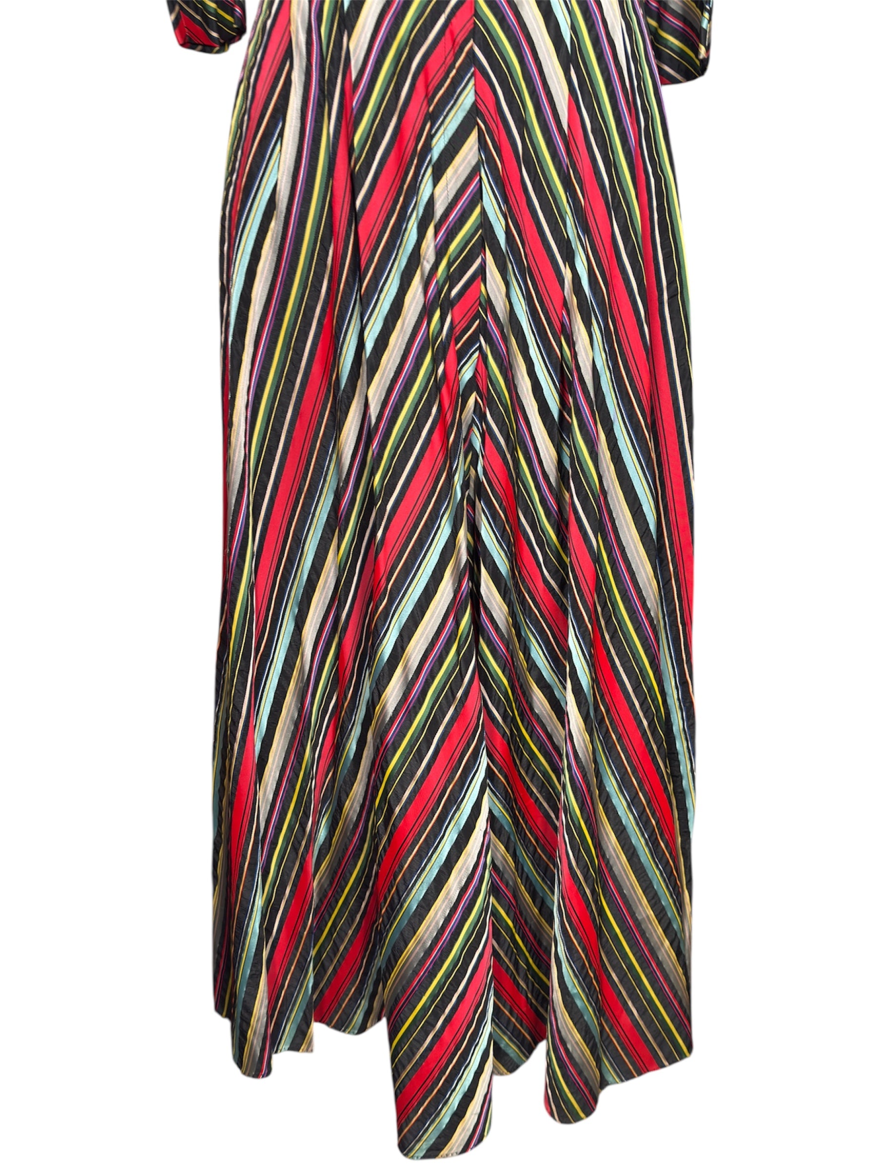 1940s/1950s Maxan hostess gown. This candy-striped dress features mostly red, black, orange, and blue colors. The gown has a wide collar and fabric covered buttons, along with three-fourth dolman sleeves. There are also fairly hidden pockets on the side of either hip. Unfortunately, the dress is missing the belt but has intact belt loops if you would like to add your own. This full-length gown attaches at the front with three buttons and a hidden zipper in the front of the skirt. There are no visible condition issues with this piece.