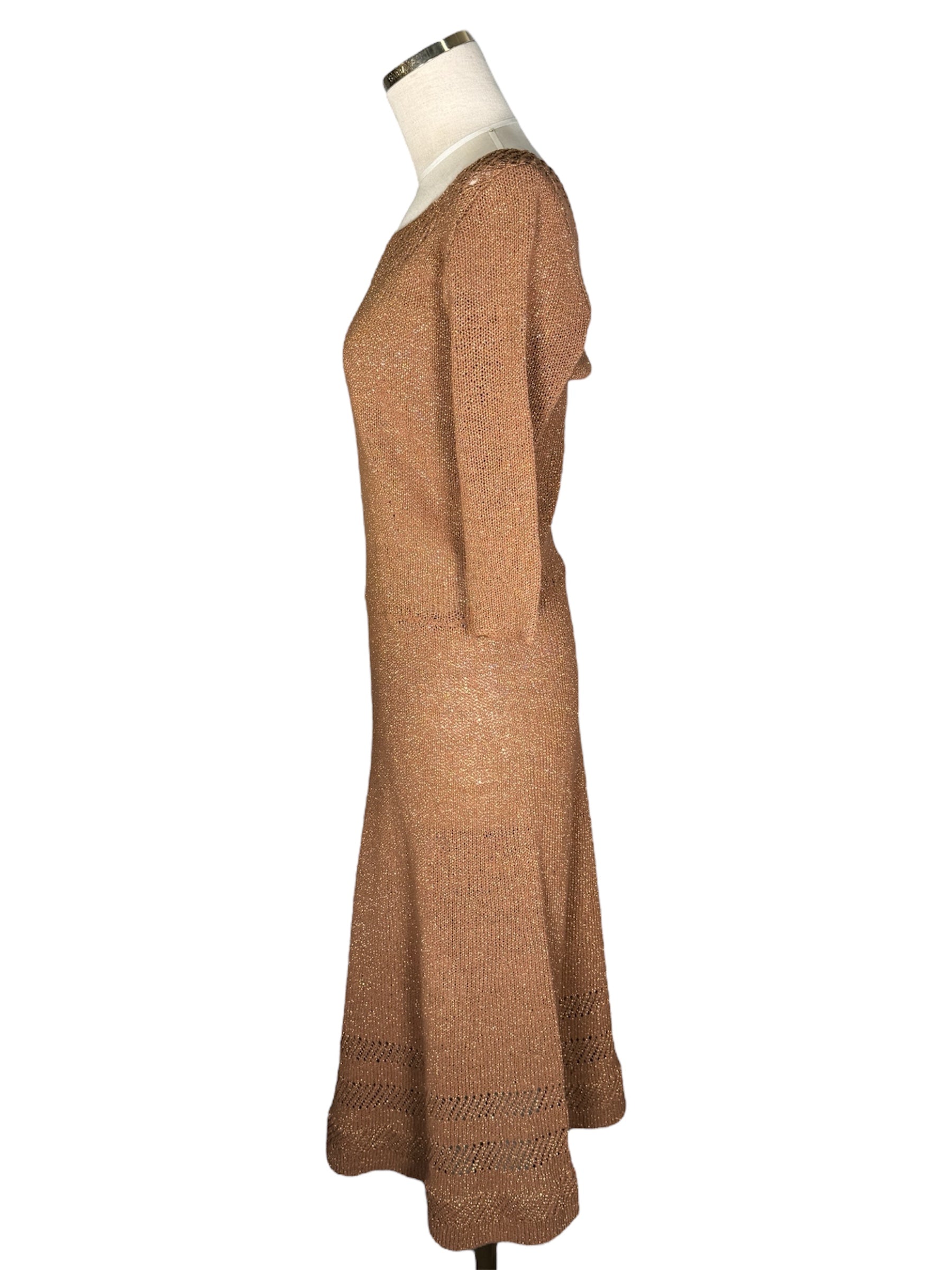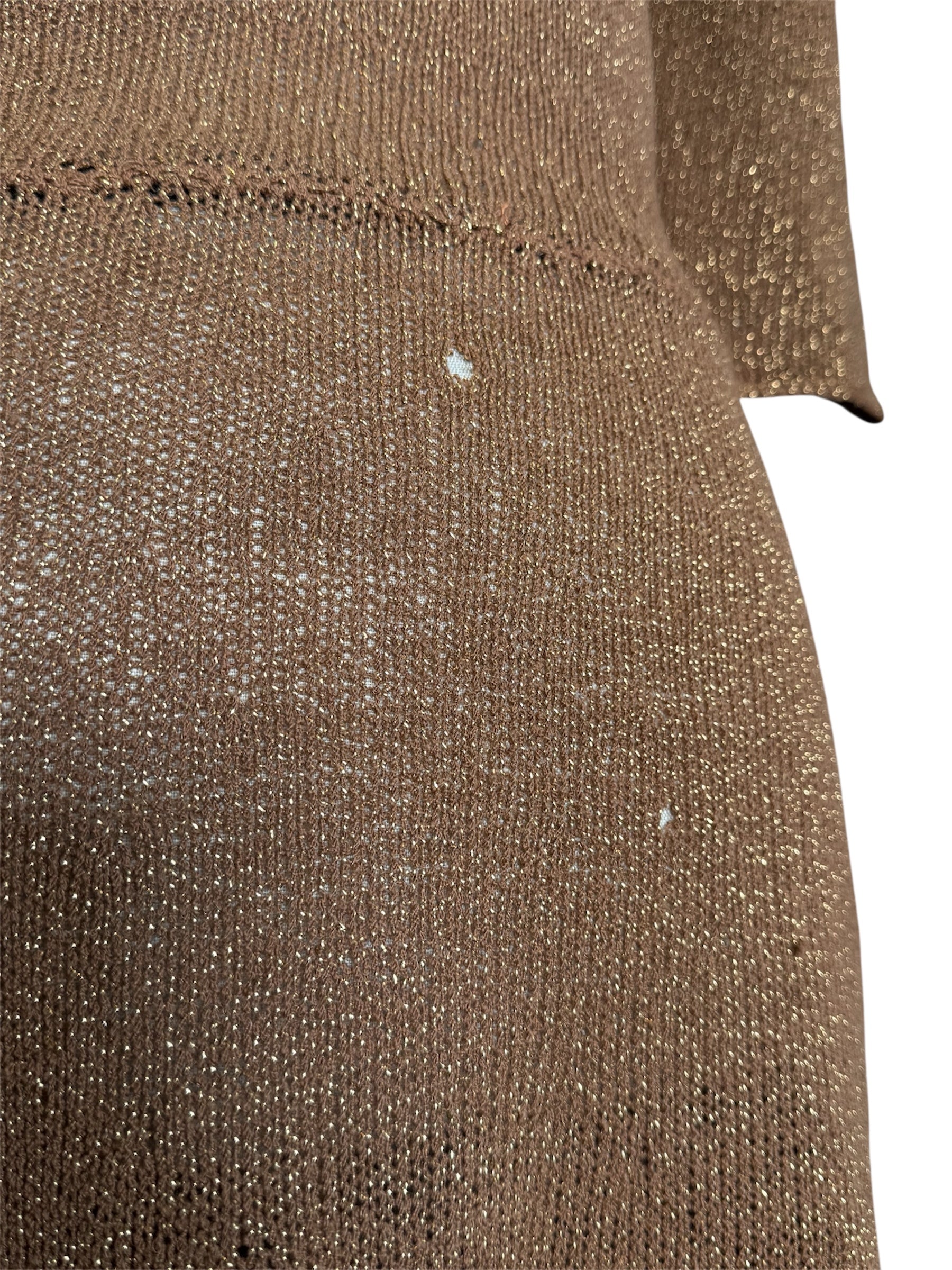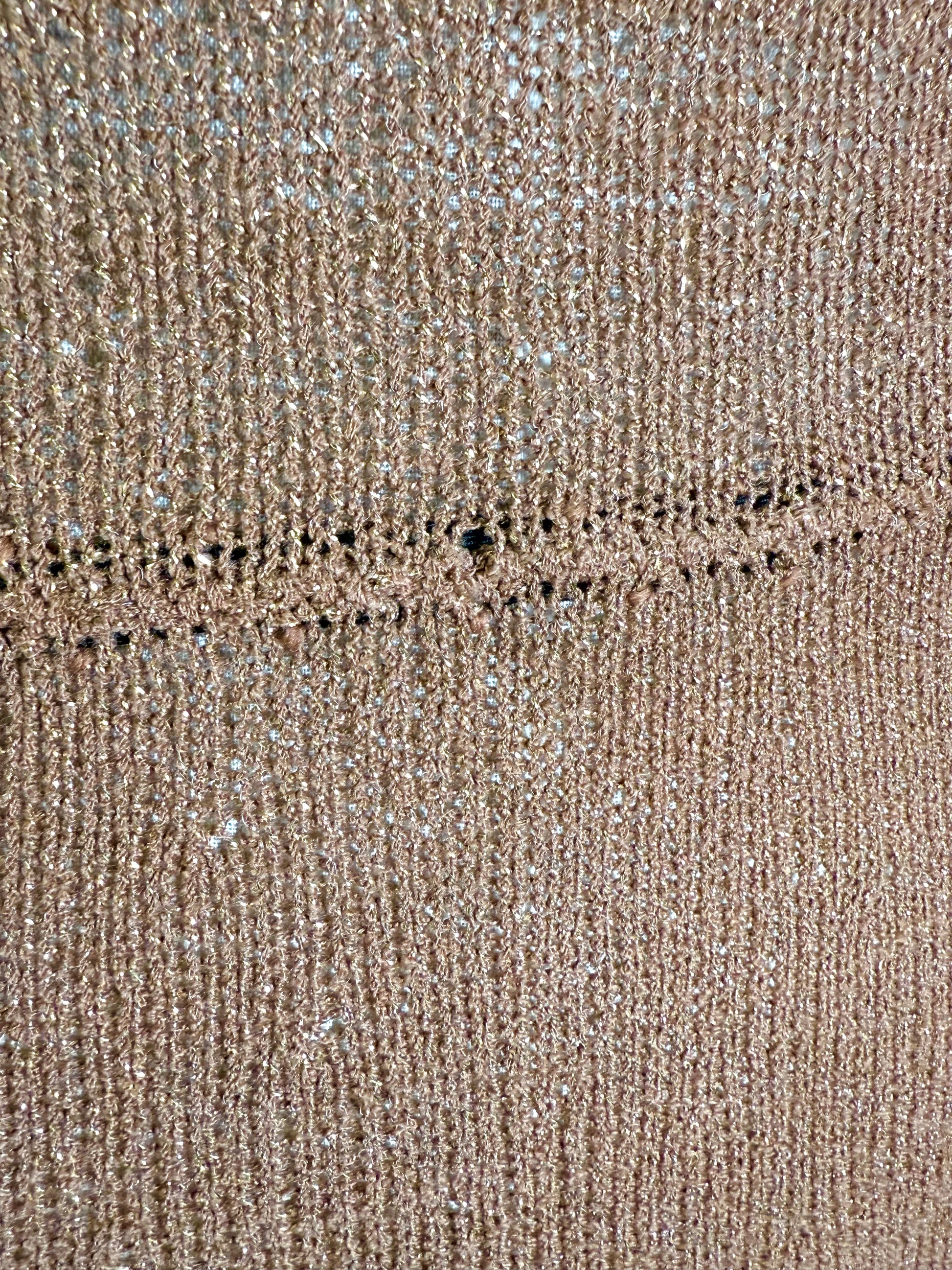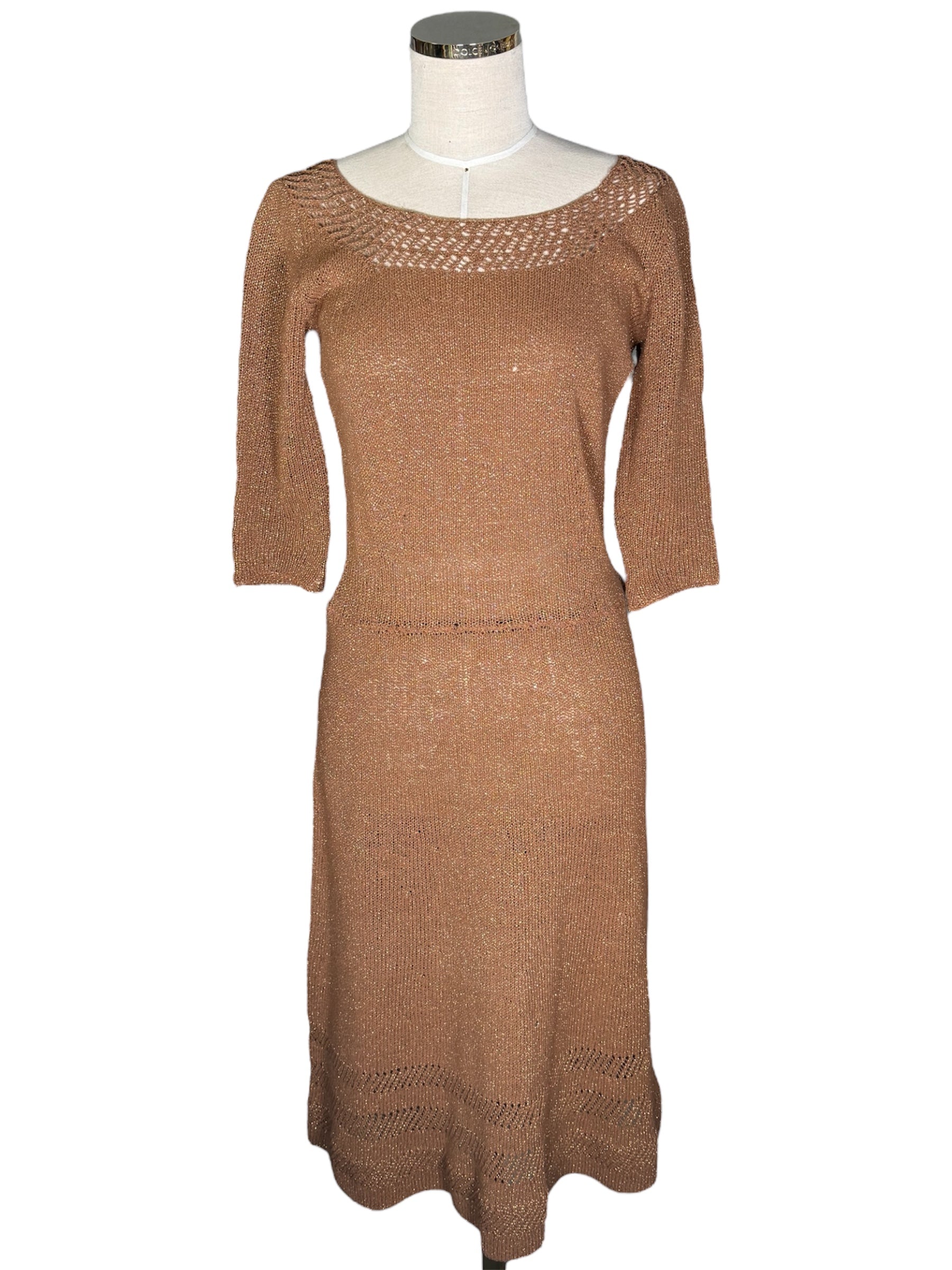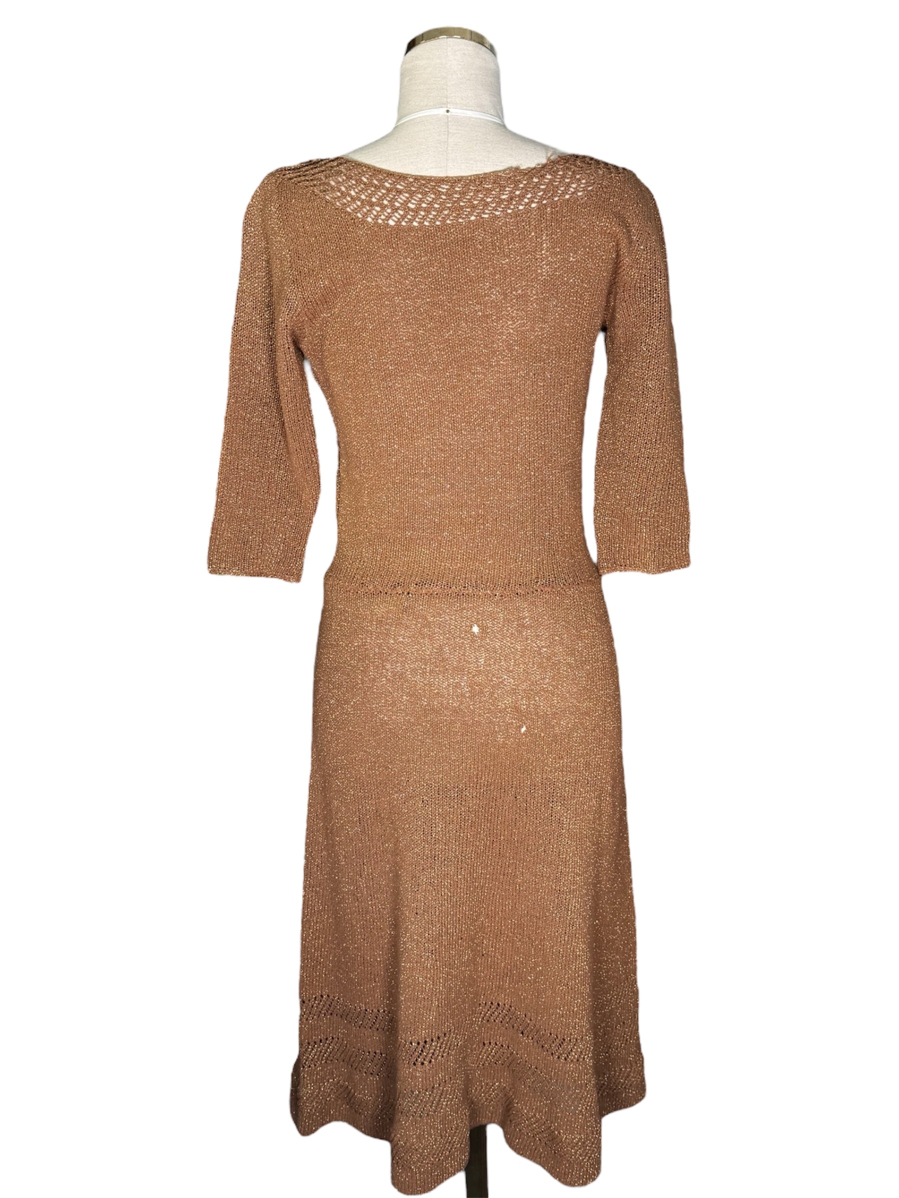 1950s metallic, knit dress. This bronze dress features a rounded neckline, is mid-length, has three-fourths sleeves, and has wider, knit detailing on the neckline and bottom of the dress. There are no fastenings in this dress. The material of this dress is quite stretchy. There are some condition issues with this dress, shown in the last five photos. There are a few small holes in the fabric, and there is a slight tear on the neckline.