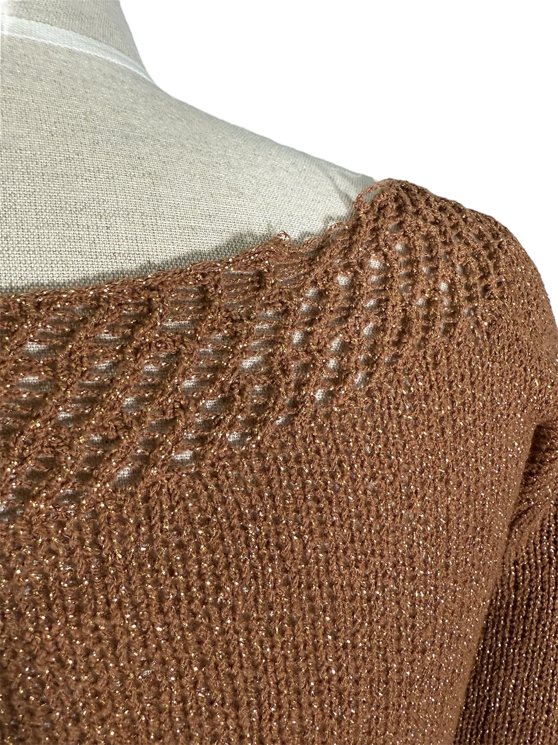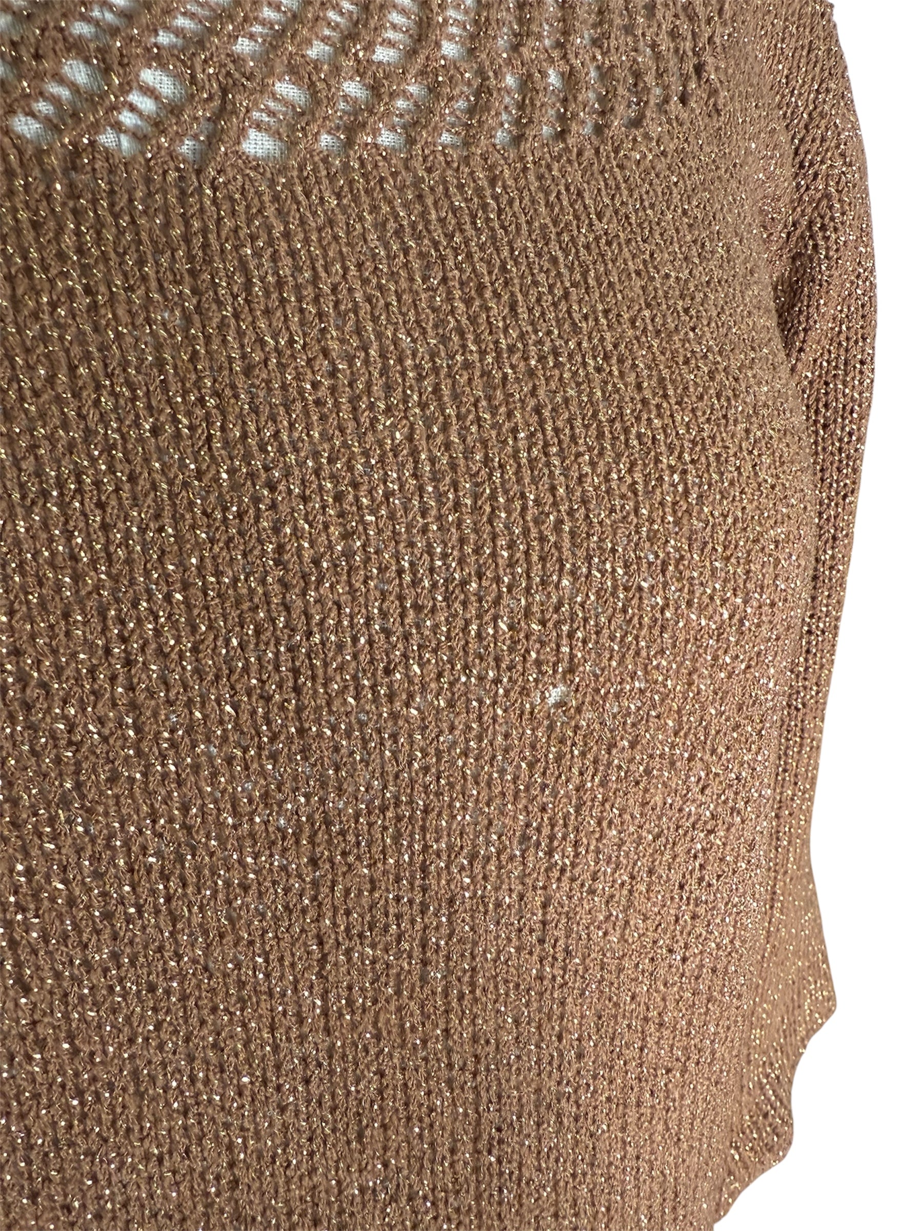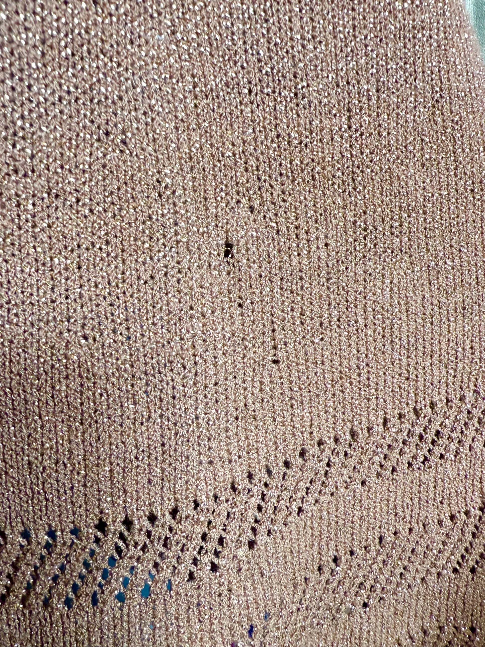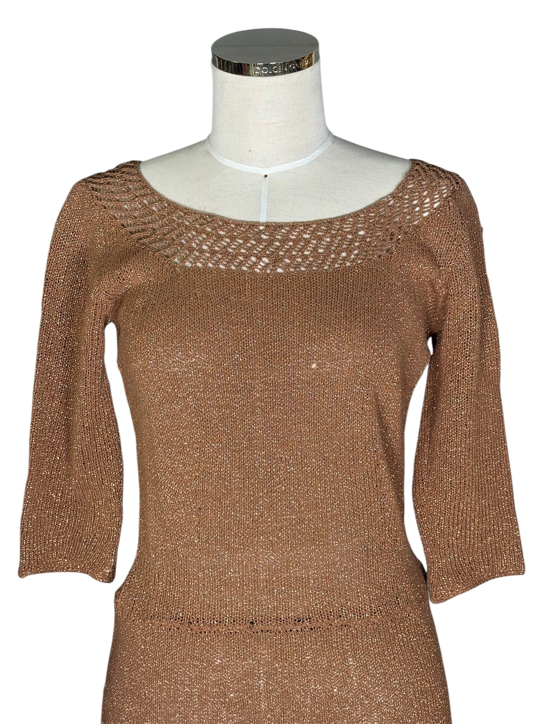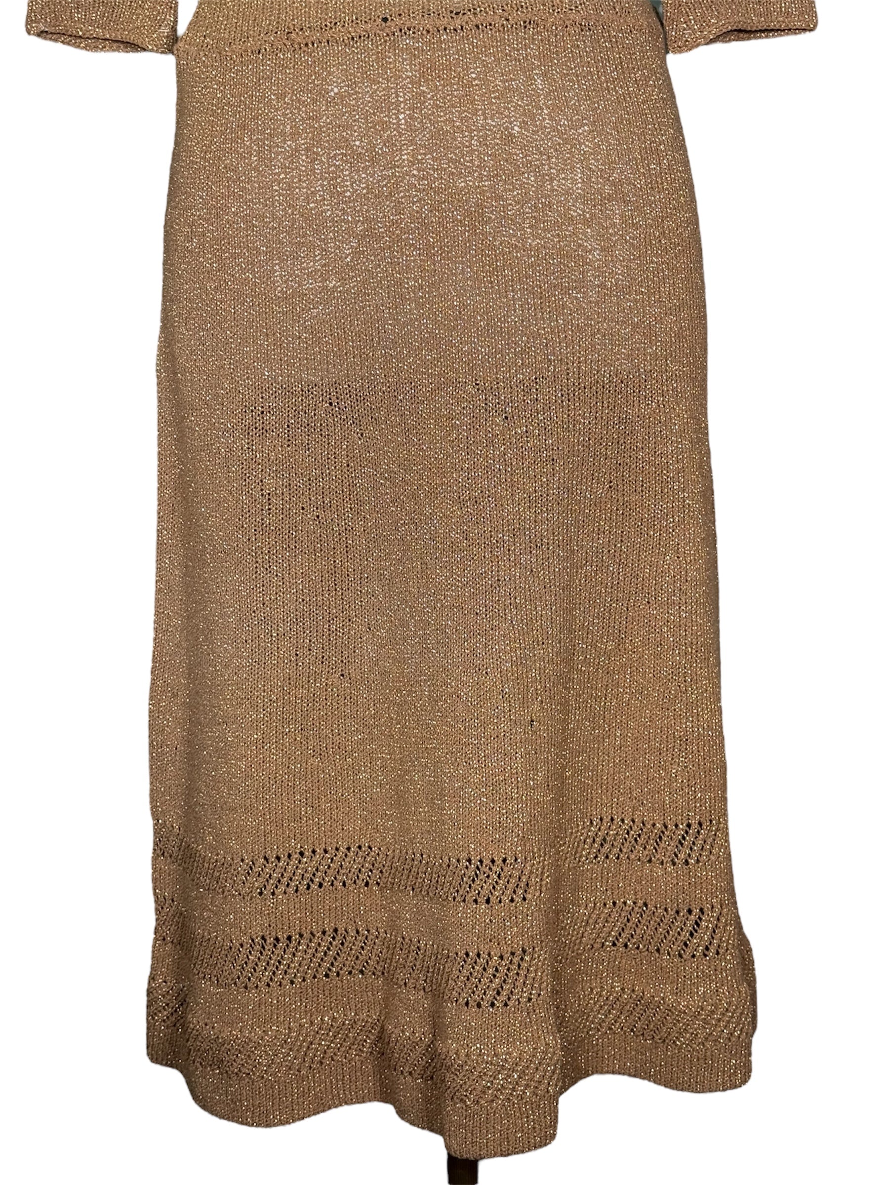 1950s metallic, knit dress. This bronze dress features a rounded neckline, is mid-length, has three-fourths sleeves, and has wider, knit detailing on the neckline and bottom of the dress. There are no fastenings in this dress. The material of this dress is quite stretchy. There are some condition issues with this dress, shown in the last five photos. There are a few small holes in the fabric, and there is a slight tear on the neckline.