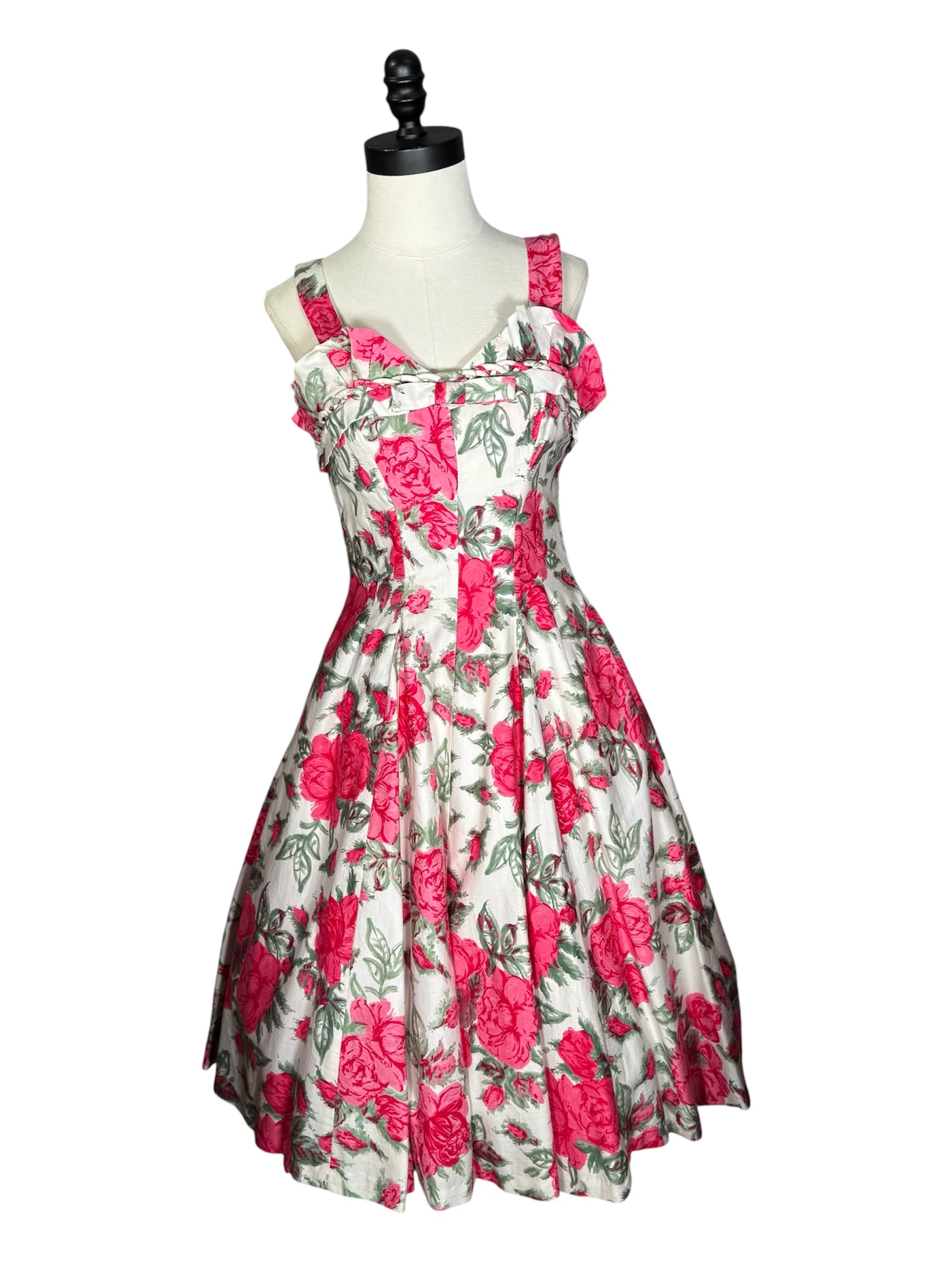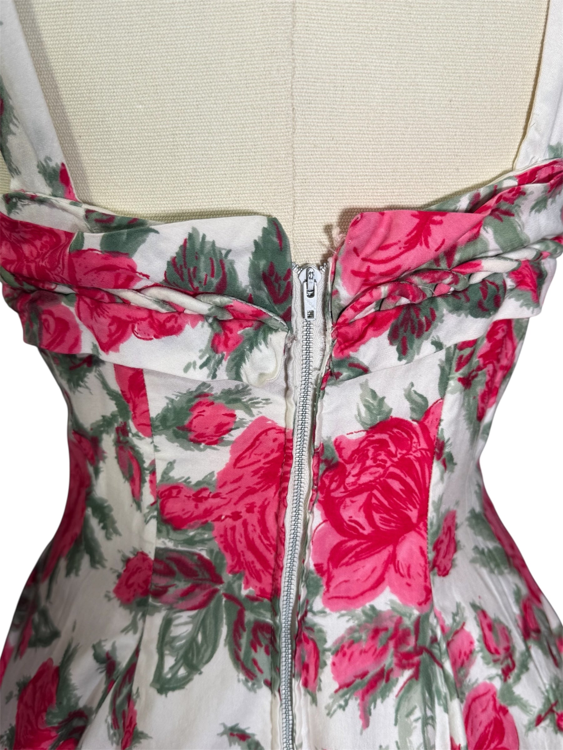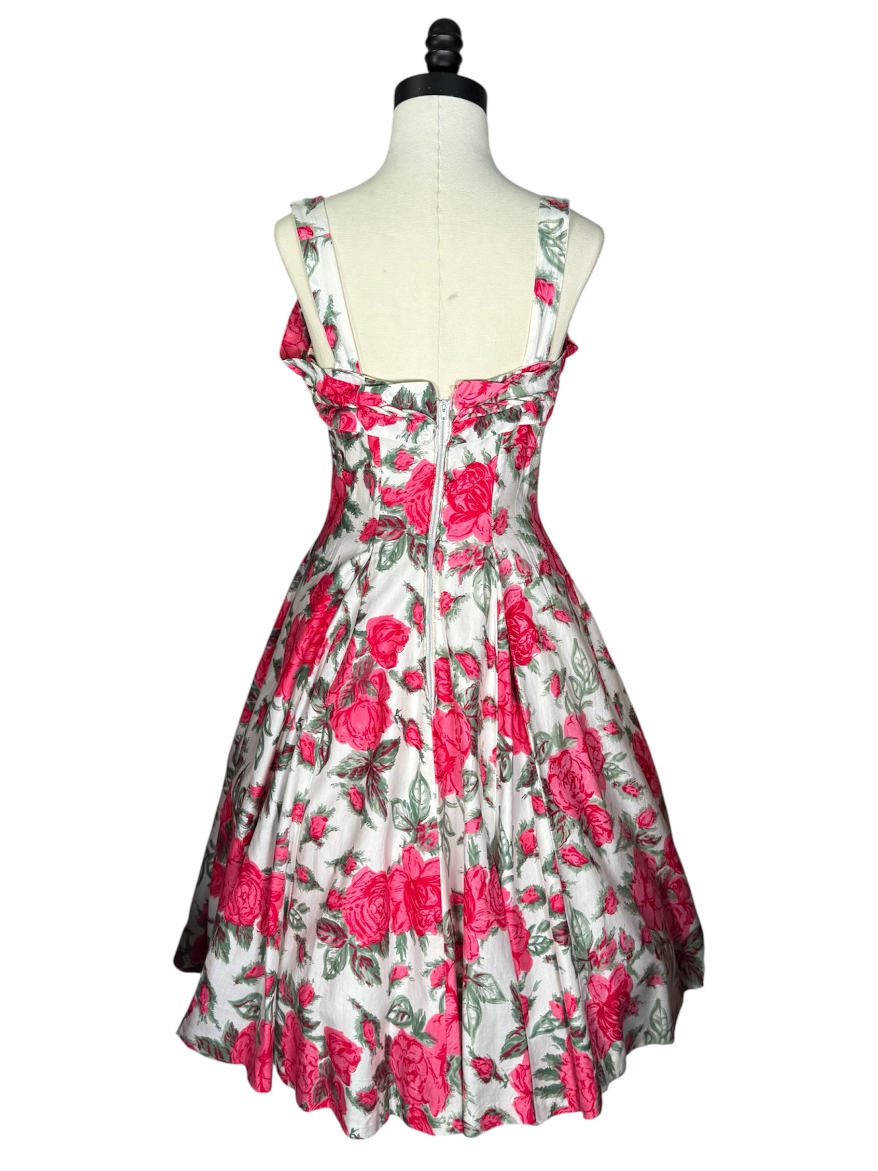 1950s unlabeled, floral dress. This dress features a sweetheart neckline, is sleeveless, and has a circle skirt. There is a bow at the neckline and it has a floral pattern with pink, white, and green colors. It attaches at the back with a metal zipper. It is pictured with a petticoat underneath. There was no visible flaws with this piece.