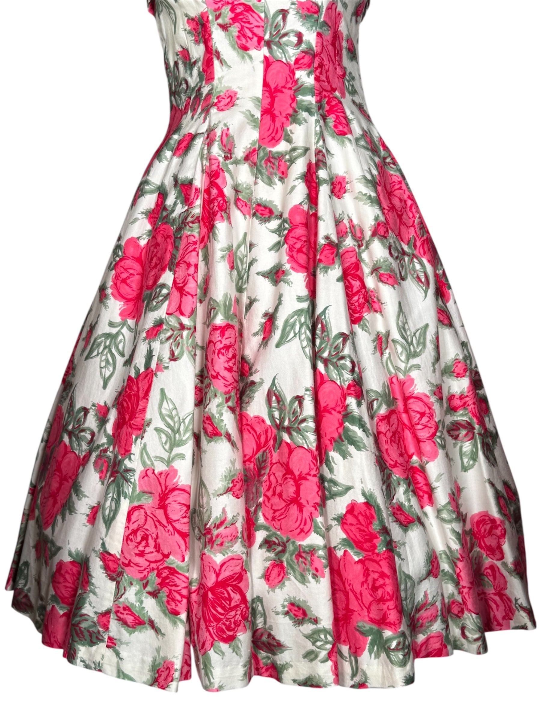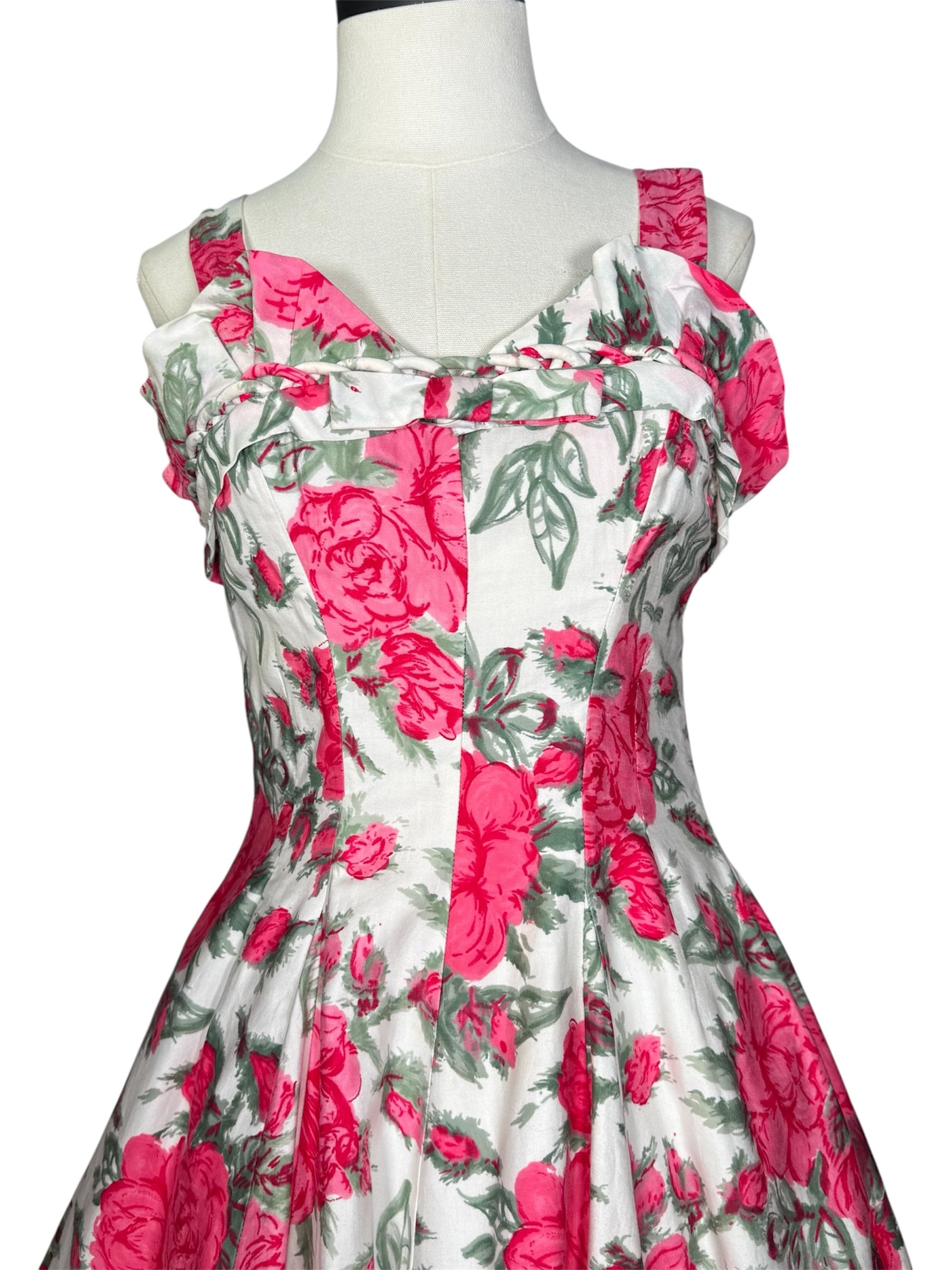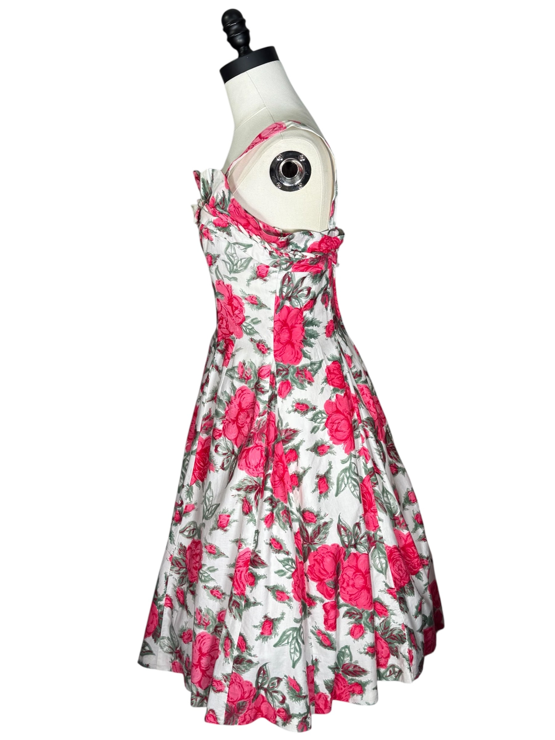 1950s unlabeled, floral dress. This dress features a sweetheart neckline, is sleeveless, and has a circle skirt. There is a bow at the neckline and it has a floral pattern with pink, white, and green colors. It attaches at the back with a metal zipper. It is pictured with a petticoat underneath. There was no visible flaws with this piece.