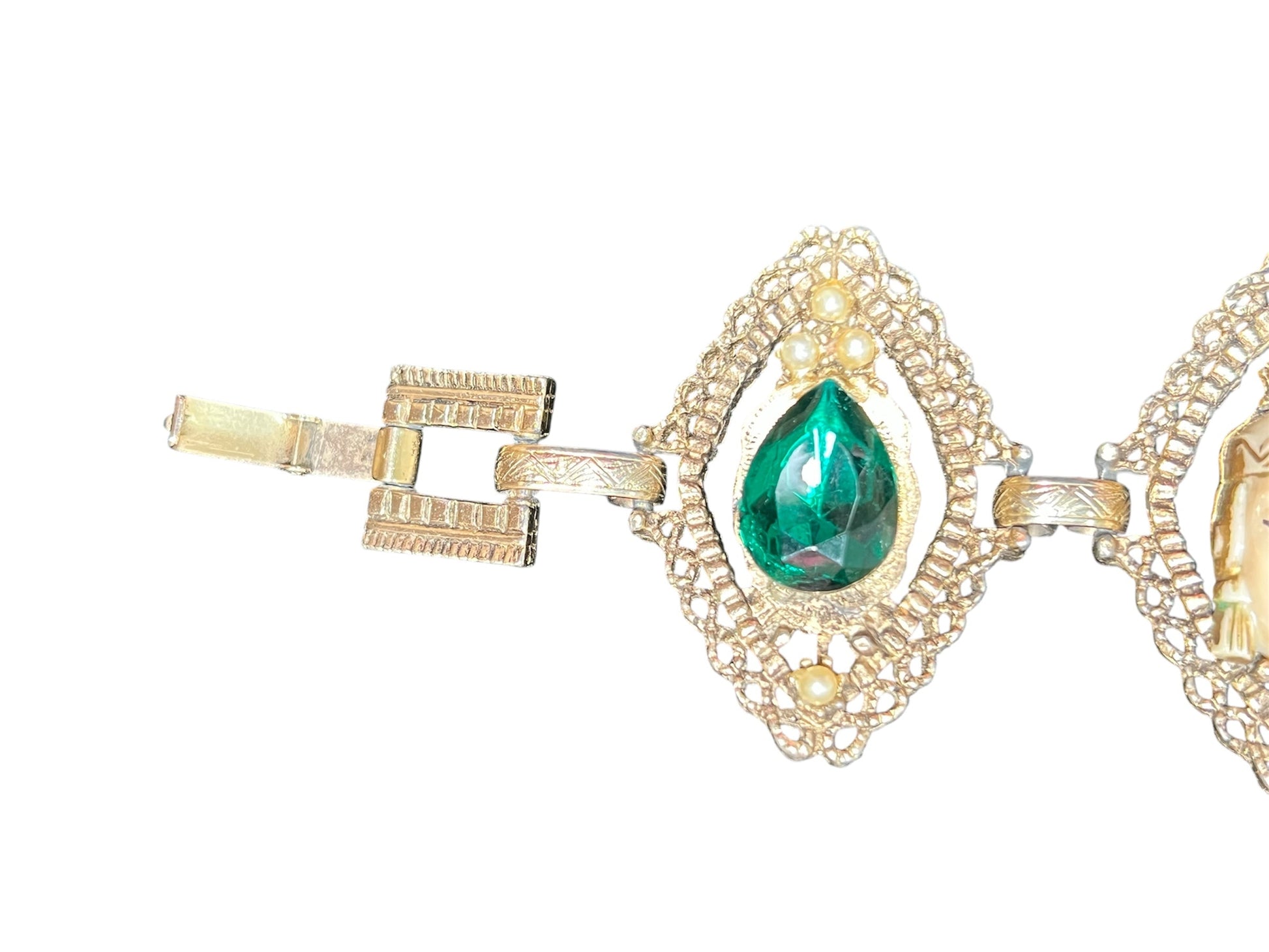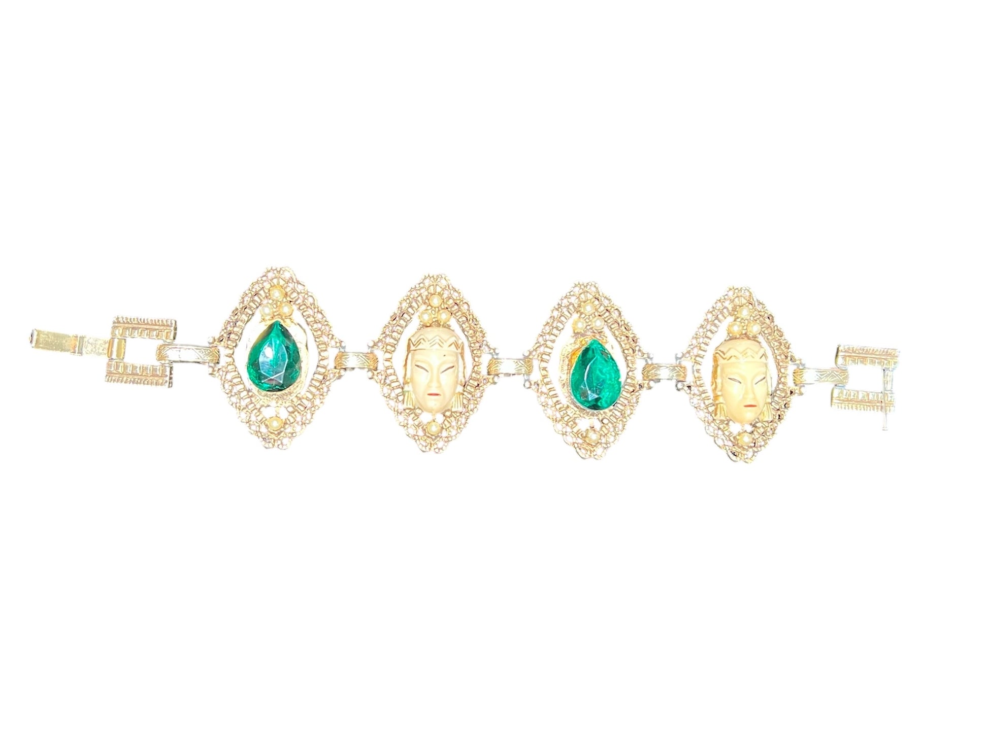 1950s Selro gold-toned bracelet. This costume jewelry piece features green, glass stones and plastic detailed faces. There is a fold over clasp on the ends of this bracelet.