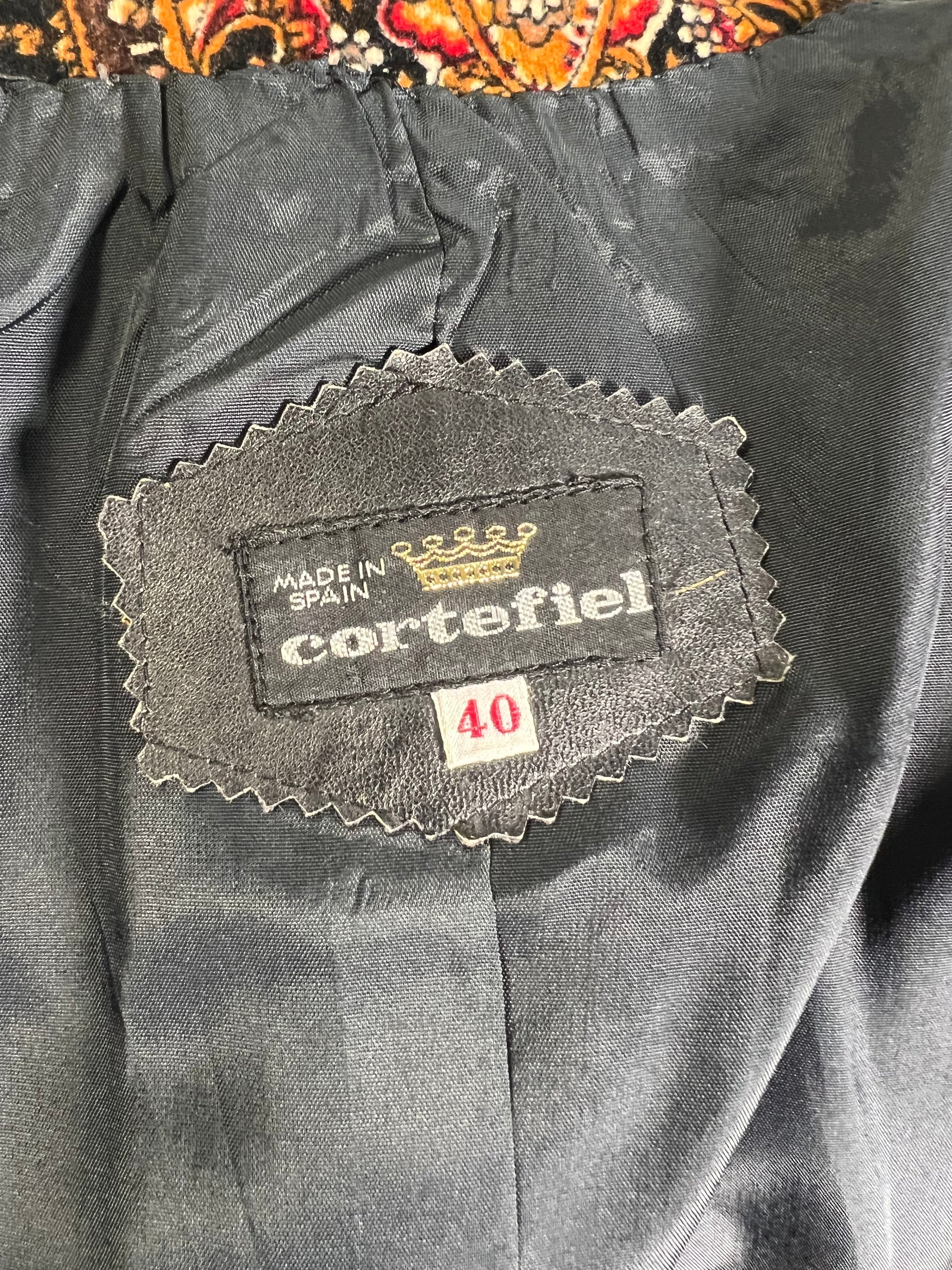 1960s Cortefiel jacket. This paisley jacket exhibits red, gold, white, and black colors, along with metal buttons embellished with a crest. This blazer is made in Spain and is dry clean only.