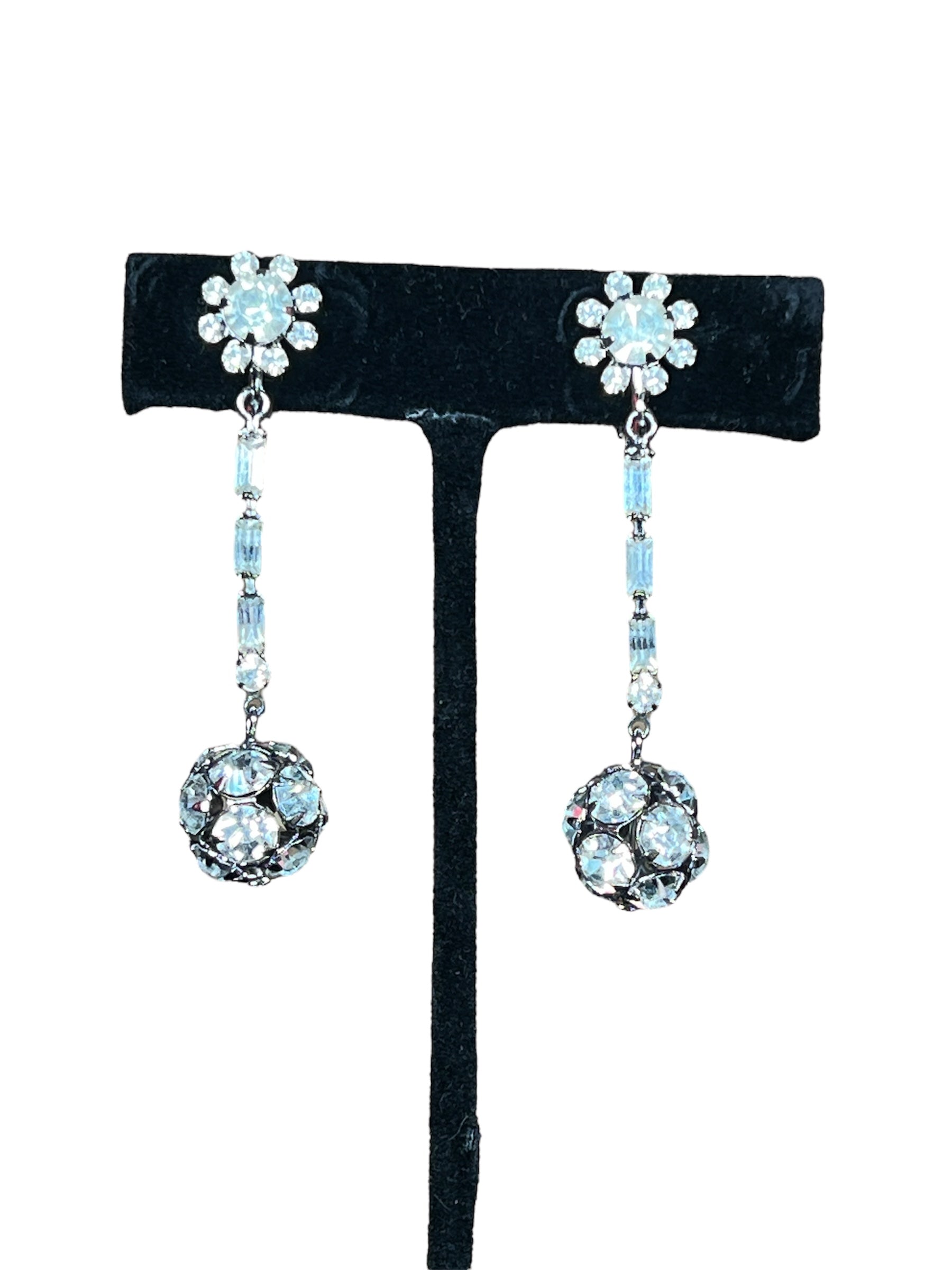 1960s rhinestone earrings. These costume jewelry earrings are drop earrings and have a clip on backing. They feature a rhinestone flower at the top and a rhinestone ball at the bottom.