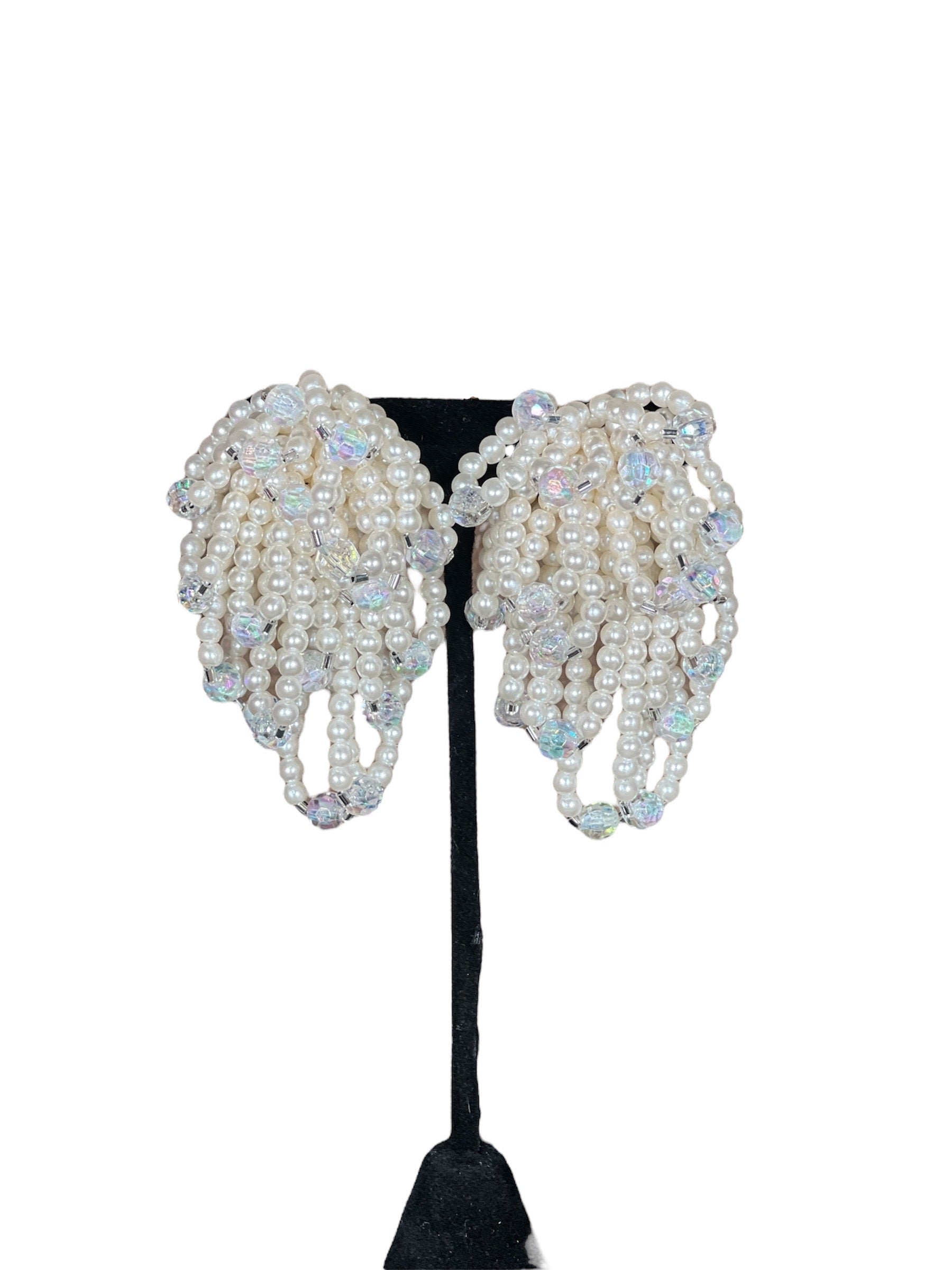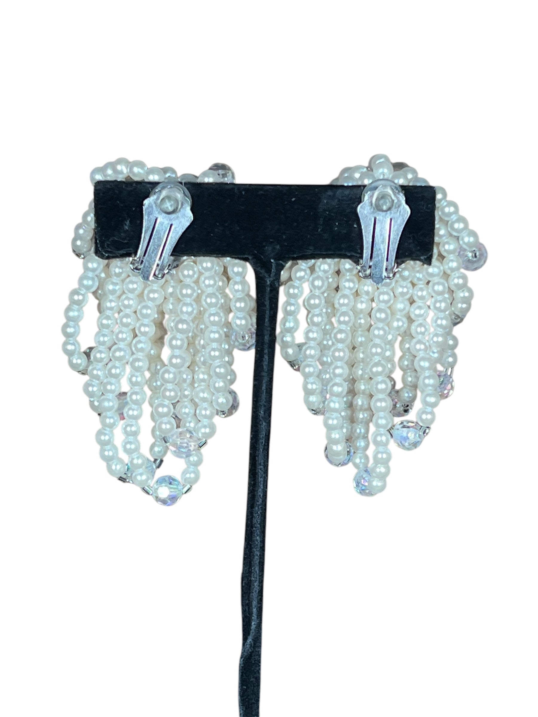 1960s faux pearl earrings. These costume jewelry earrings feature concentration of strings of faux pearl beads with a clear bead on the bottom of each strand. These are clip-on earrings.