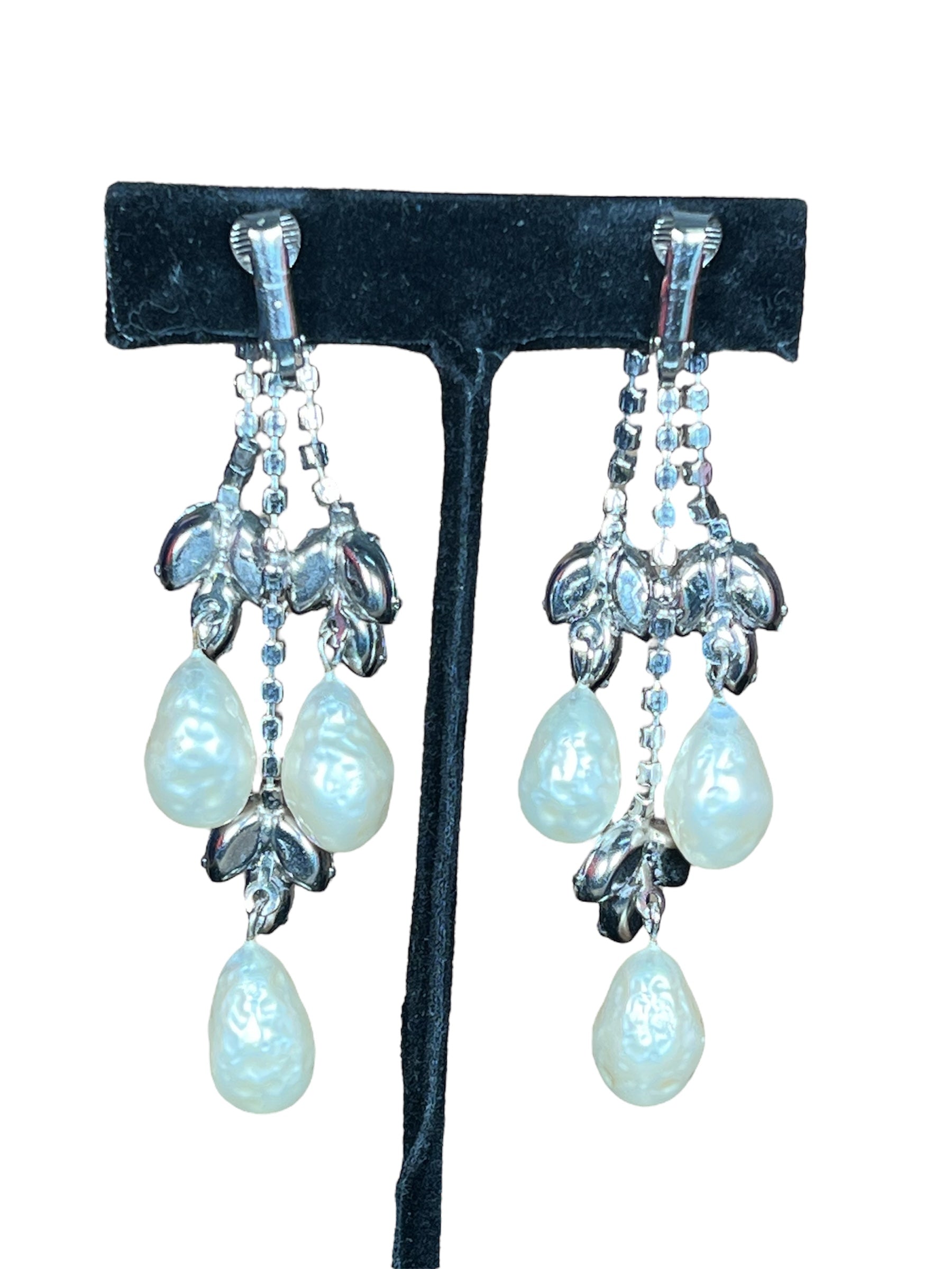 1960s drop earrings. These costume jewelry earrings feature rhinestones and warm-toned, cream, faux pearls. These earrings are clip-ons.