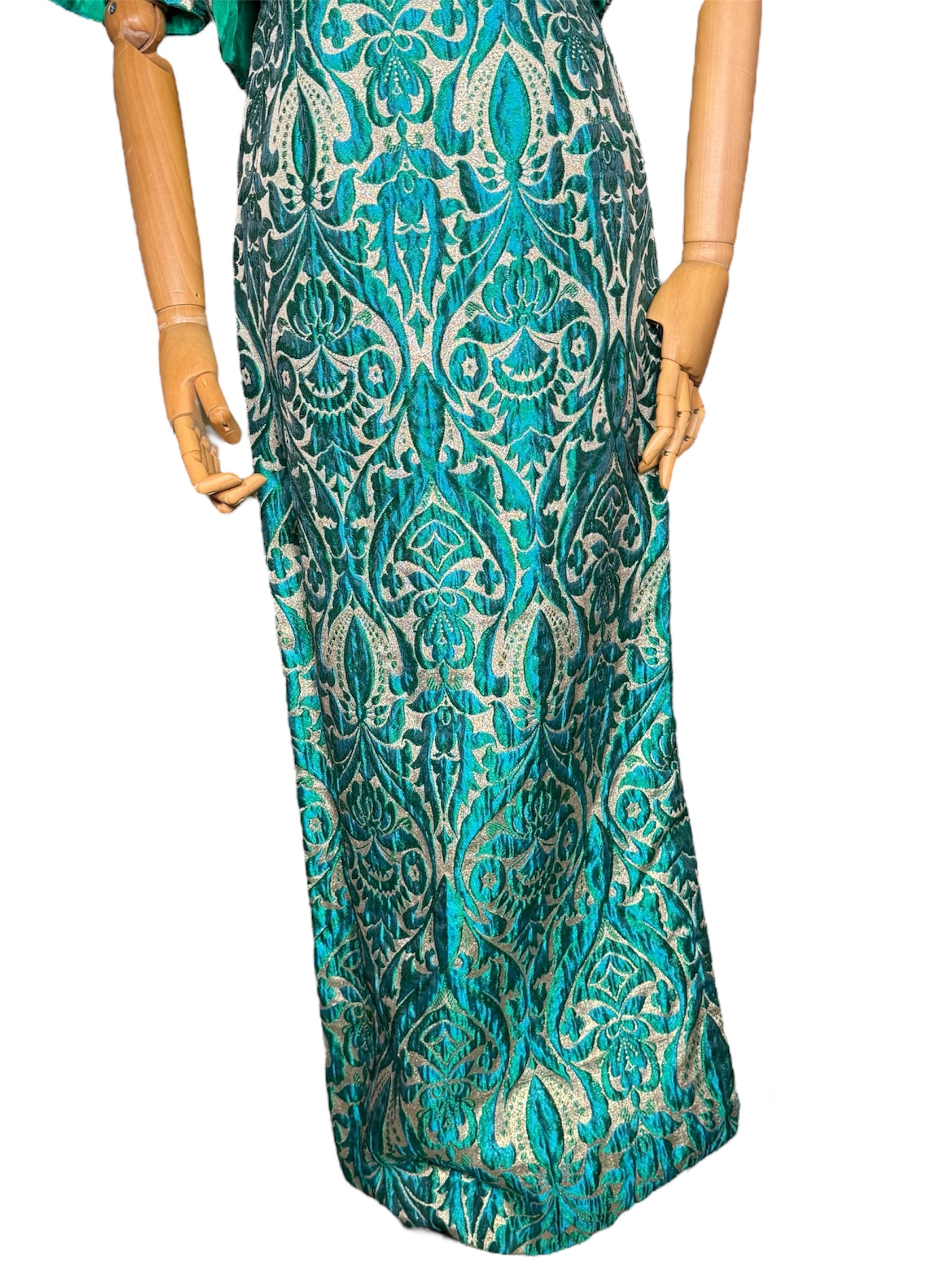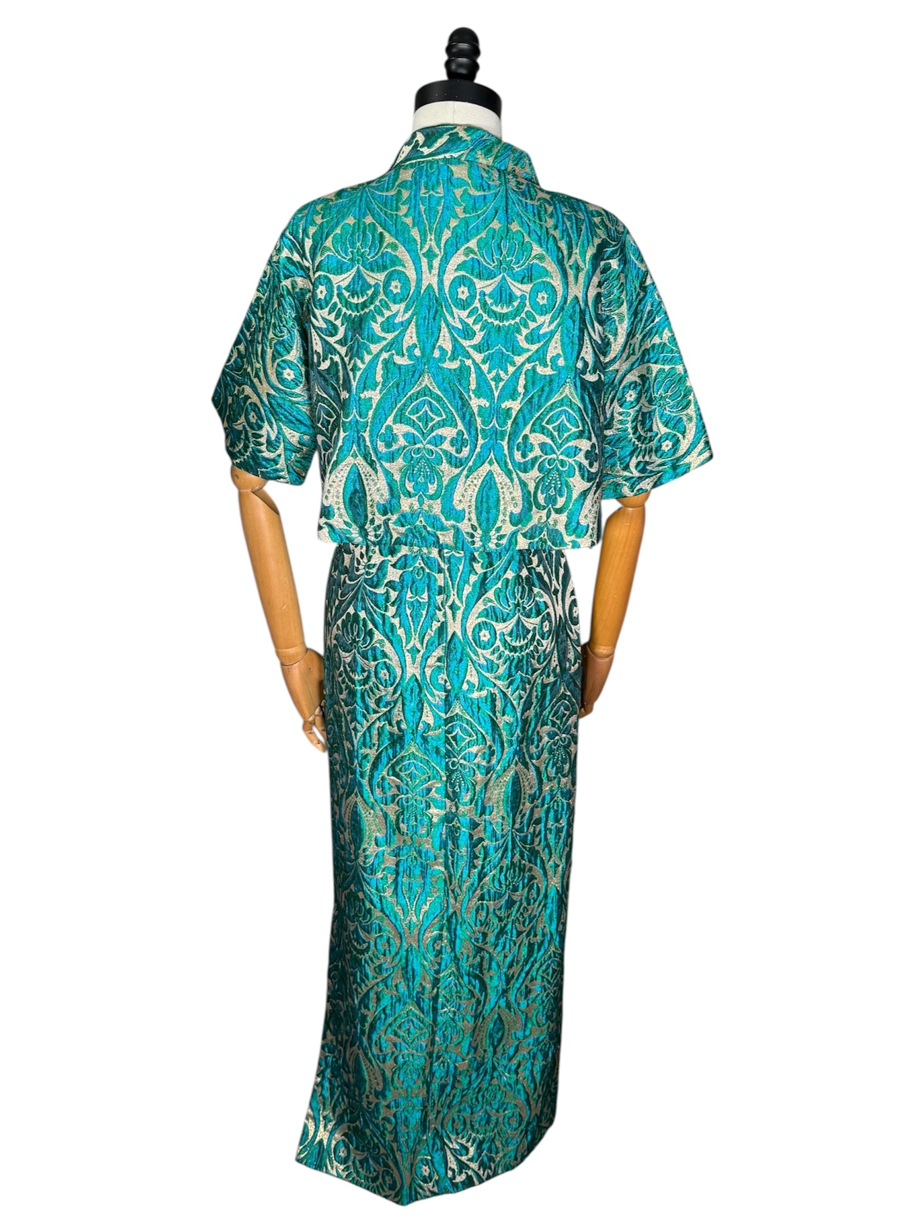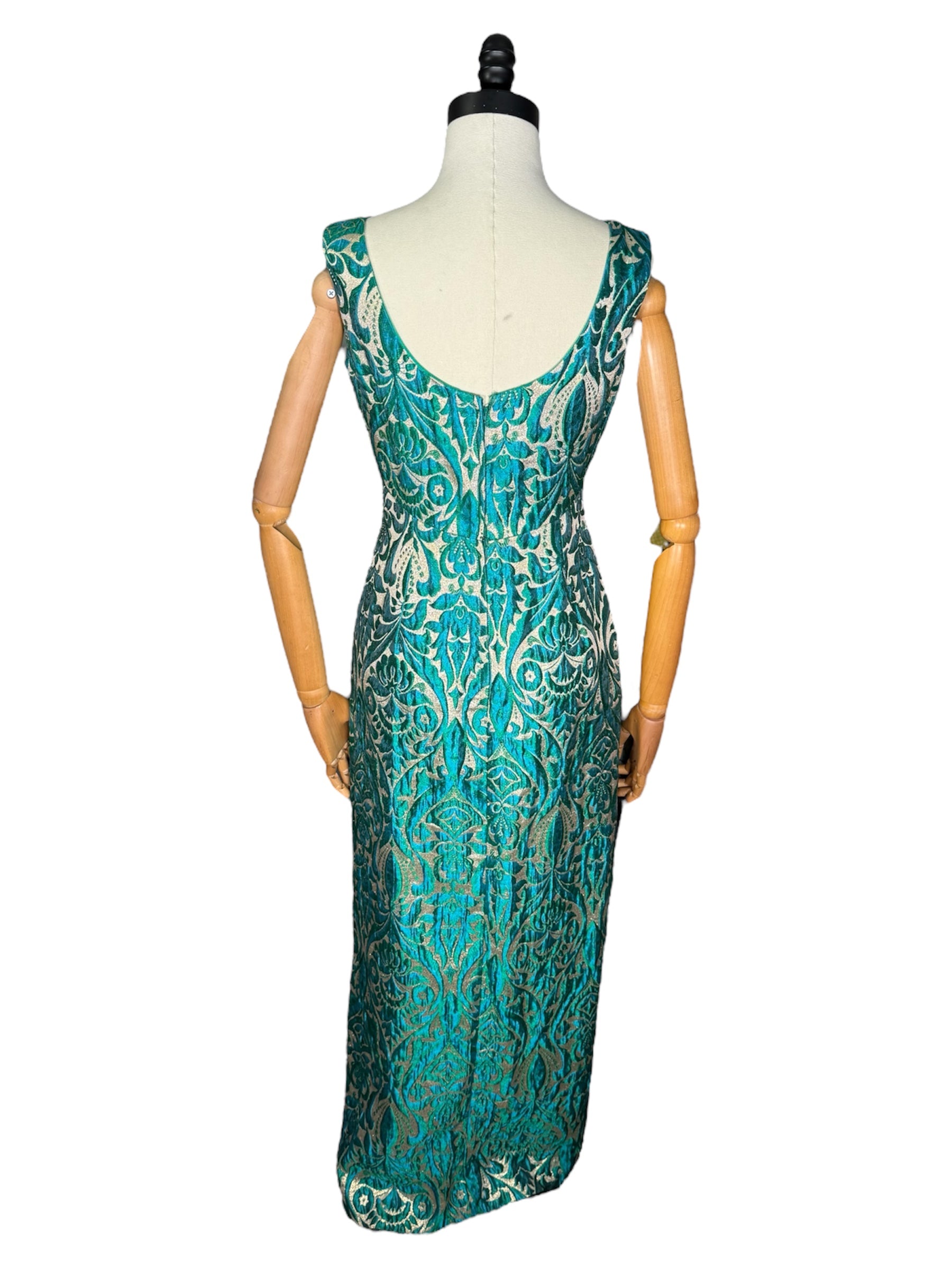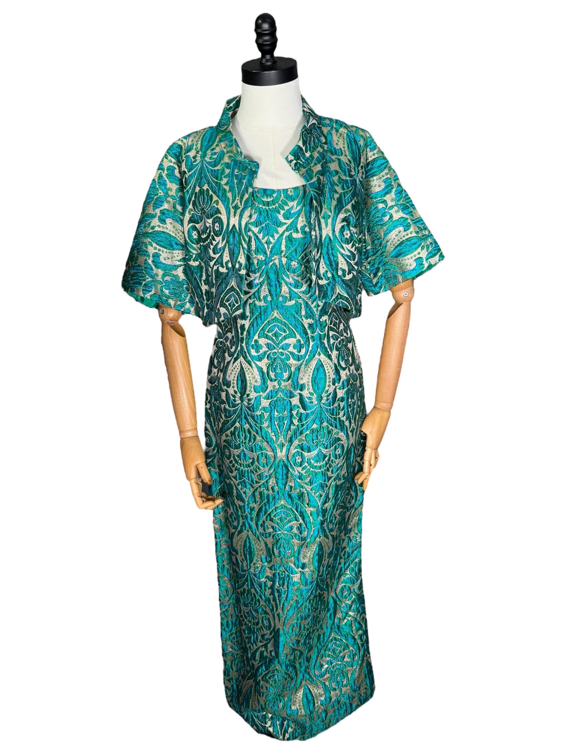 1960s unlabeled gown with matching bolero. This metallic green and silver features a rounded neckline, a low back, and is a full-length gown. The dress is sleeveless and the jacket has short sleeves. It attaches in the back with a zipper. There were no visible flaws with this piece.