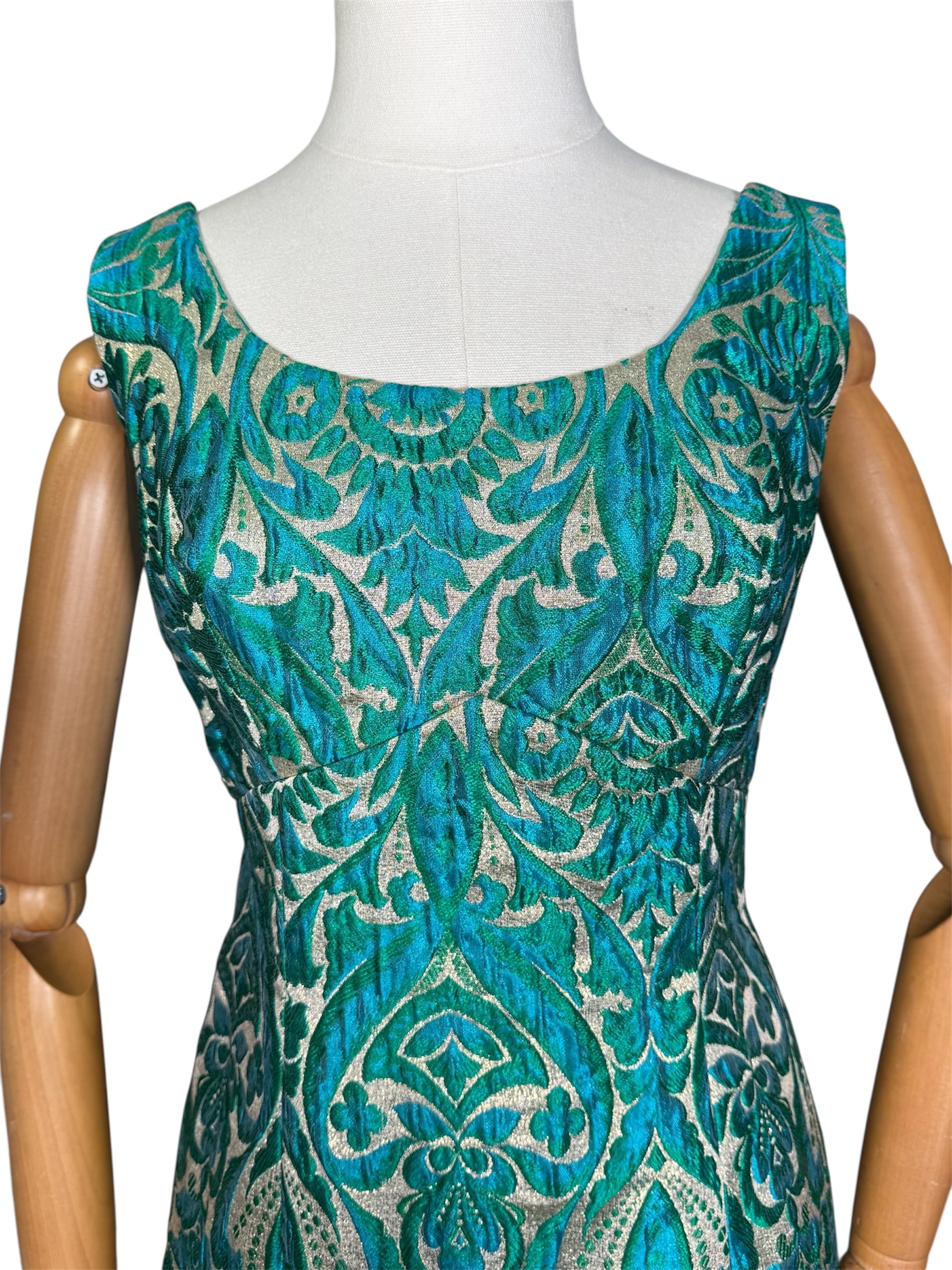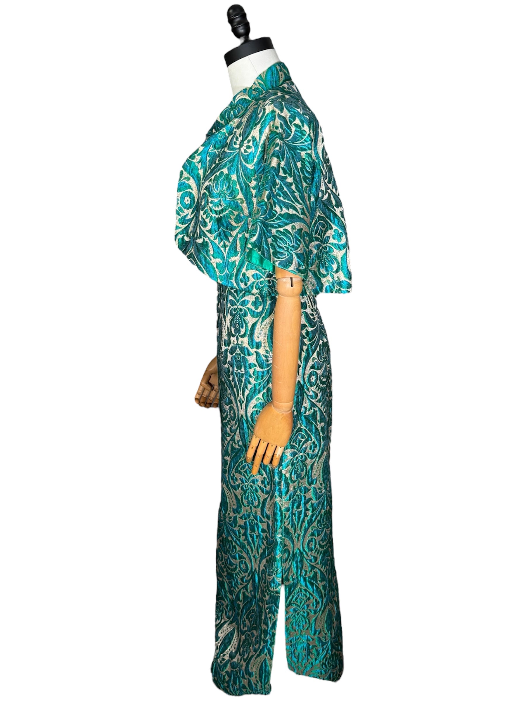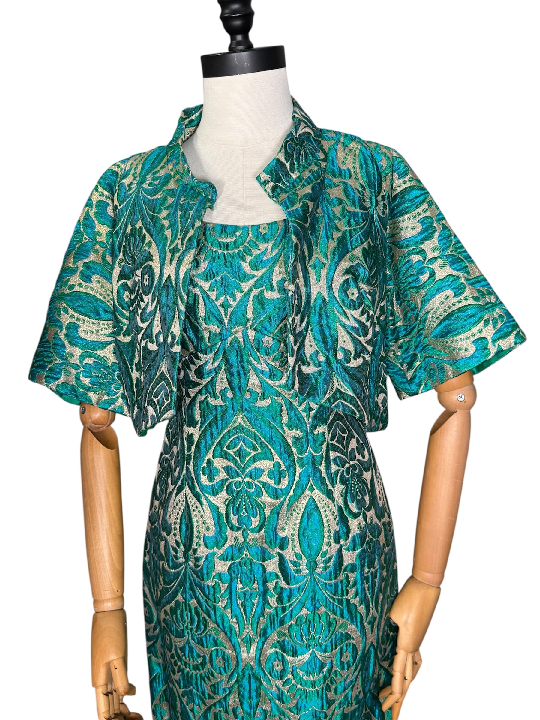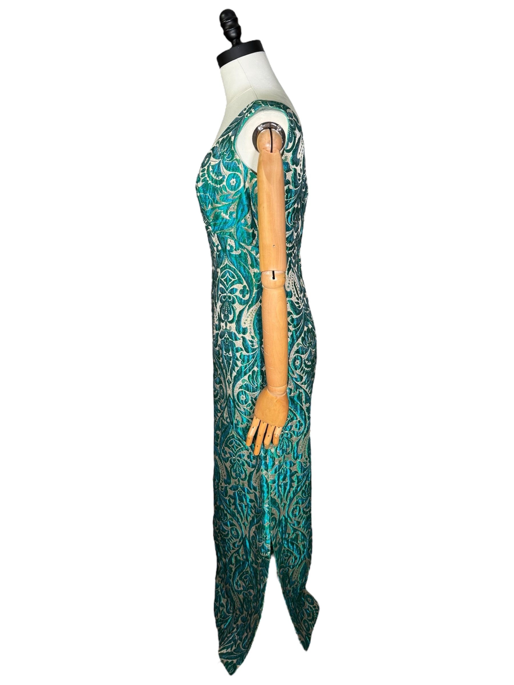 1960s unlabeled gown with matching bolero. This metallic green and silver features a rounded neckline, a low back, and is a full-length gown. The dress is sleeveless and the jacket has short sleeves. It attaches in the back with a zipper. There were no visible flaws with this piece.