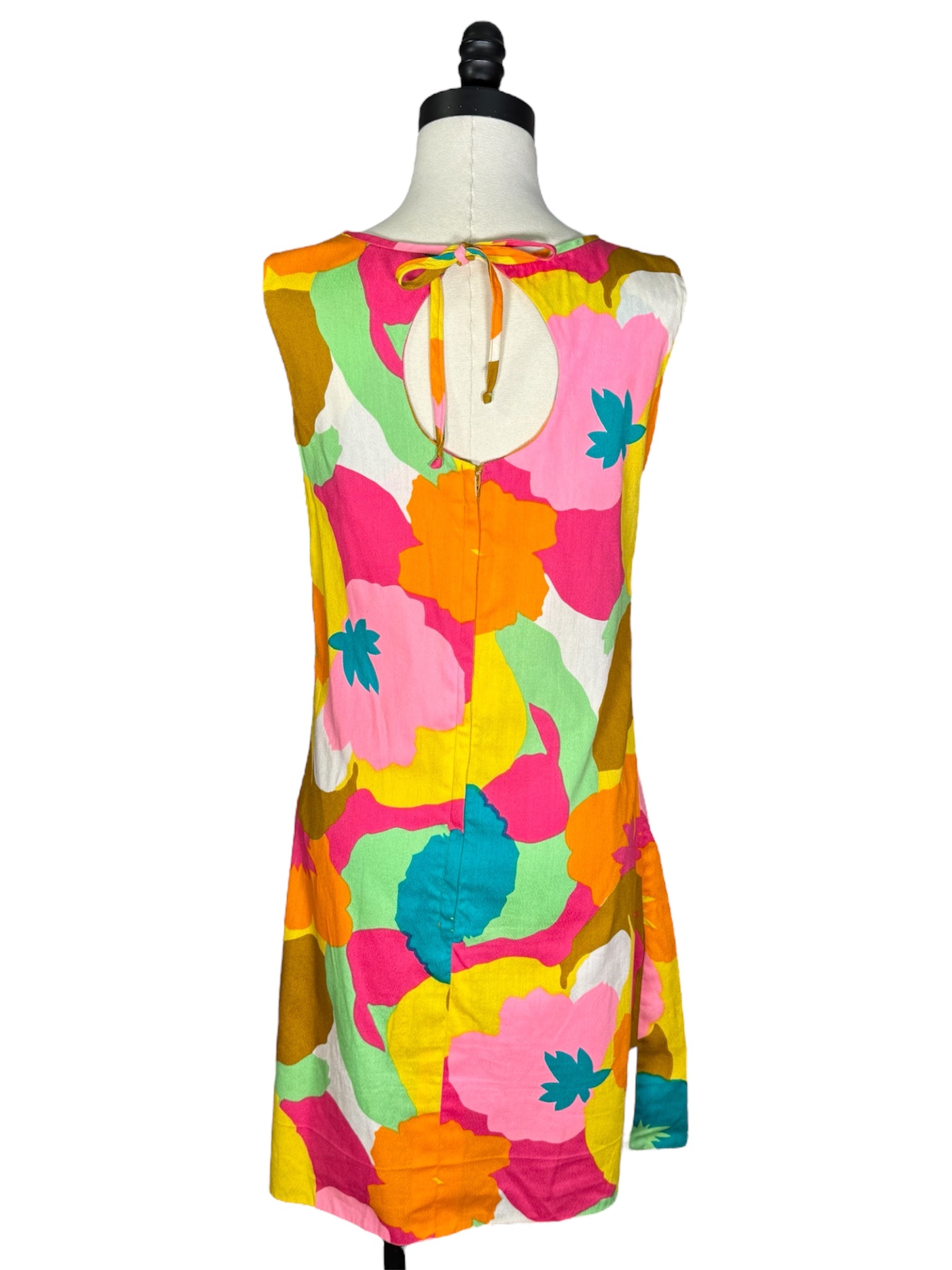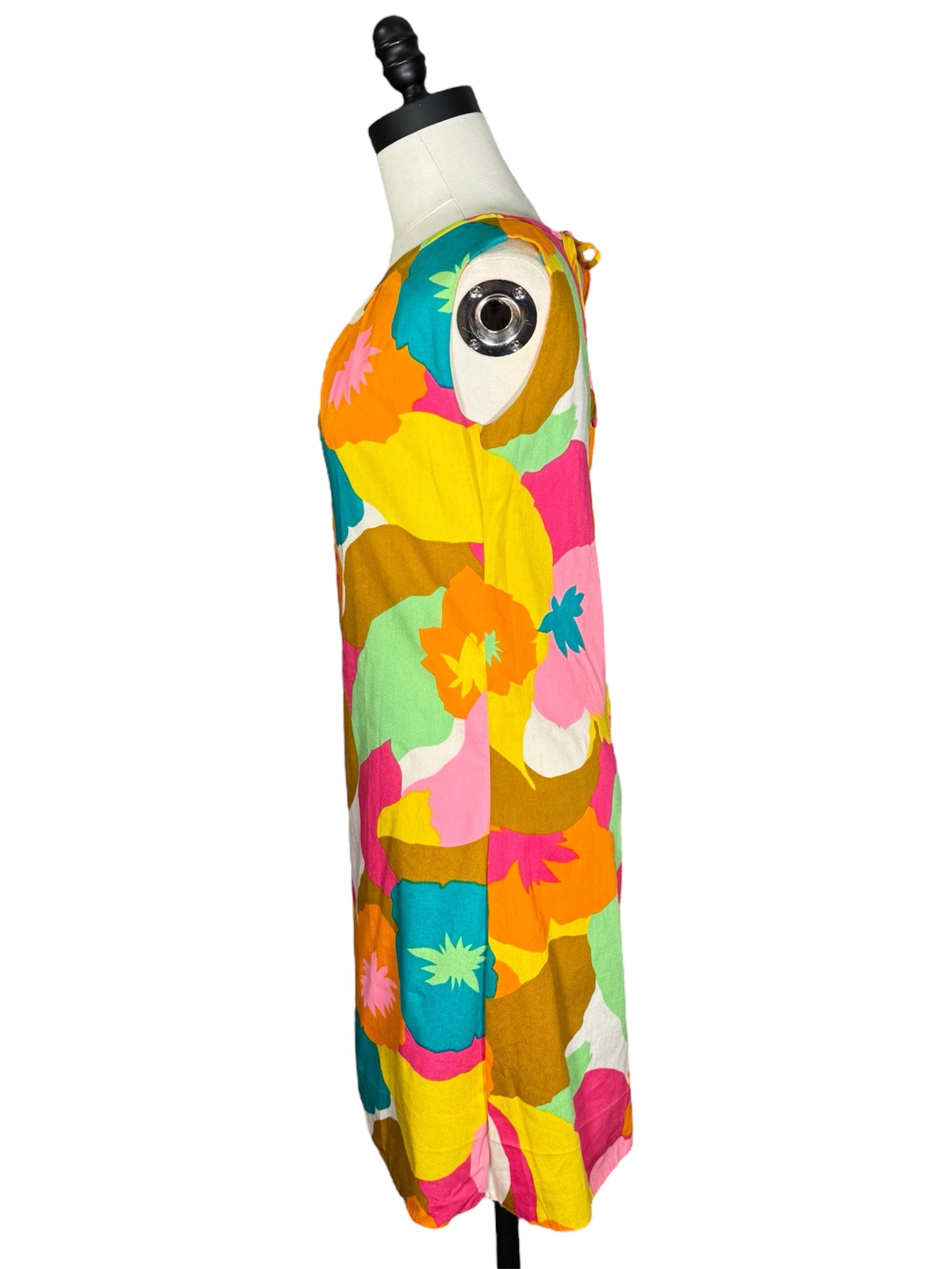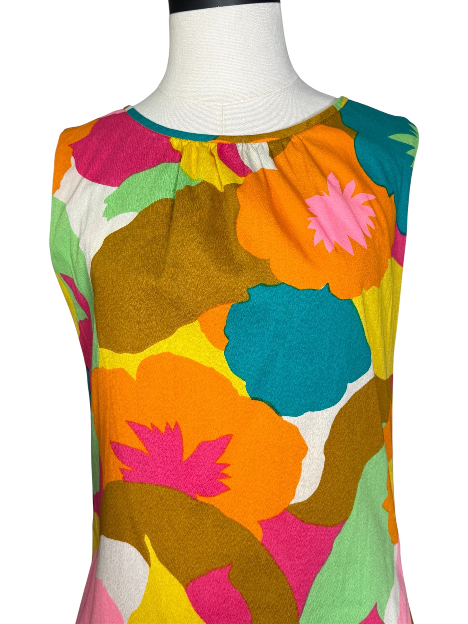 1960s Hale Aloha Isoshima Hawaiian dress. This multi-color dress features a rounded-neckline, is sleeveless, and has a key hole in the back that ties with a bow. This dress is a mini length and will likely end above the knee, depending on the height of the wearer. There were no visible flaws with this dress.