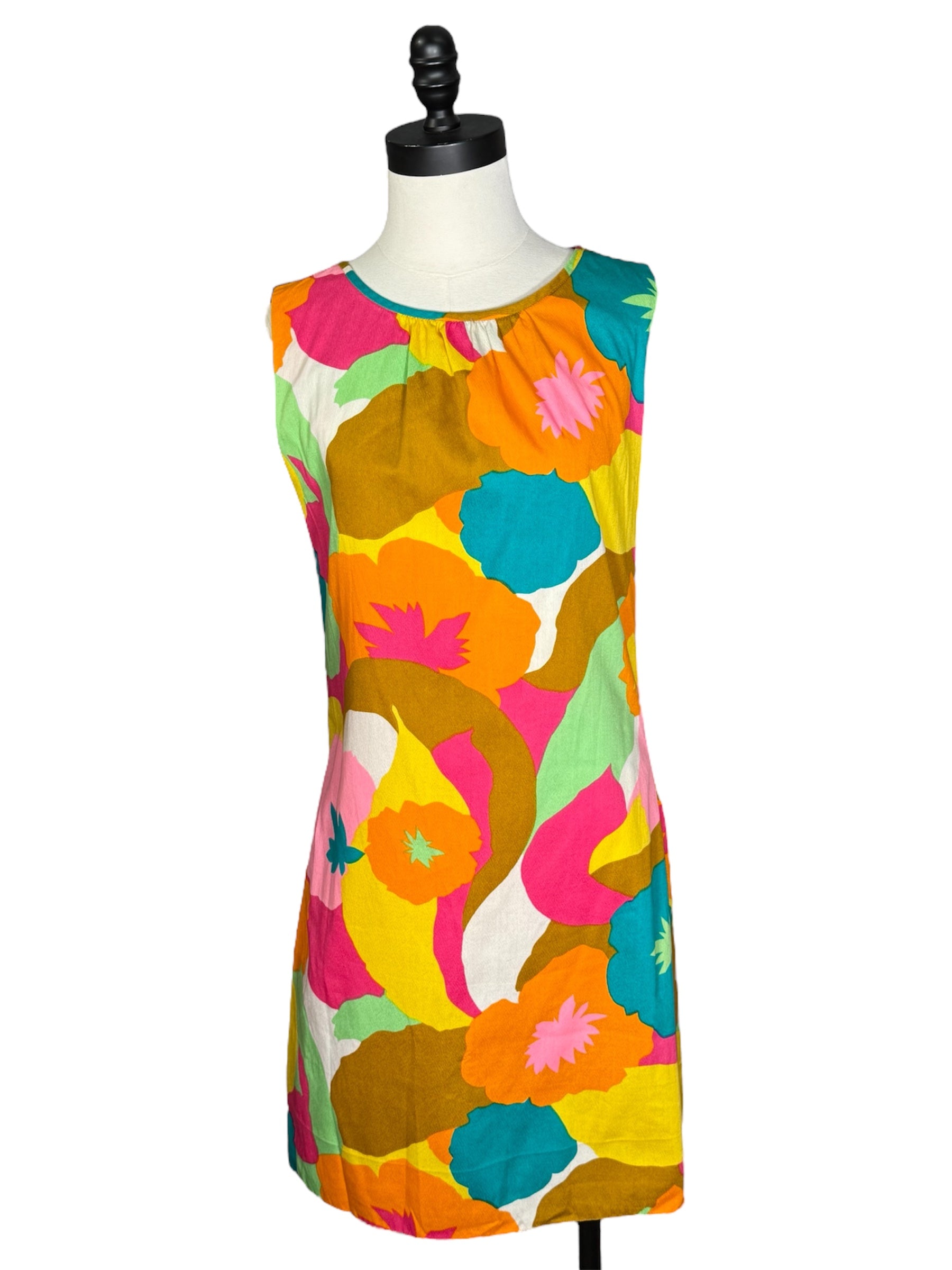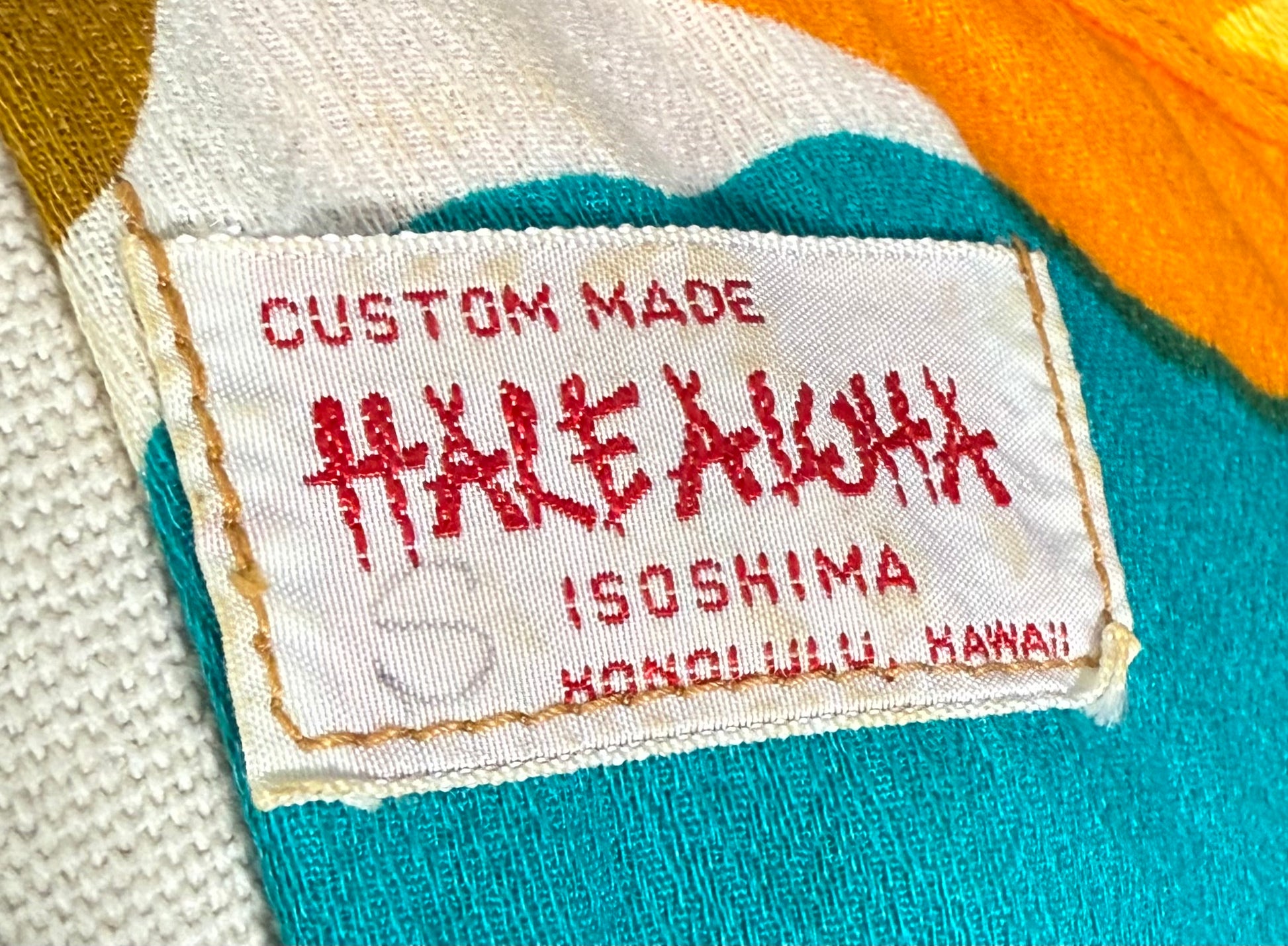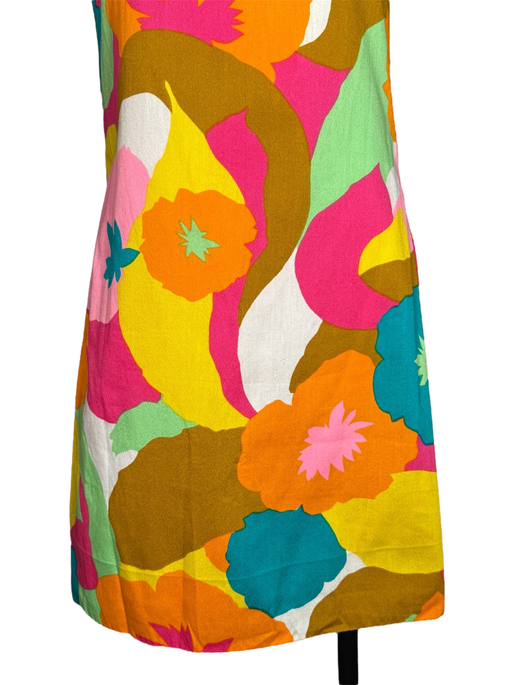 1960s Hale Aloha Isoshima Hawaiian dress. This multi-color dress features a rounded-neckline, is sleeveless, and has a key hole in the back that ties with a bow. This dress is a mini length and will likely end above the knee, depending on the height of the wearer. There were no visible flaws with this dress.