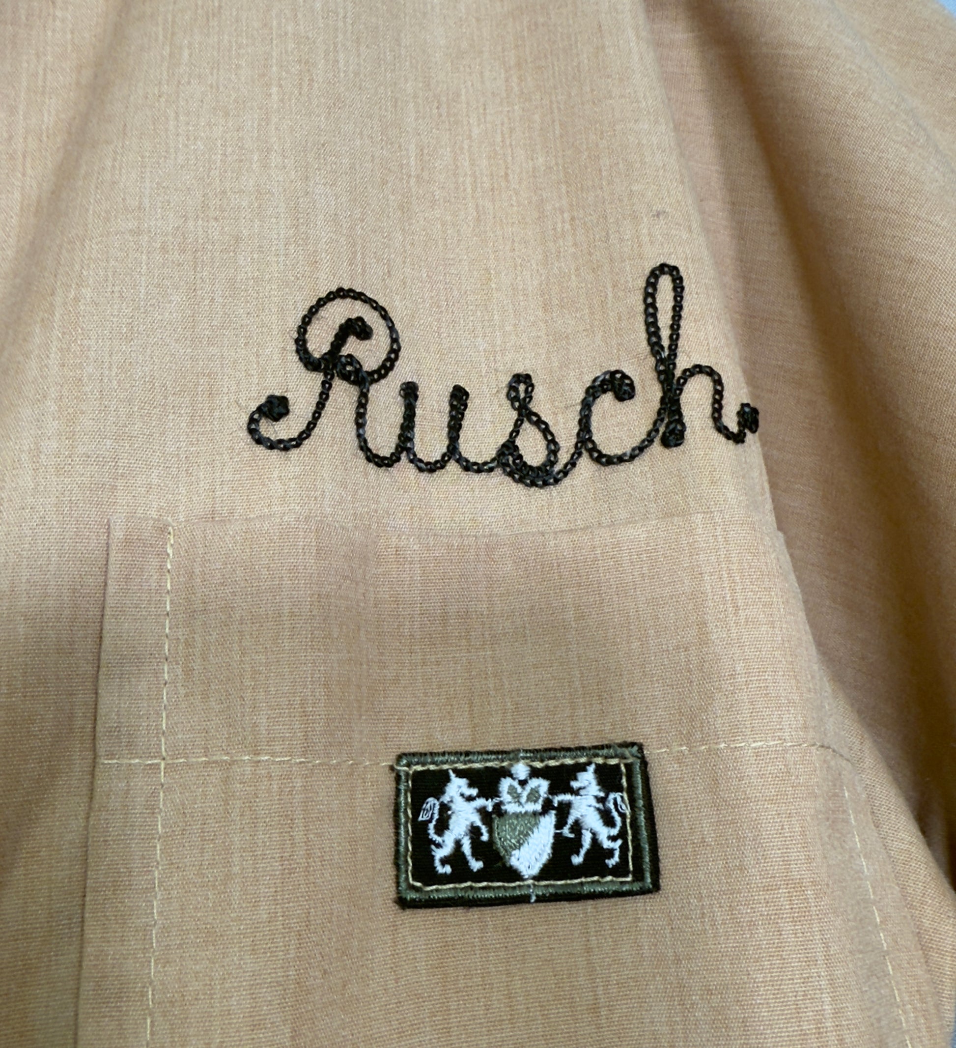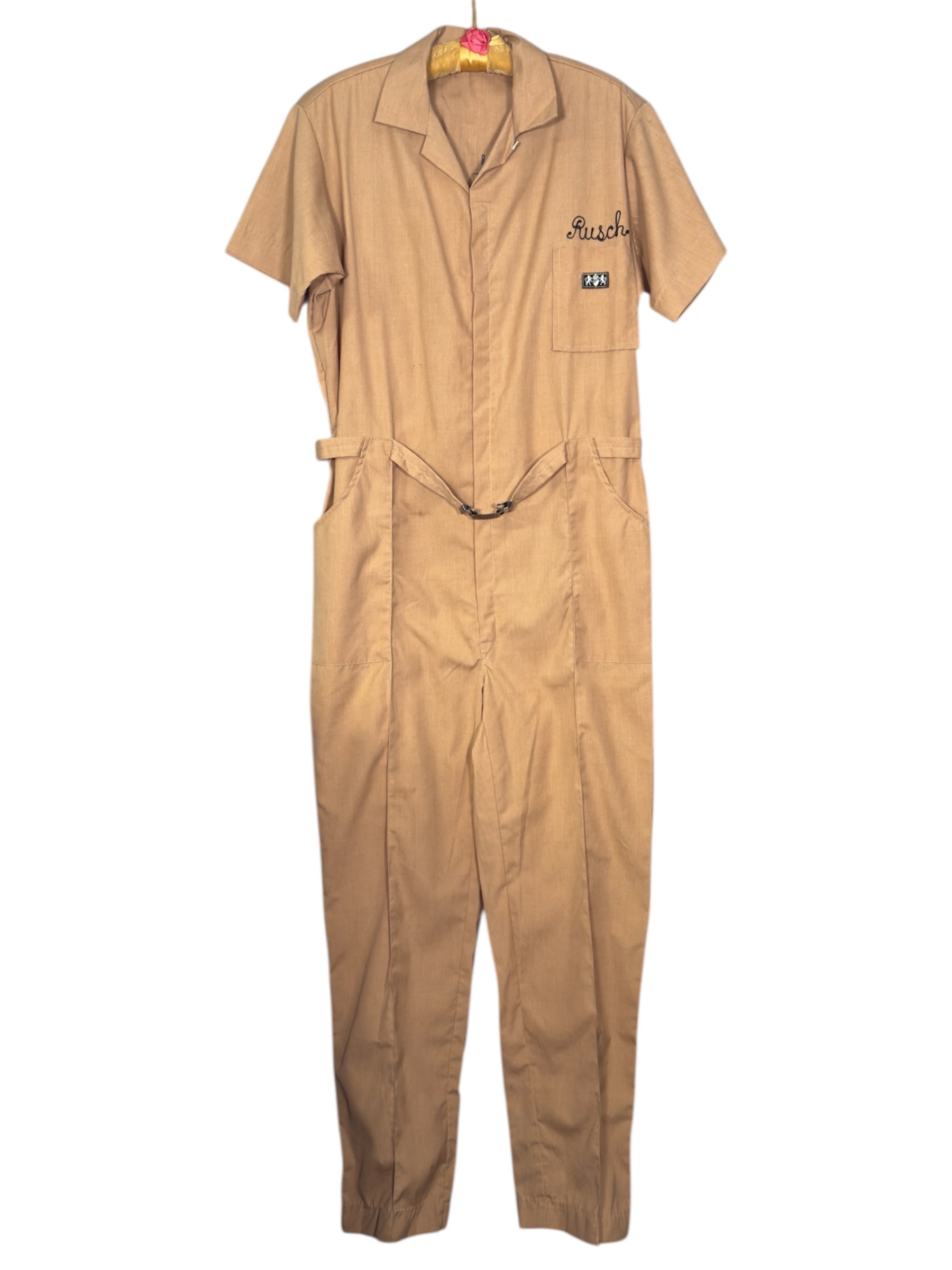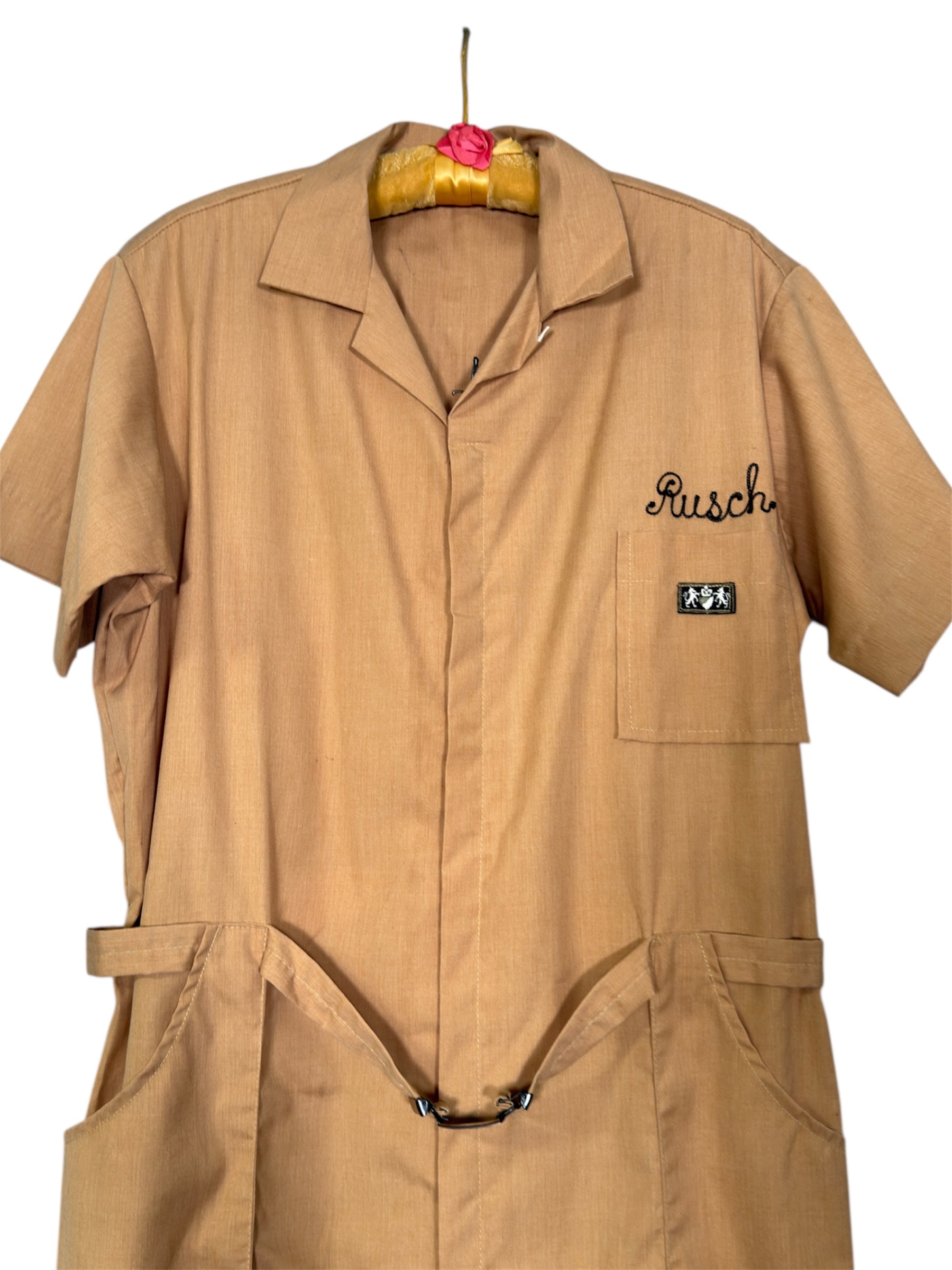 1960s Bill Parry jumpsuit embroidered with Holiday Magic Cosmetics on the back. This yellow jumpsuit features chain embroidery of "Busch" on the front, along with a patch of lions and crest underneath. It has a built in belt with a metal belt buckle that also has the lions and crest on the buckle. On the back, it is embroidered with "Holiday Magic Cosmetics". The waist on the back is ruched as well. There are pockets on either side of the side of the back and deep pockets on either side of the hips. There is slight marks visible on the back embroidery, likely original to when the embroidery was designed.