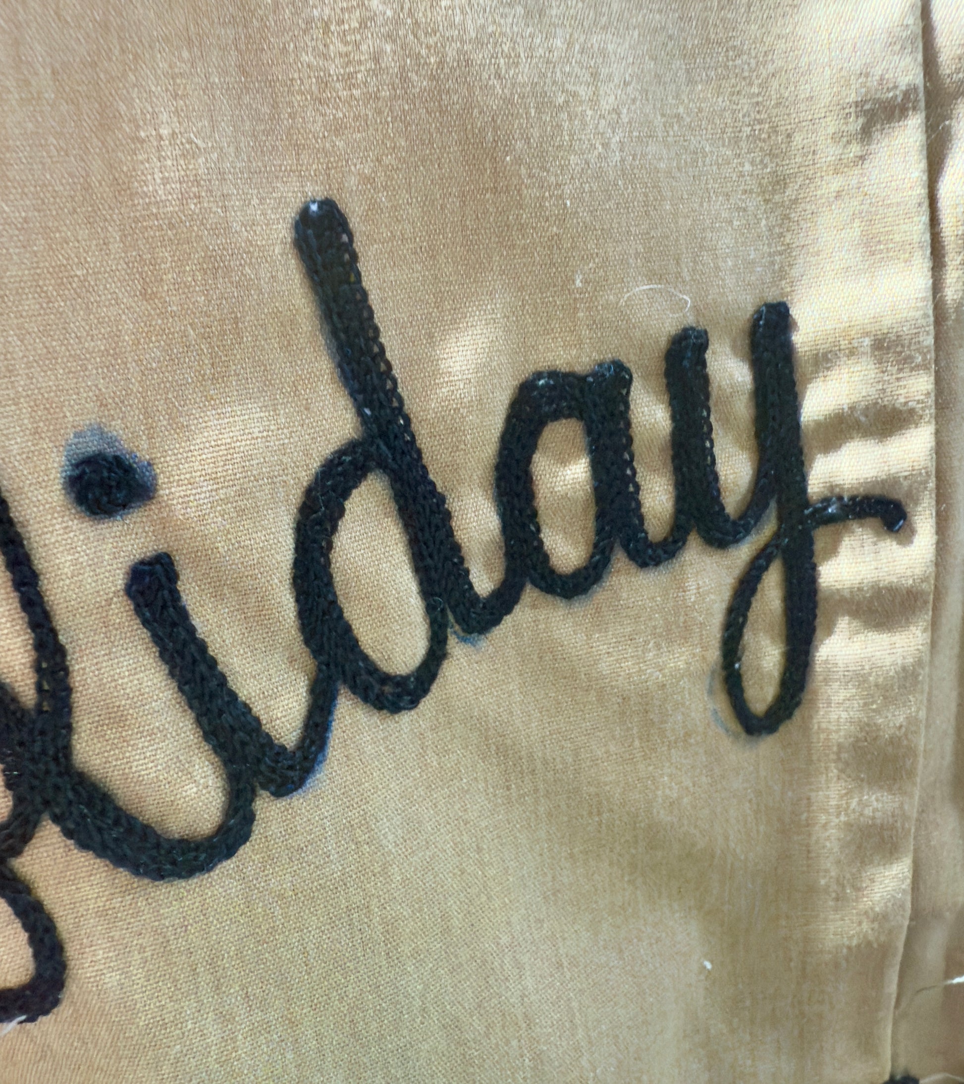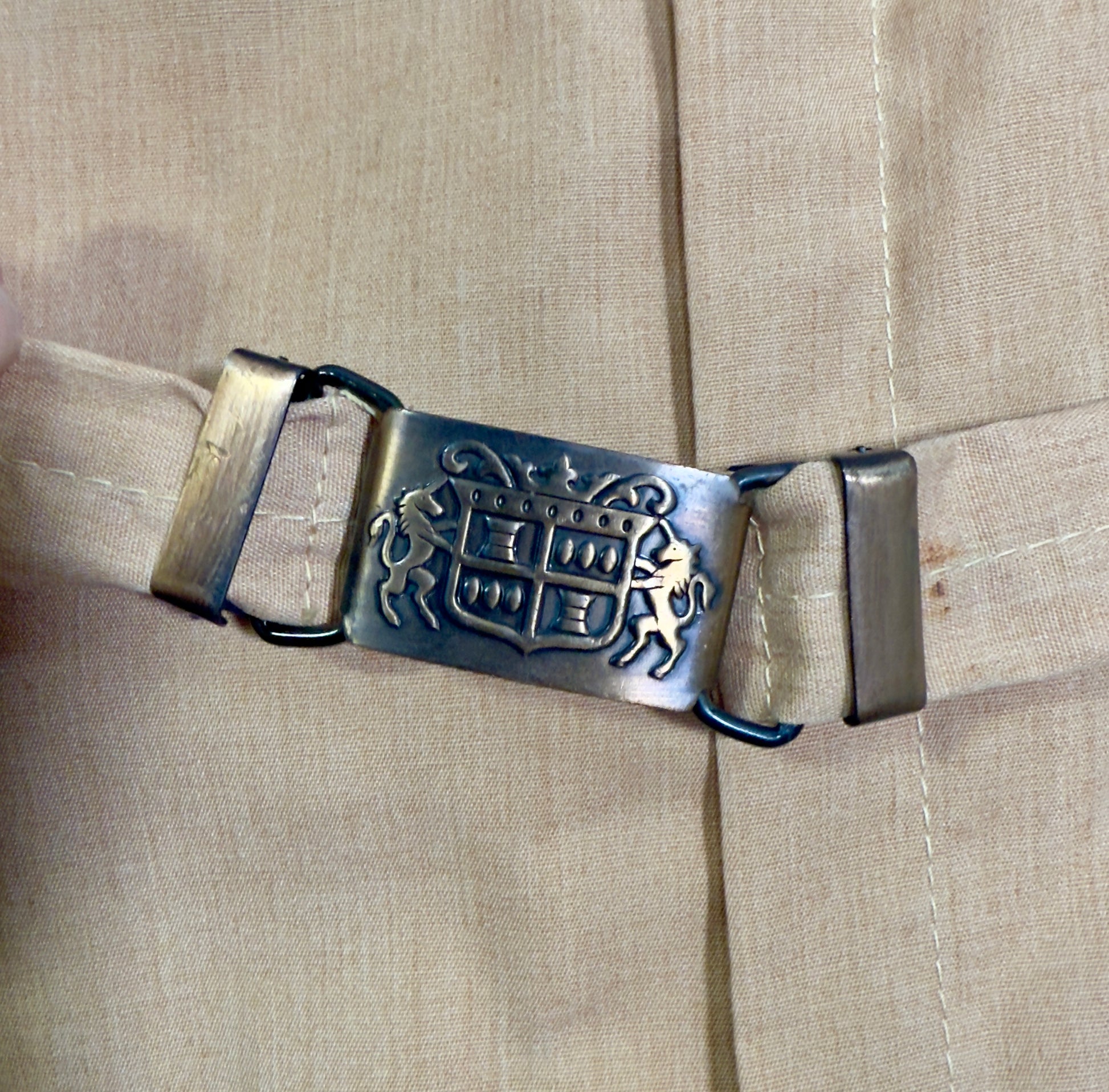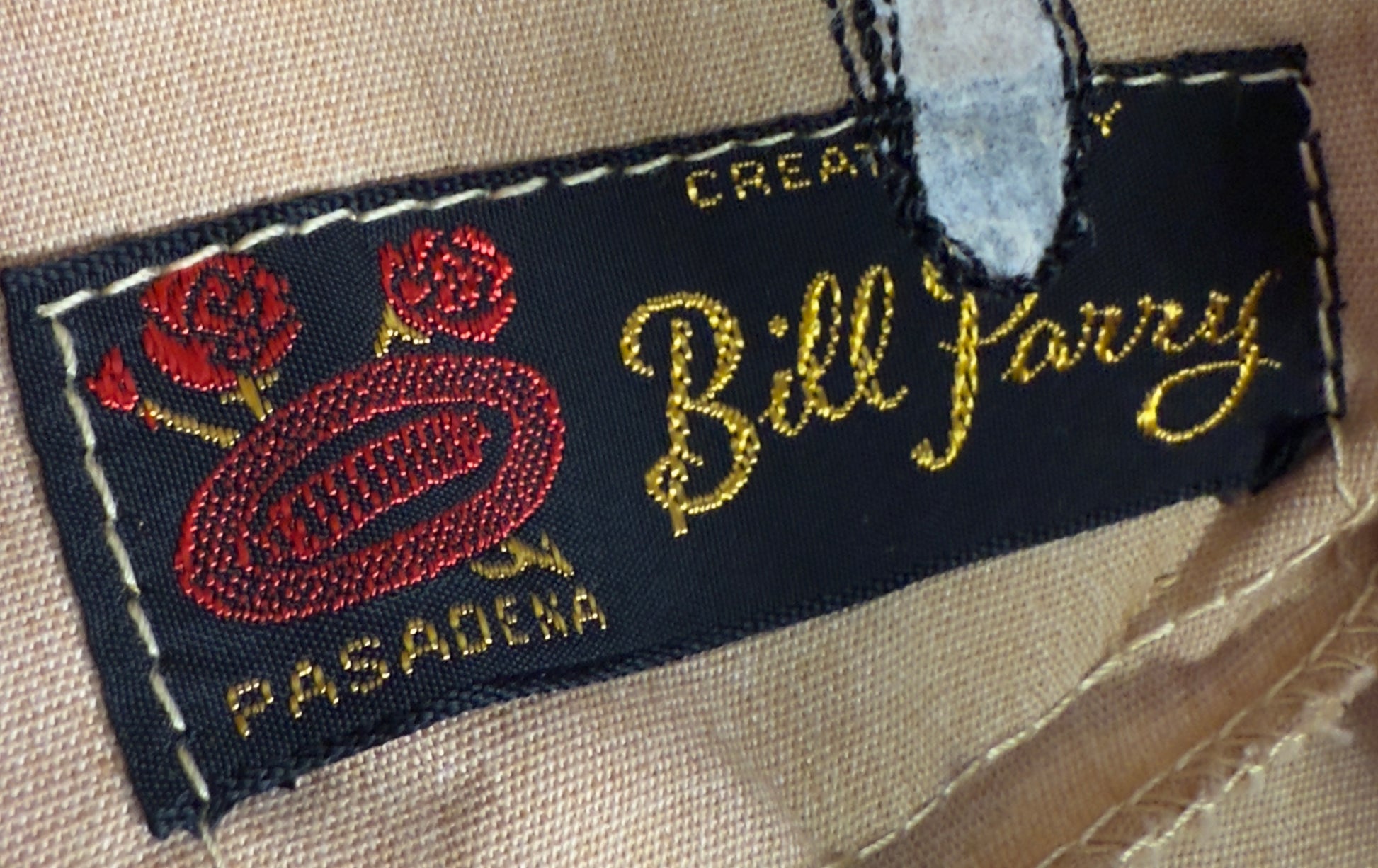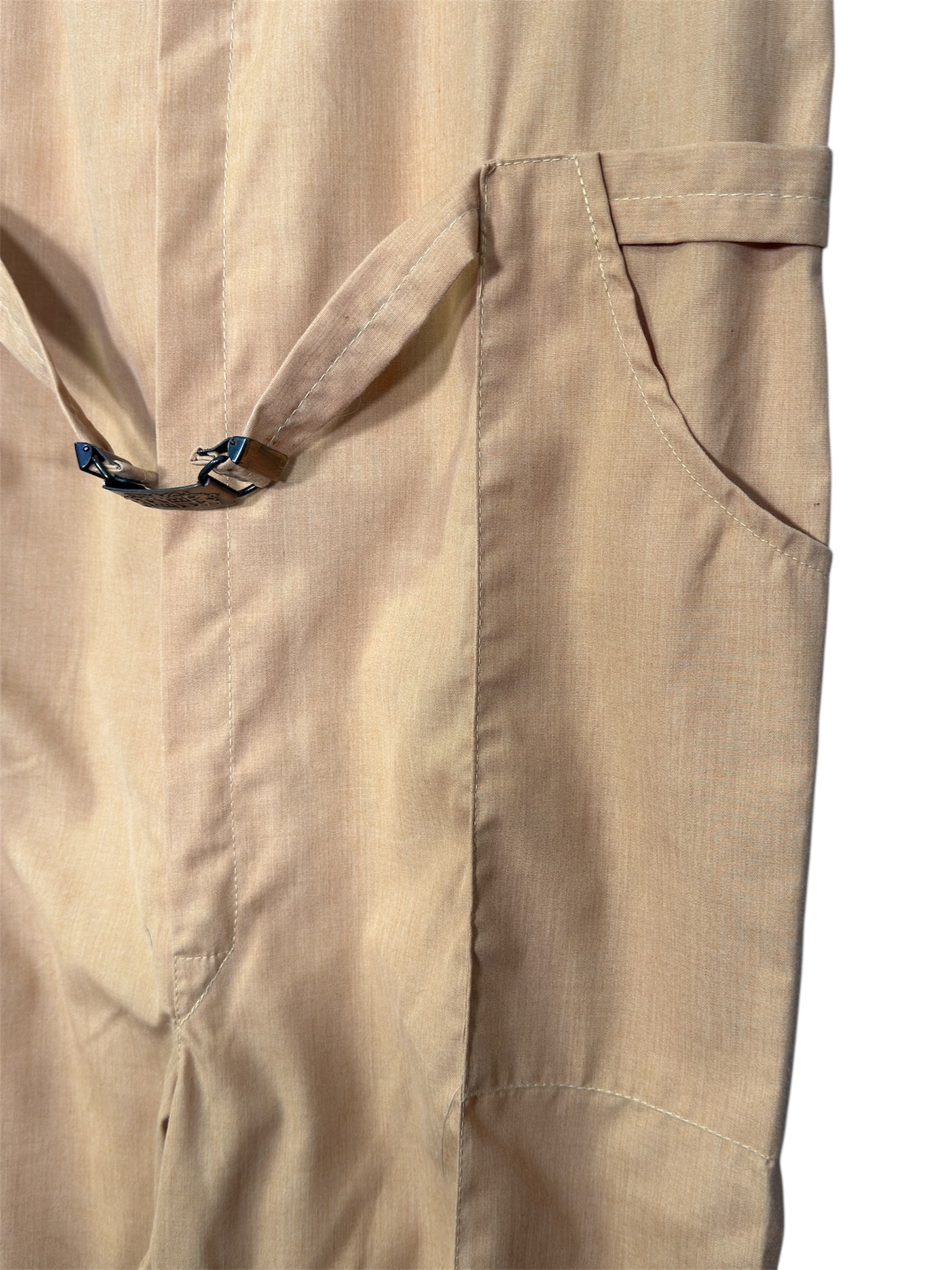 1960s Bill Parry jumpsuit embroidered with Holiday Magic Cosmetics on the back. This yellow jumpsuit features chain embroidery of "Busch" on the front, along with a patch of lions and crest underneath. It has a built in belt with a metal belt buckle that also has the lions and crest on the buckle. On the back, it is embroidered with "Holiday Magic Cosmetics". The waist on the back is ruched as well. There are pockets on either side of the side of the back and deep pockets on either side of the hips. There is slight marks visible on the back embroidery, likely original to when the embroidery was designed.