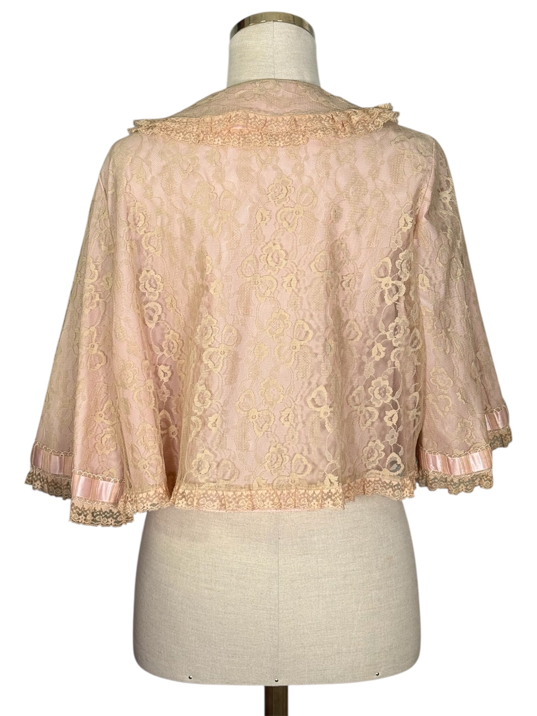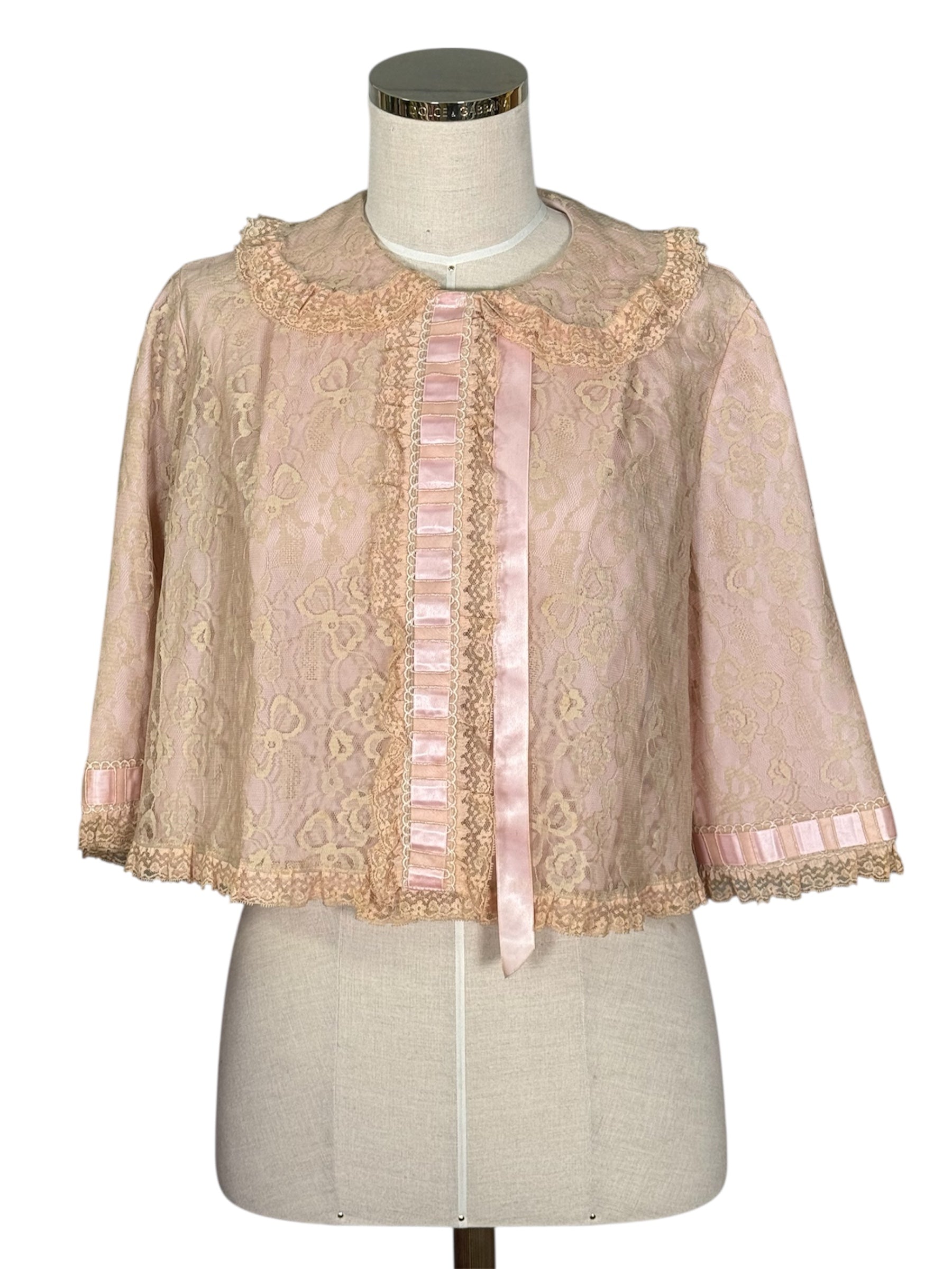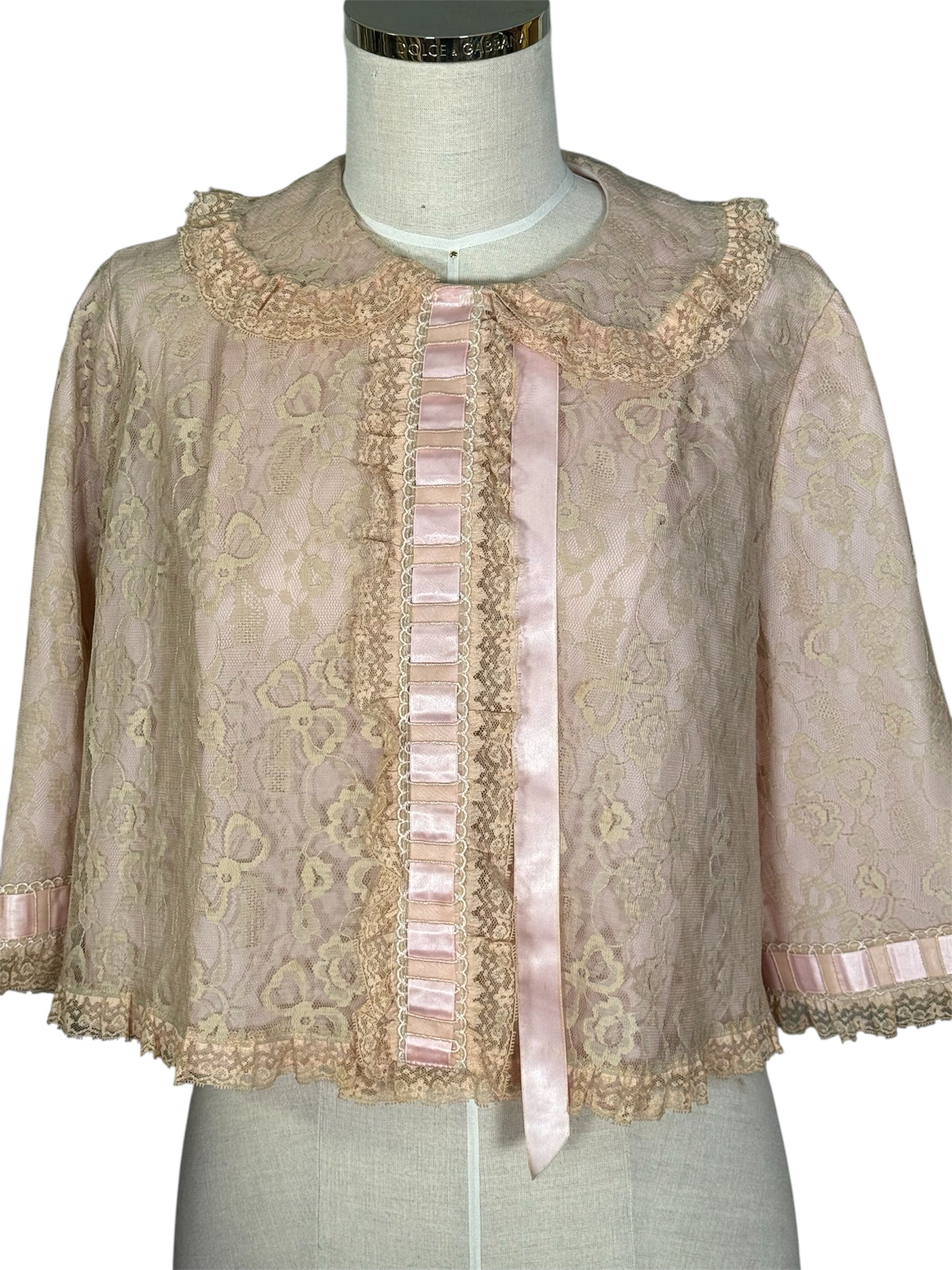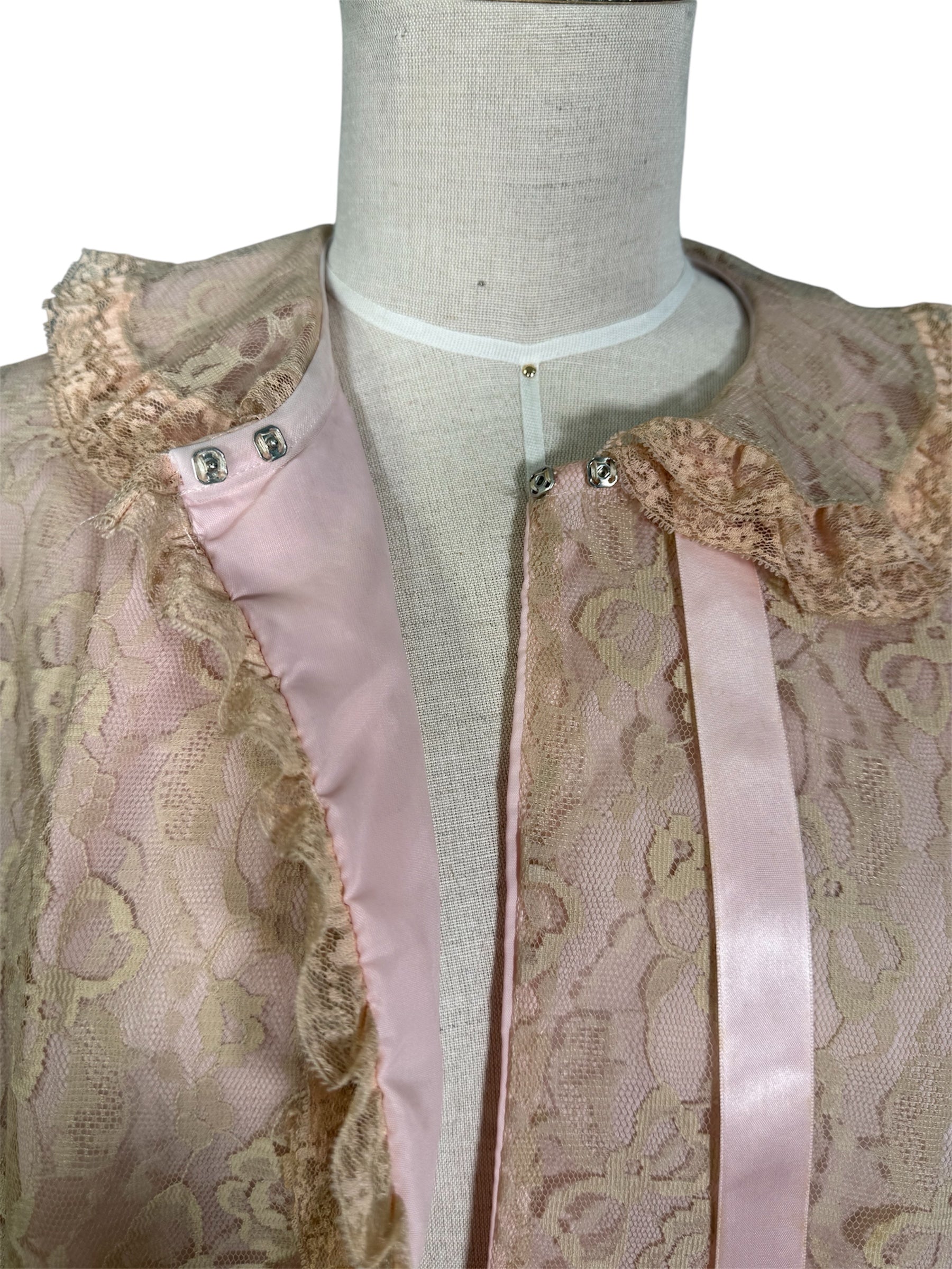 1960s I.Magnin Matej for Odette Barsa bed jacket. This jacket has three fourths sleeves and the material is a pink taffeta with a cream lace overlay. It features pink ribbons on the bottoms of the sleeve and on the front of the piece. It attaches at the collar with two metal snaps. There were no visible condition issues with this piece.