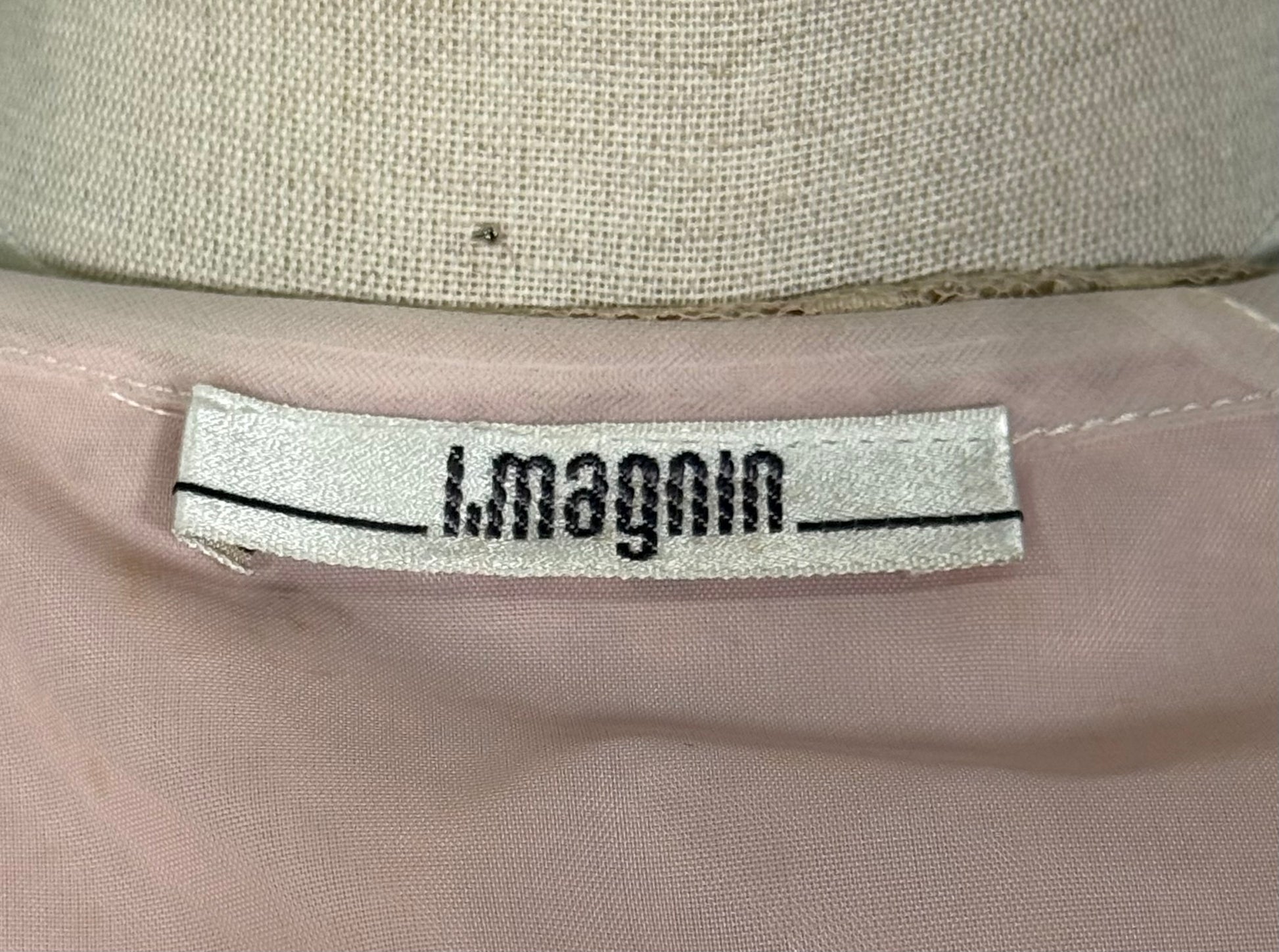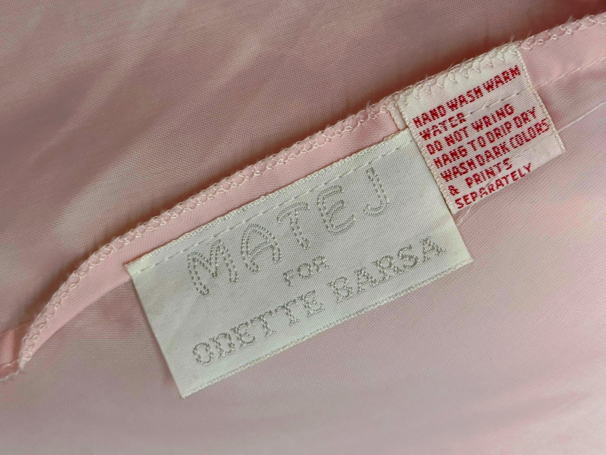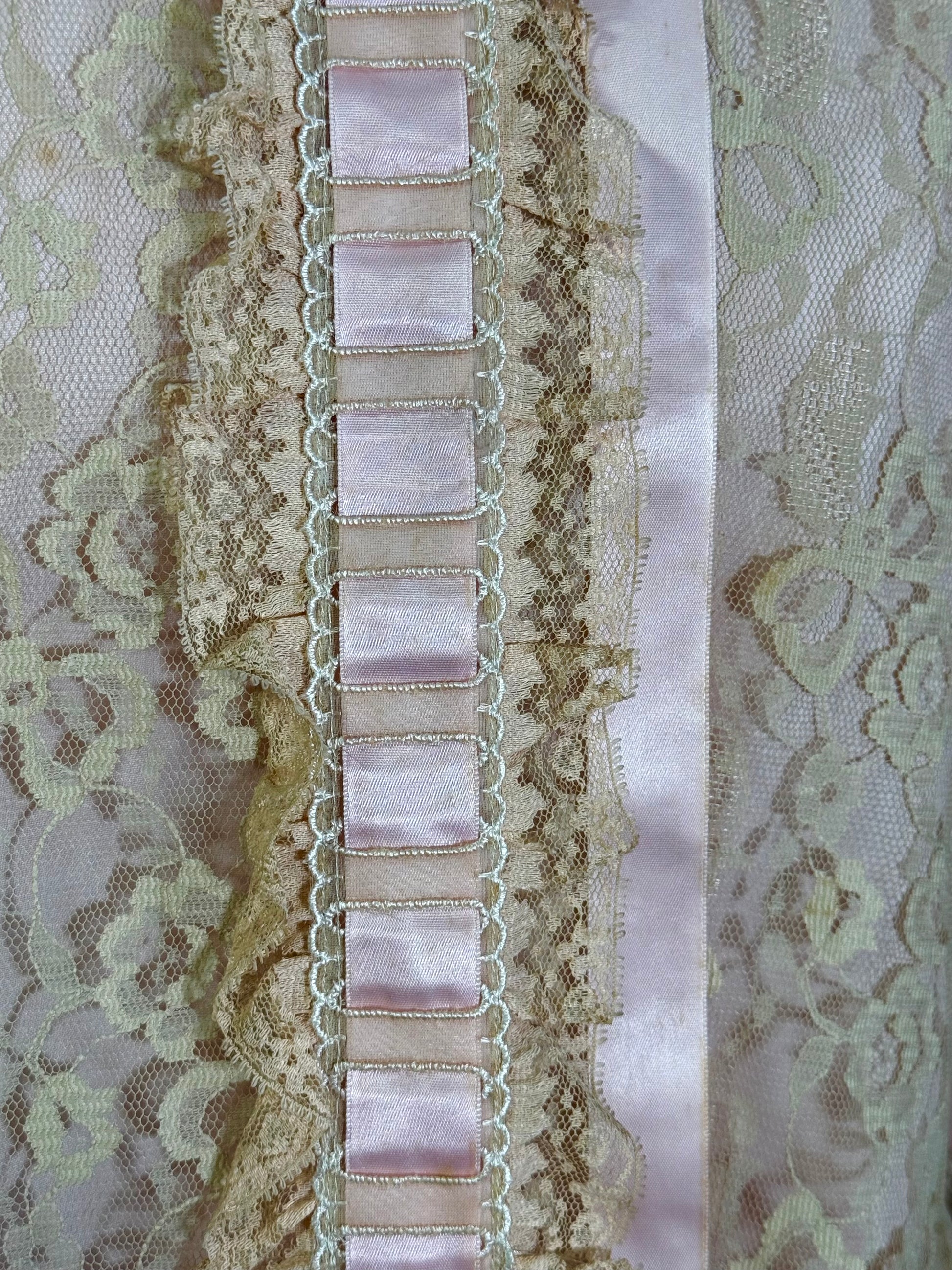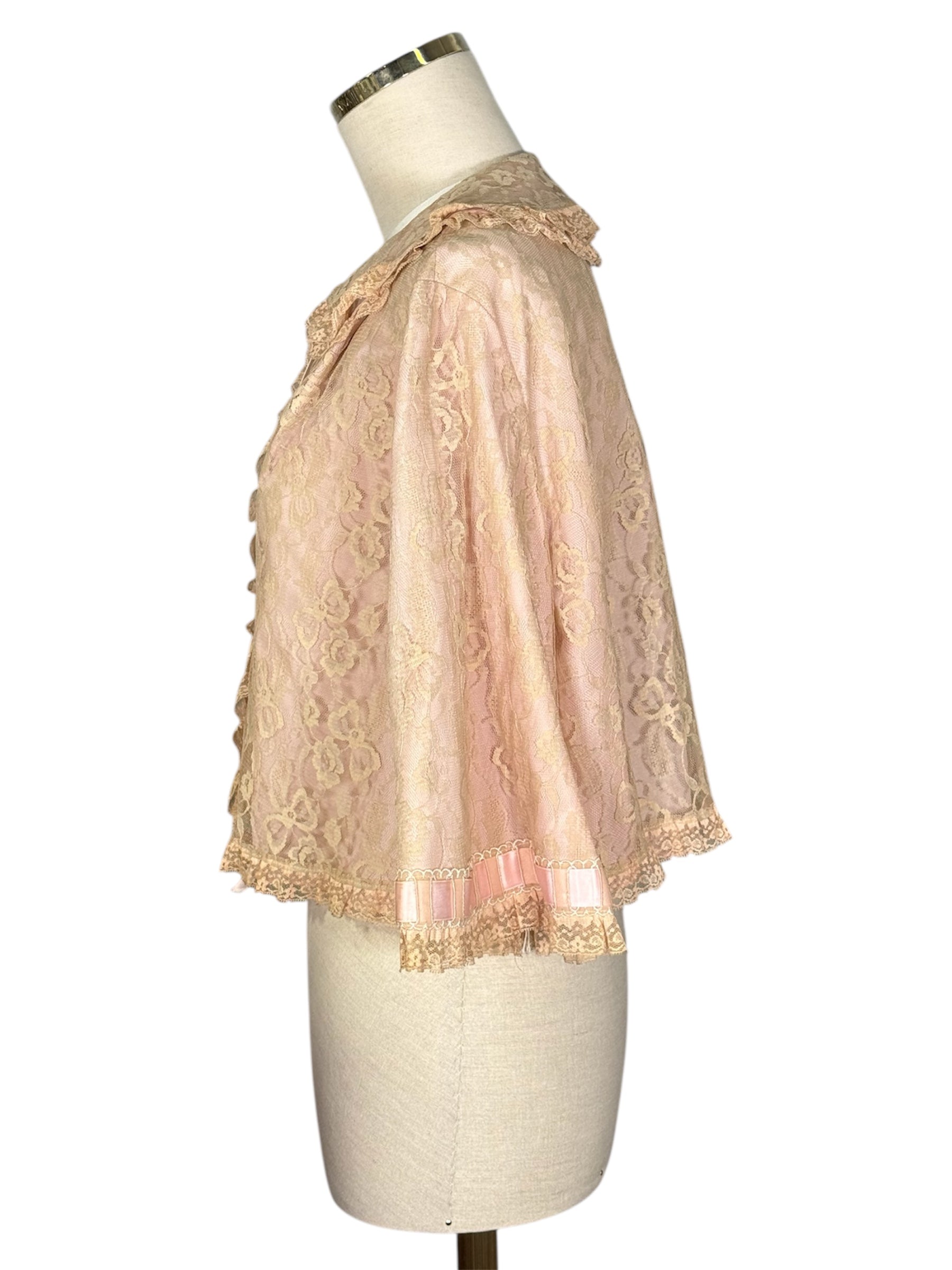1960s I.Magnin Matej for Odette Barsa bed jacket. This jacket has three fourths sleeves and the material is a pink taffeta with a cream lace overlay. It features pink ribbons on the bottoms of the sleeve and on the front of the piece. It attaches at the collar with two metal snaps. There were no visible condition issues with this piece.