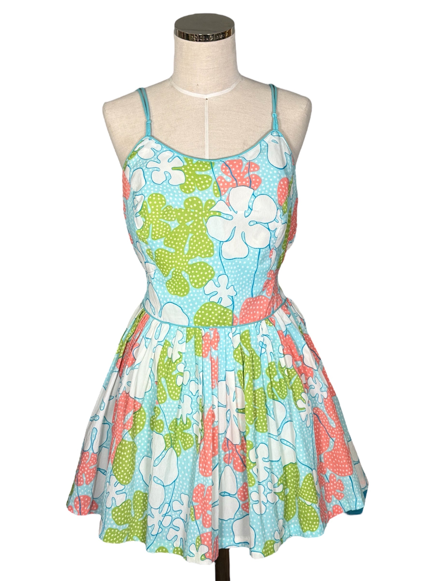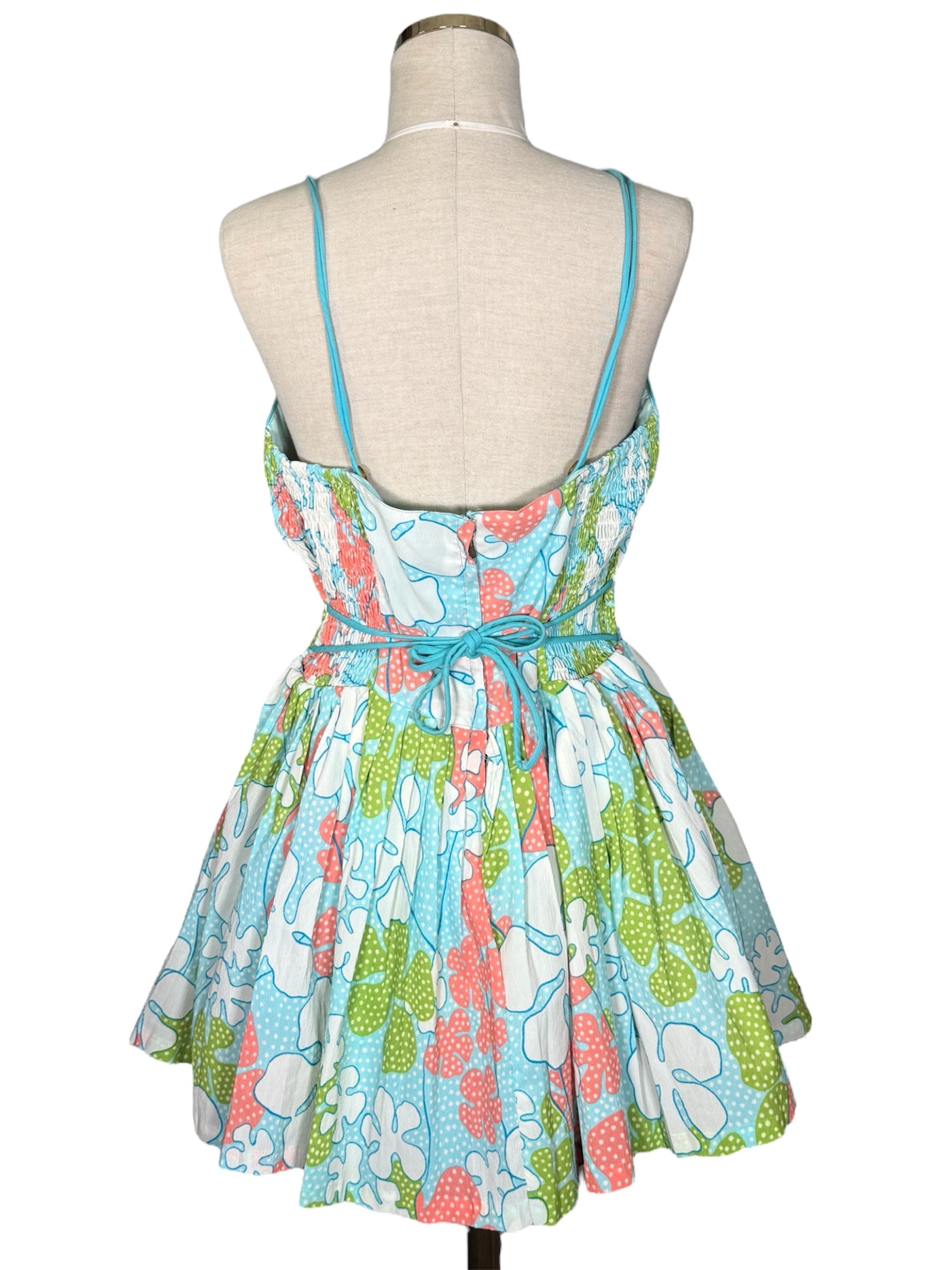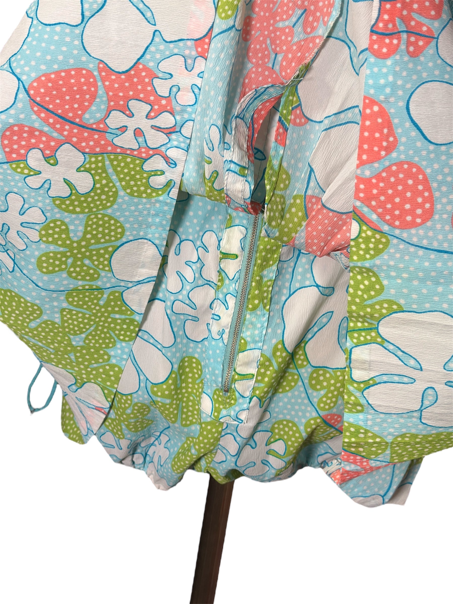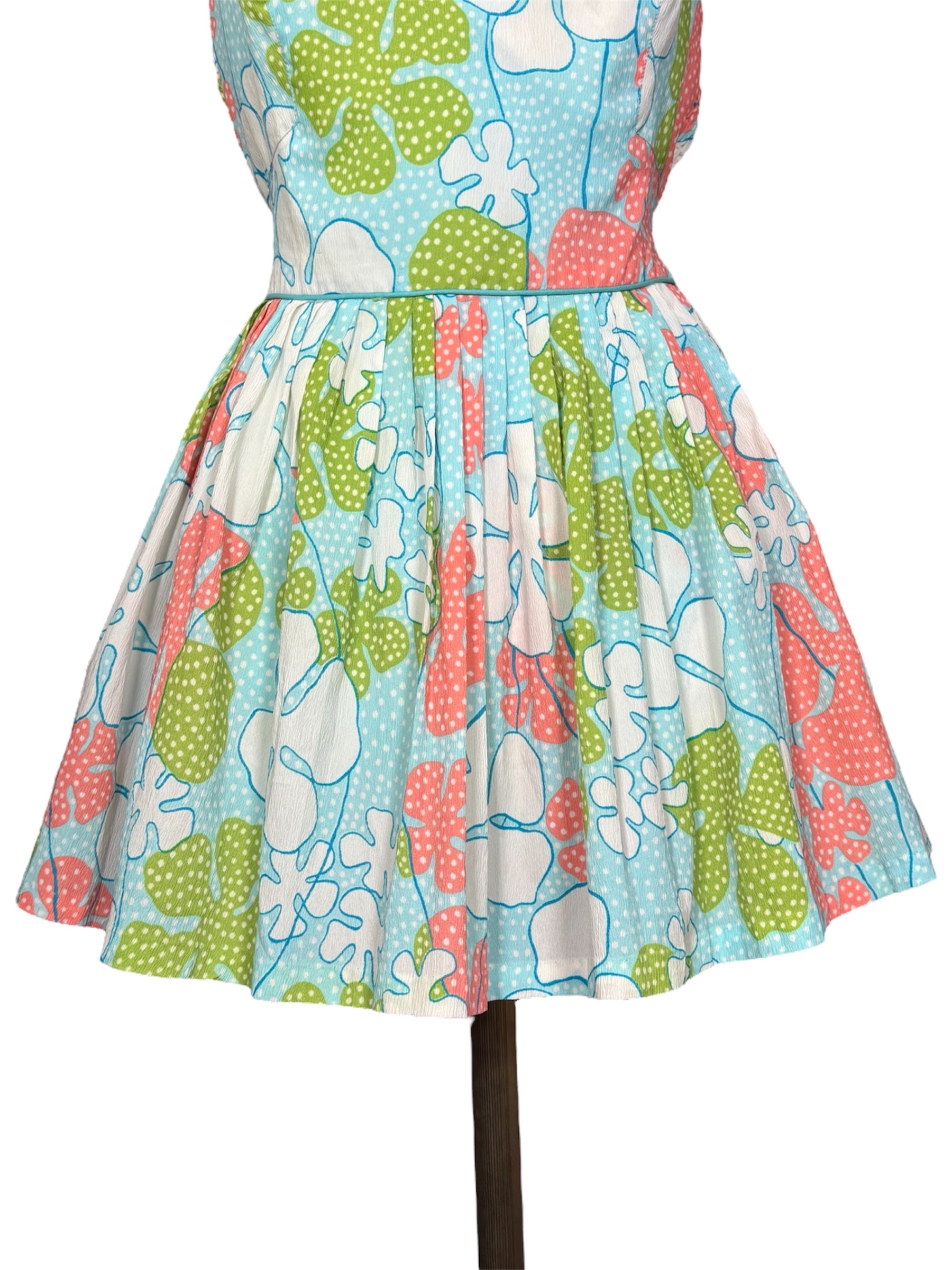 1960s Saks Fifth Avenue playsuit. This floral outfit features a mini skirt with loose shorts underneath. The playsuit has blue, green, pink, and white colors. It has spaghetti straps and a sweetheart neckline. It attaches at the back with a metal zipper and string that can be tied into a bow. This piece has a faded union tag sewn into it, visible in the second to last photo. There were no visible condition issues with this piece.