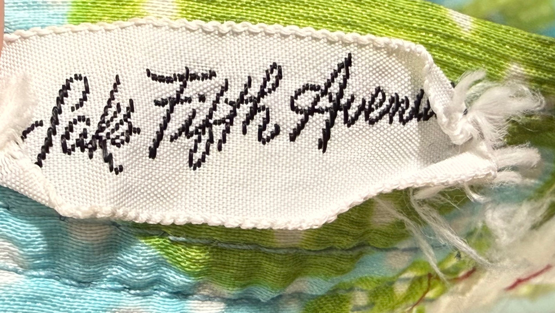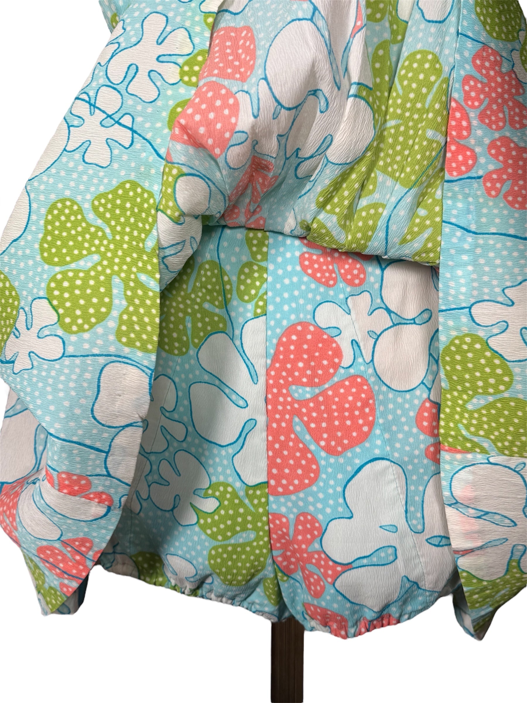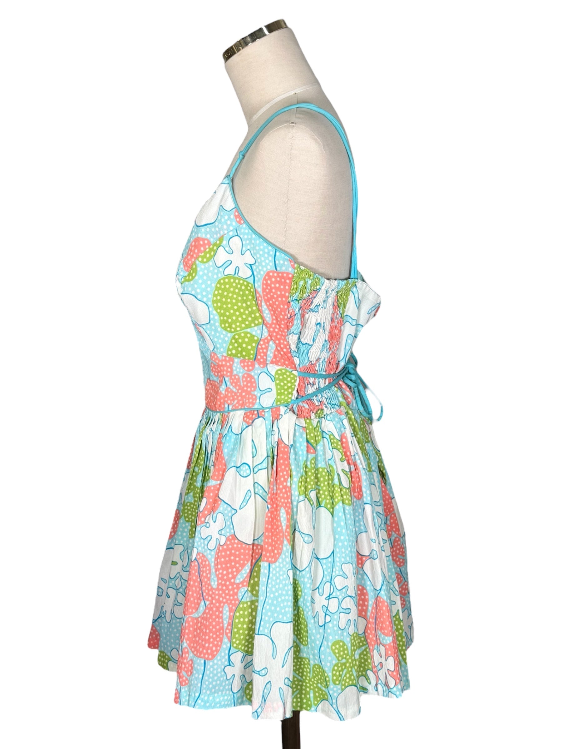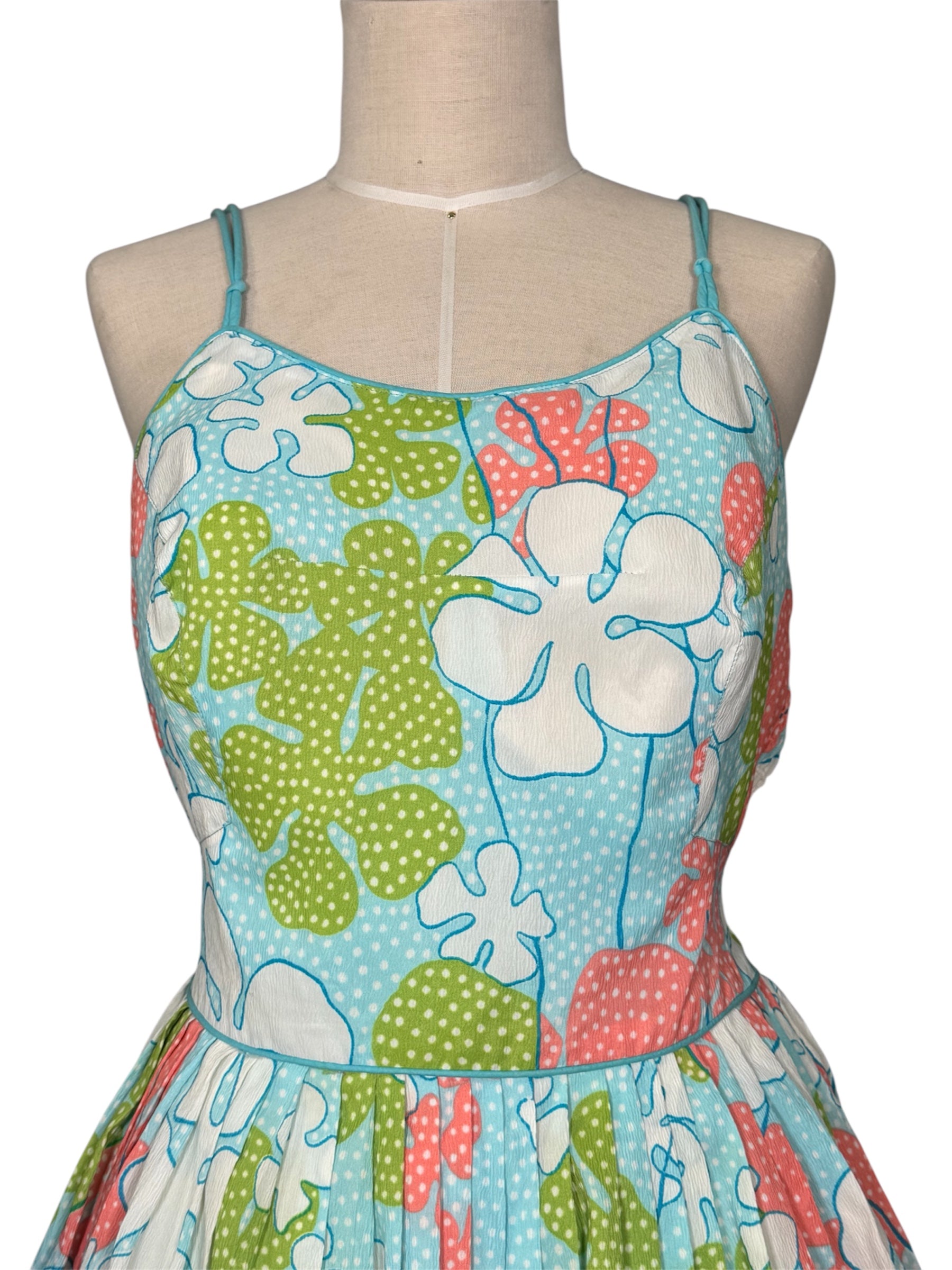 1960s Saks Fifth Avenue playsuit. This floral outfit features a mini skirt with loose shorts underneath. The playsuit has blue, green, pink, and white colors. It has spaghetti straps and a sweetheart neckline. It attaches at the back with a metal zipper and string that can be tied into a bow. This piece has a faded union tag sewn into it, visible in the second to last photo. There were no visible condition issues with this piece.