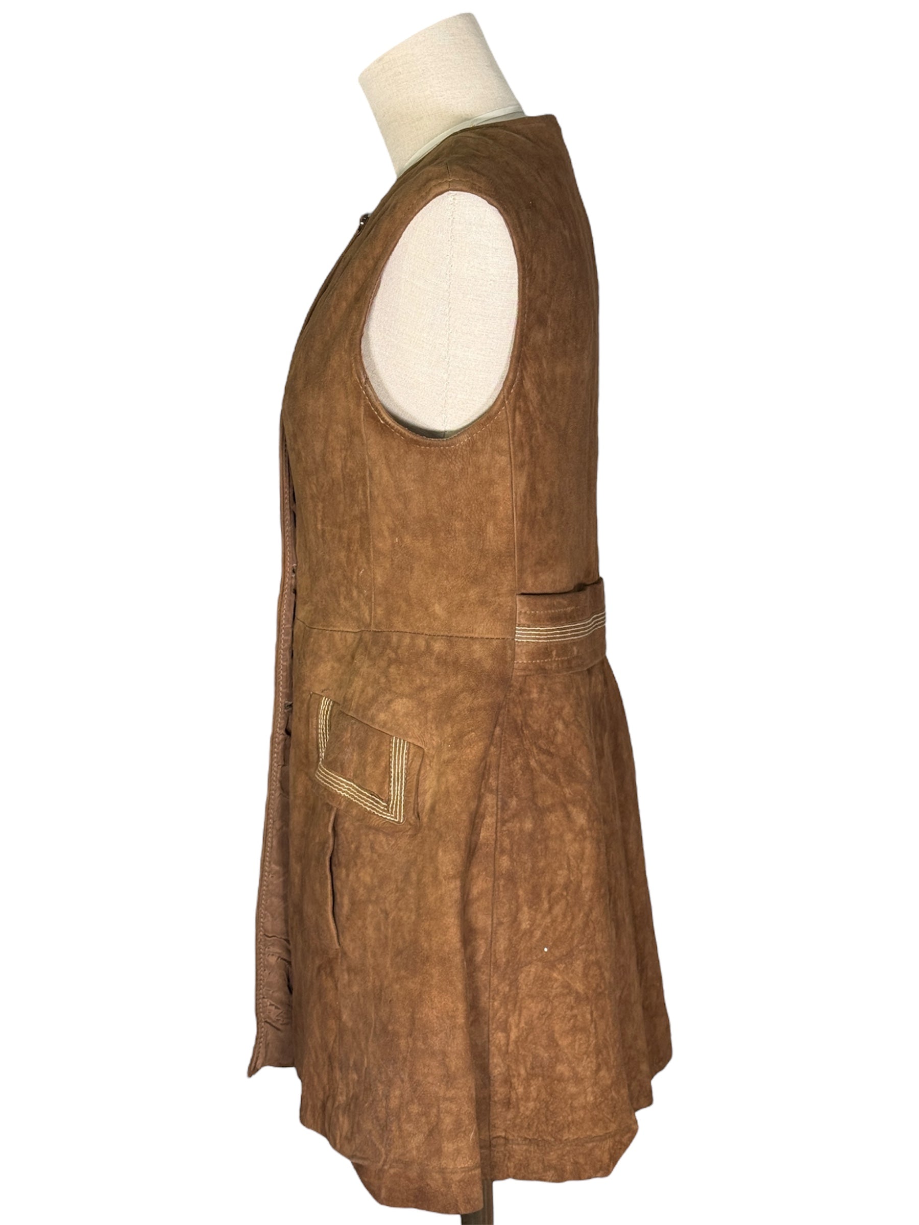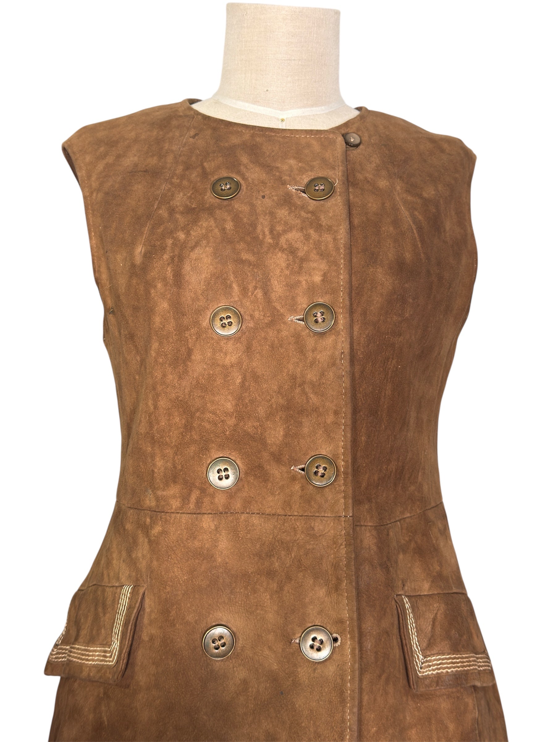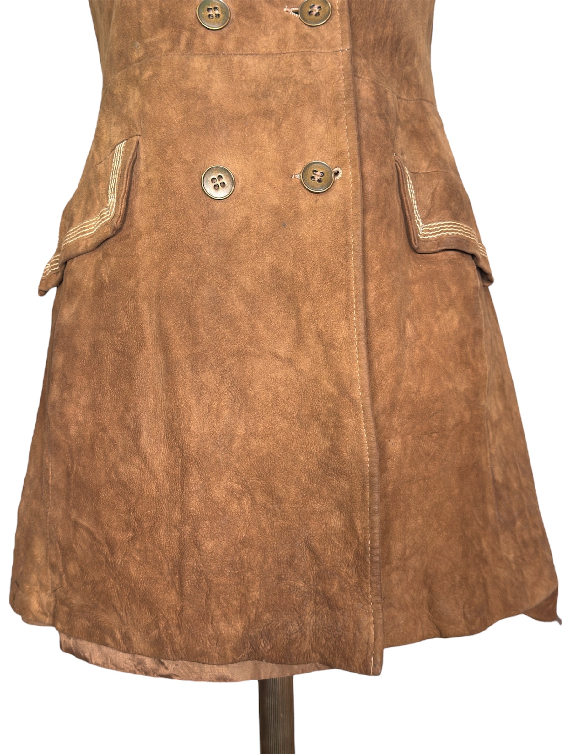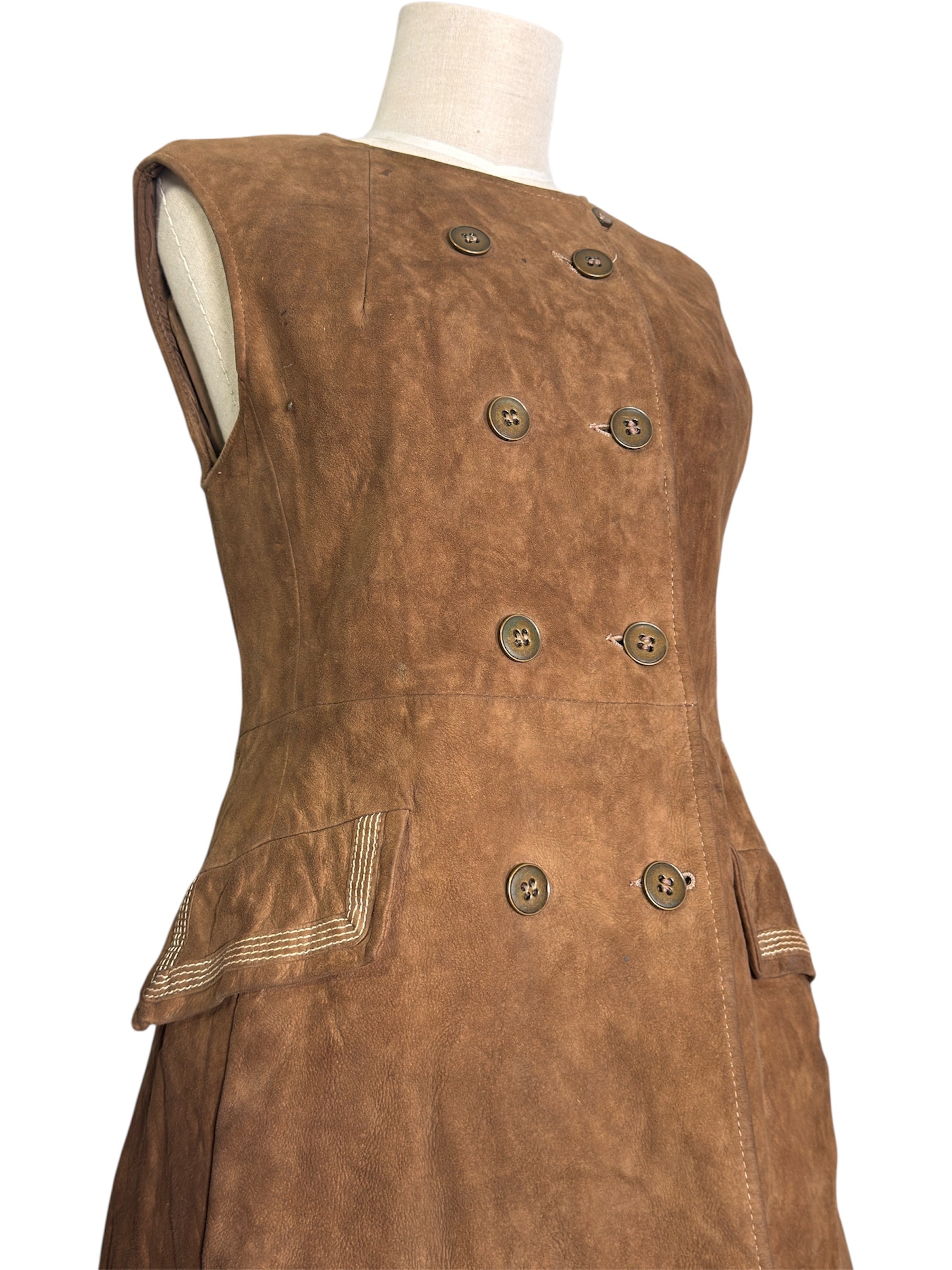 1960s Saks Fifth Avenue mini dress. This sleeveless dress is made of suede leather and features two rows of buttons on the front, along with pockets on the front of either hip. There is band of striped leather across the back. It attaches with the buttons at the front, along with one semi-hidden, mini button by the collar. There is a slight condition issues with this piece. The lining of the dress is hanging a bit lower than the leather, visible in the photo of the back of the dress and the front of the dress. There is also two small marks on the top of the front of the dress, visible in the last photo.
