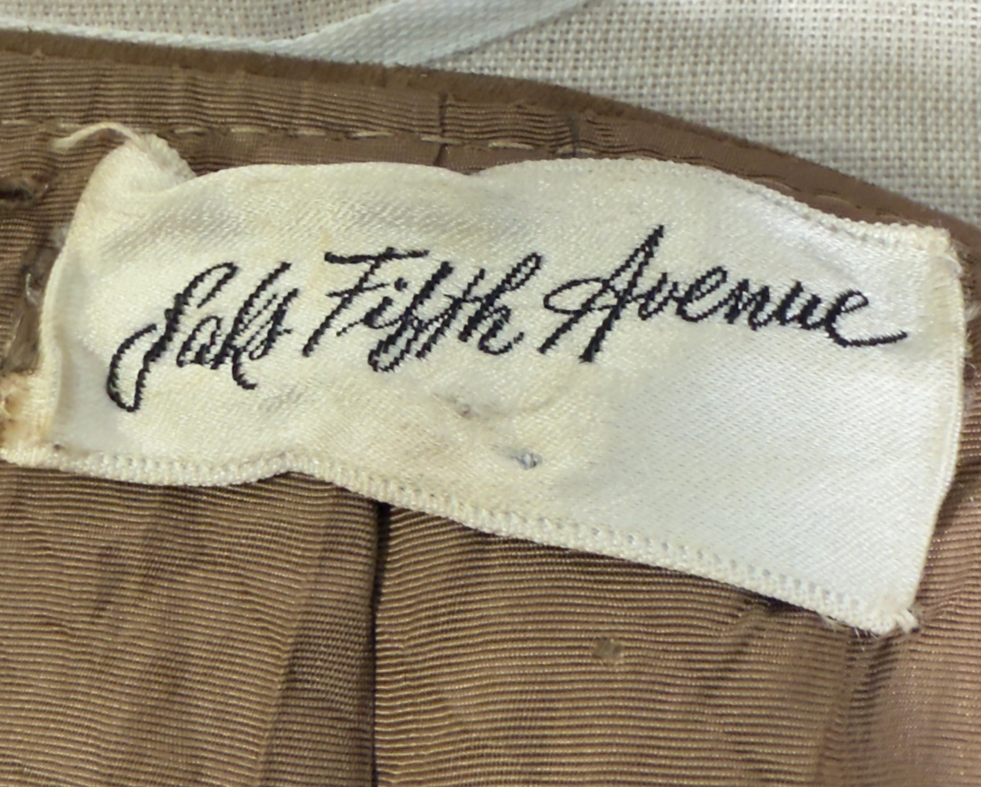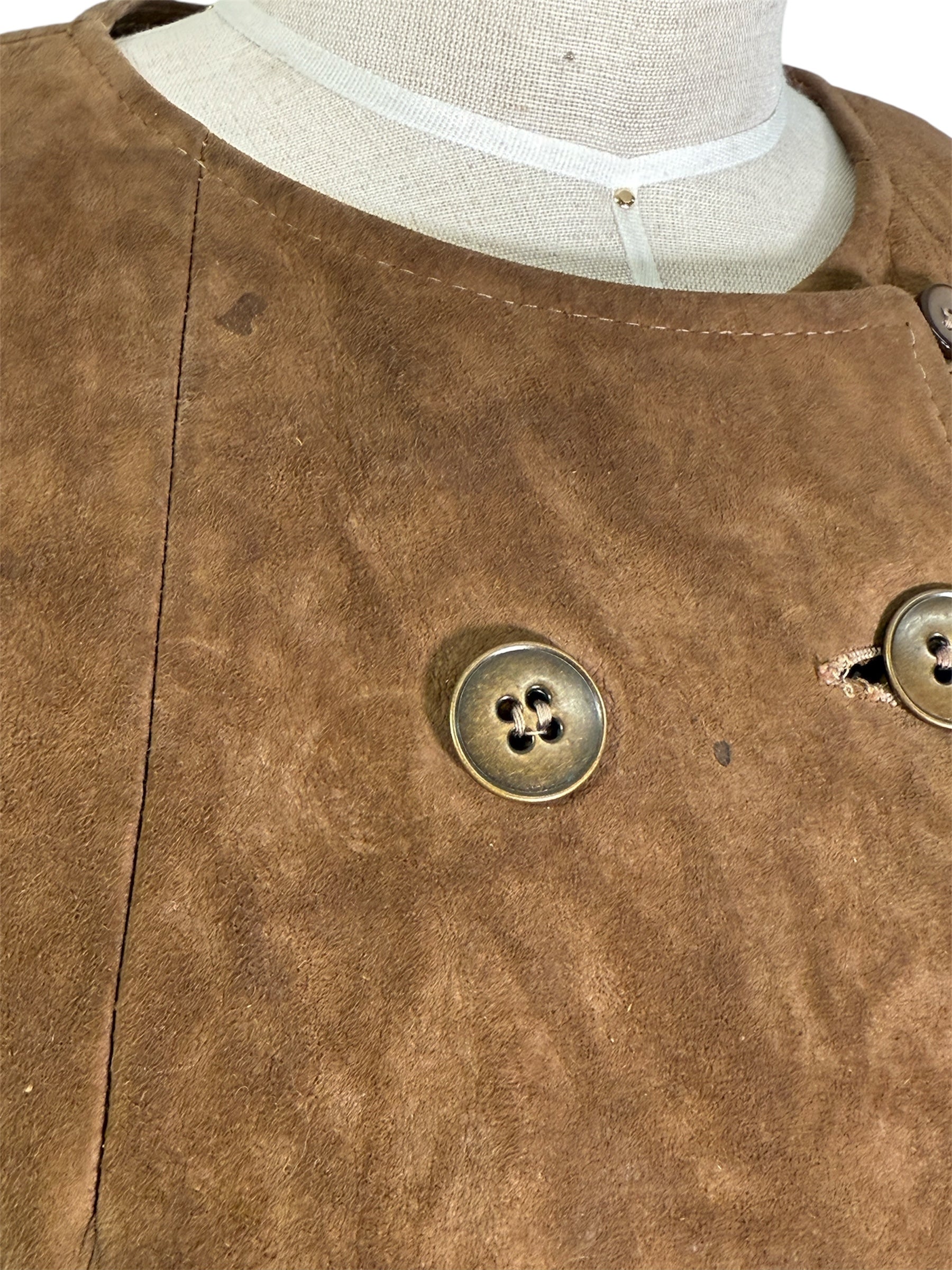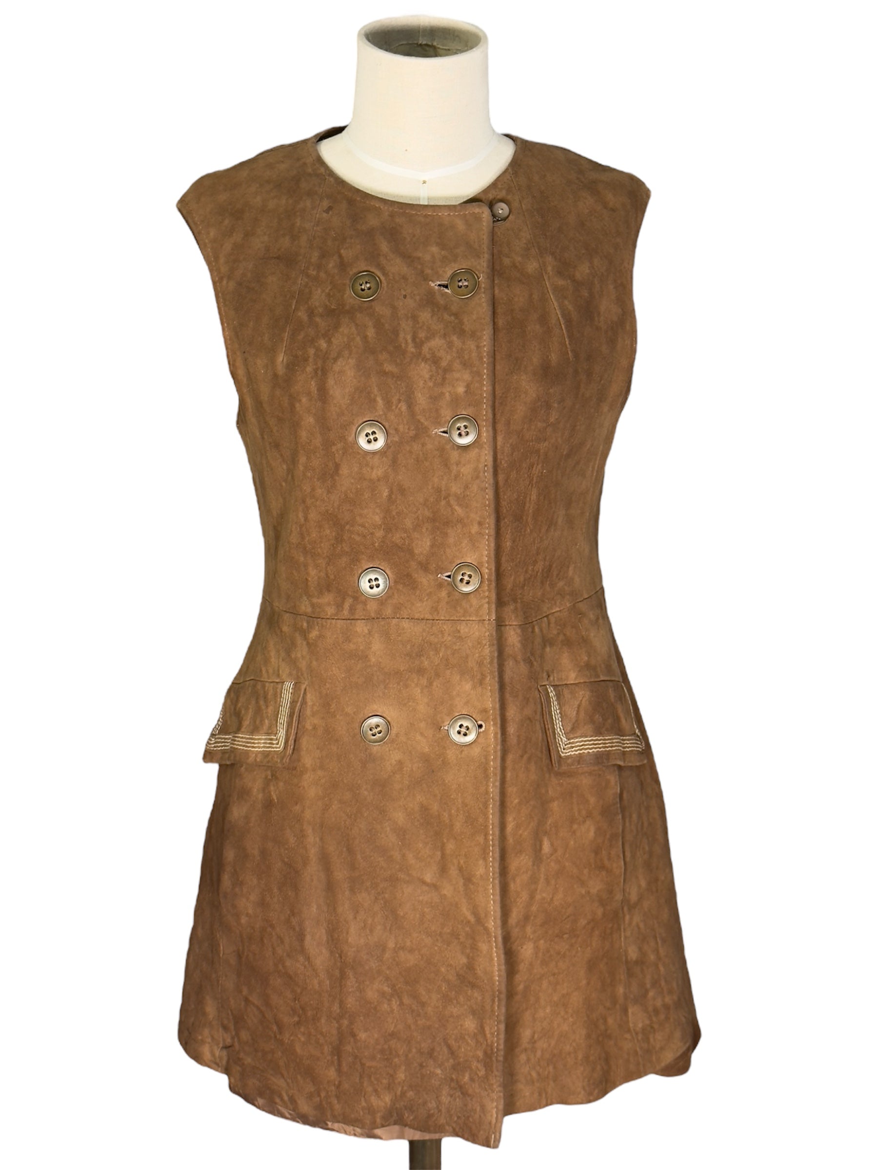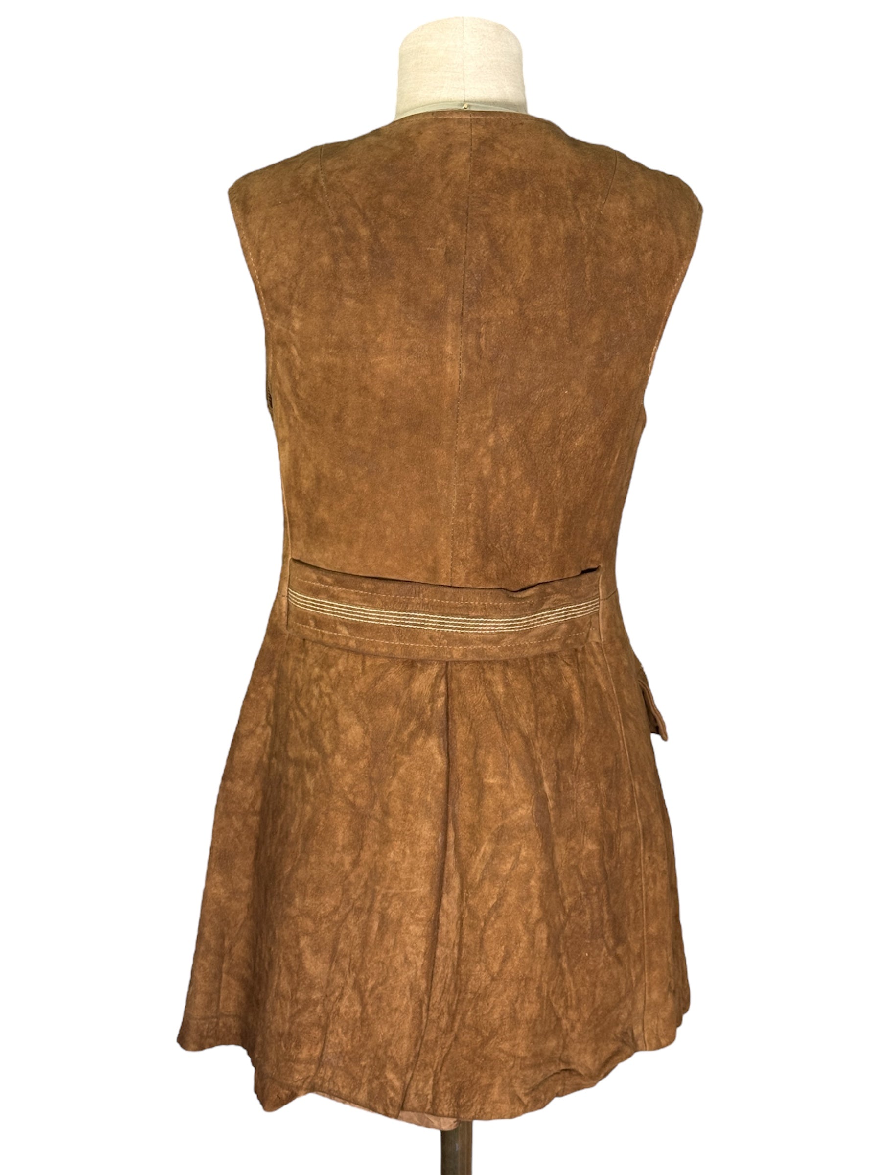 1960s Saks Fifth Avenue mini dress. This sleeveless dress is made of suede leather and features two rows of buttons on the front, along with pockets on the front of either hip. There is band of striped leather across the back. It attaches with the buttons at the front, along with one semi-hidden, mini button by the collar. There is a slight condition issues with this piece. The lining of the dress is hanging a bit lower than the leather, visible in the photo of the back of the dress and the front of the dress. There is also two small marks on the top of the front of the dress, visible in the last photo.