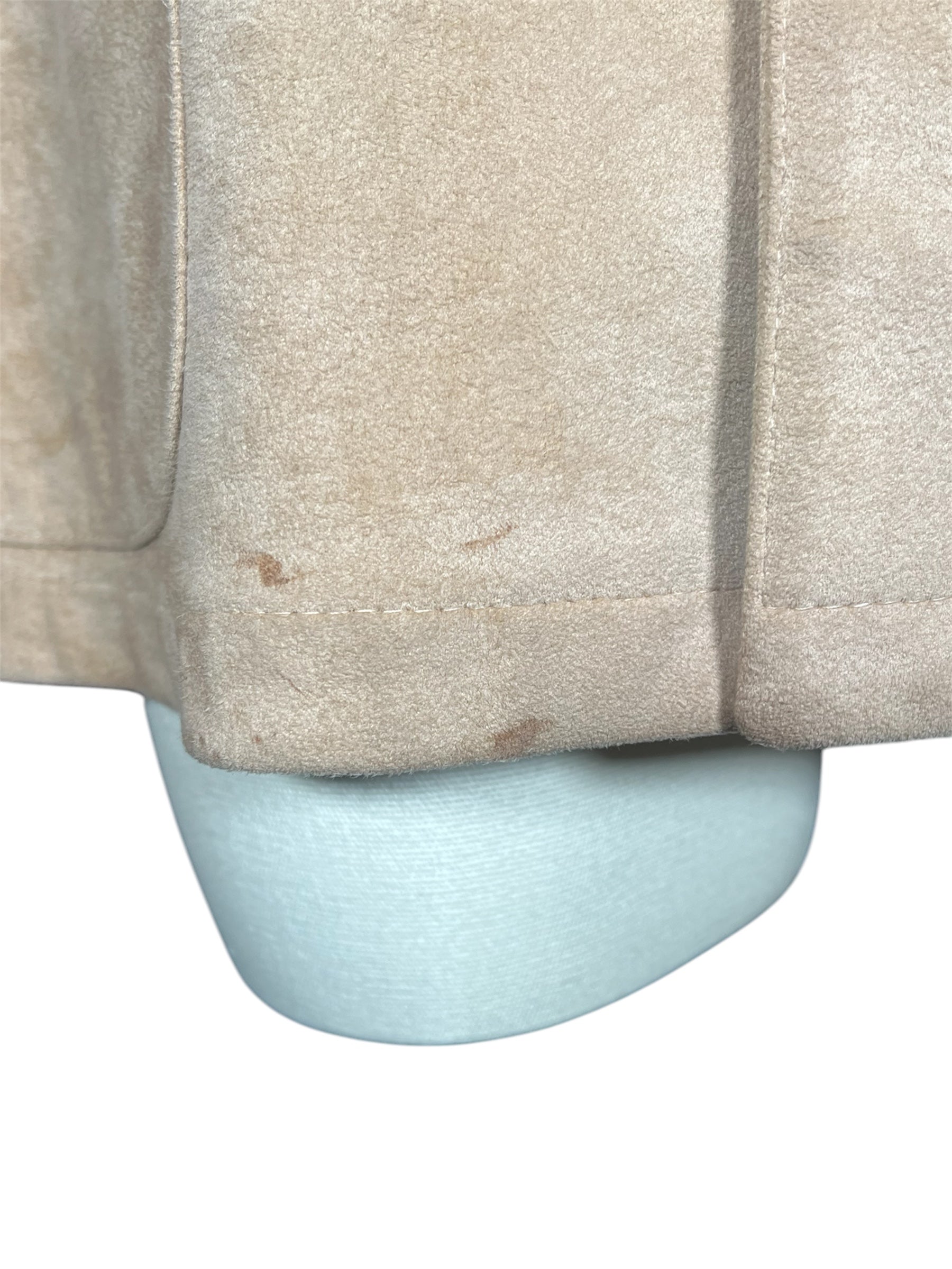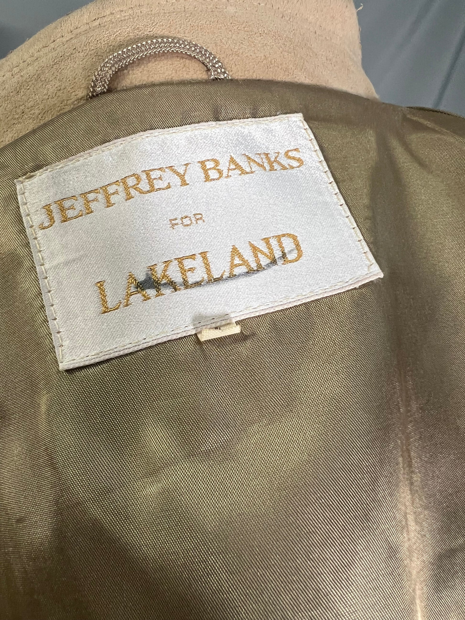 1970s/1980s Jeffrey Banks for Lakeland ultra suede coat. This tan faux suede blazer features three button closures on the front. It also has two pockets on either hip. There are two slight condition issues, pictured in the last two photos. There are a couple marks on the bottom front of the jacket and there is some wear on the the inside of the collar.