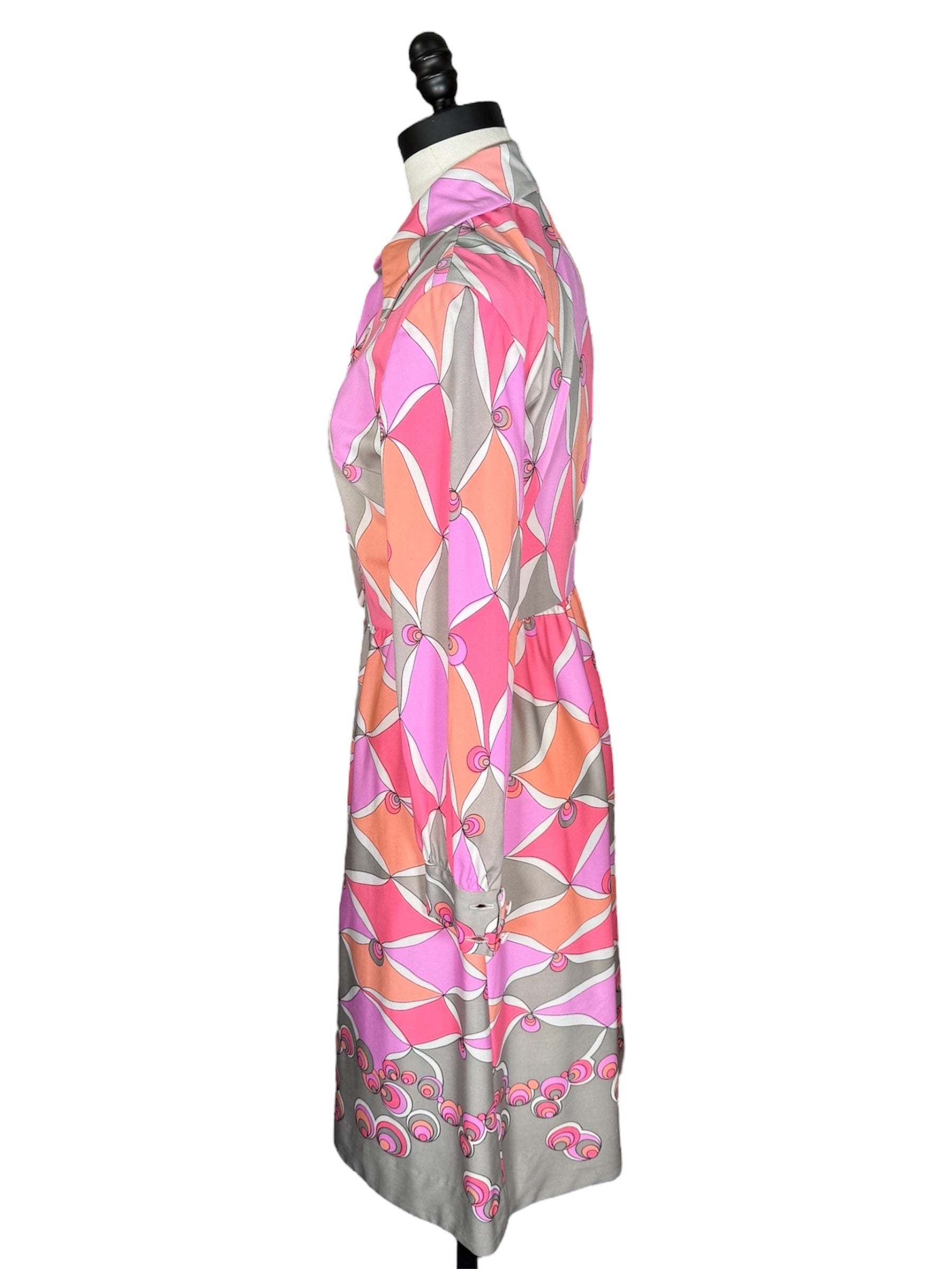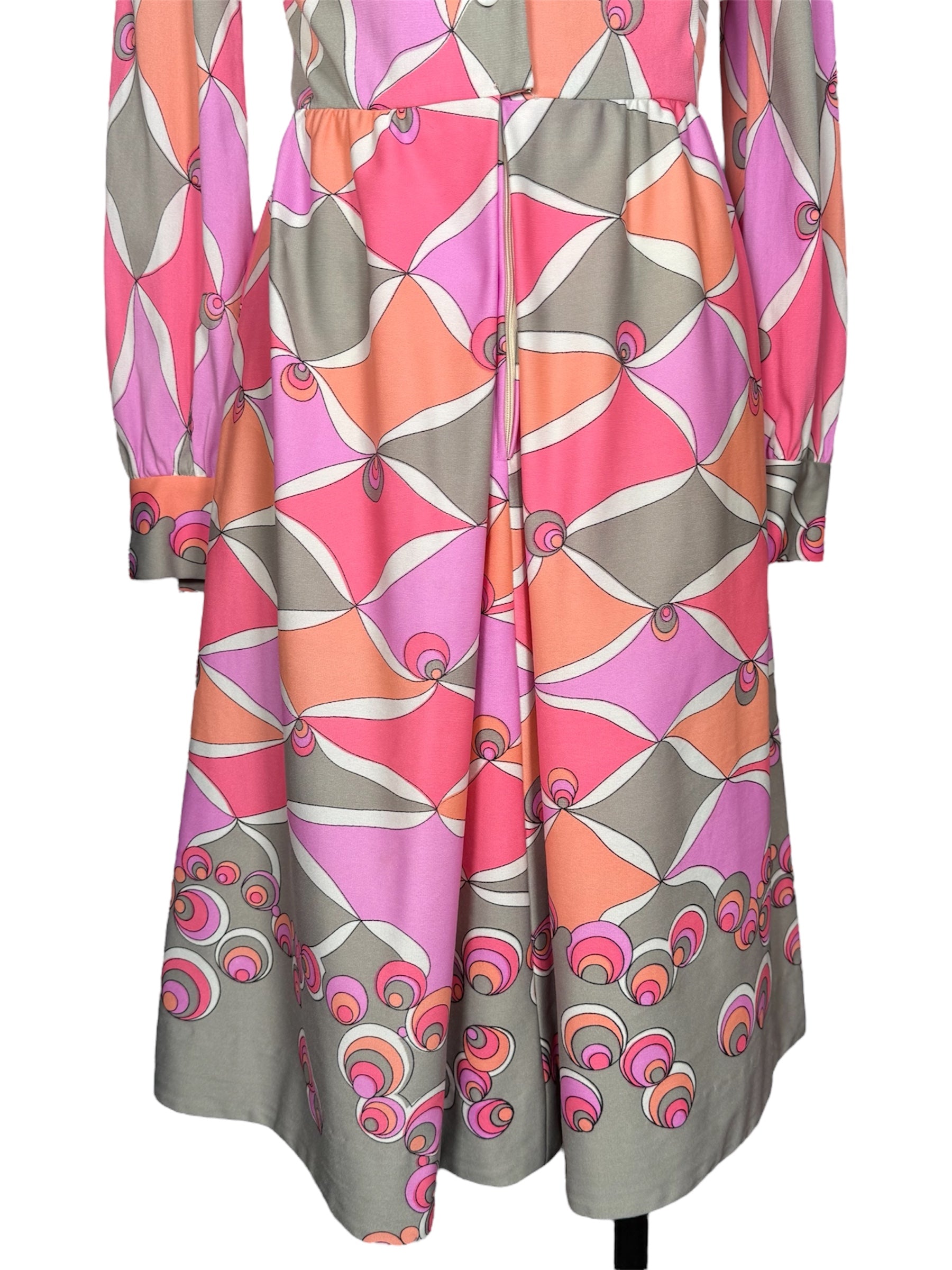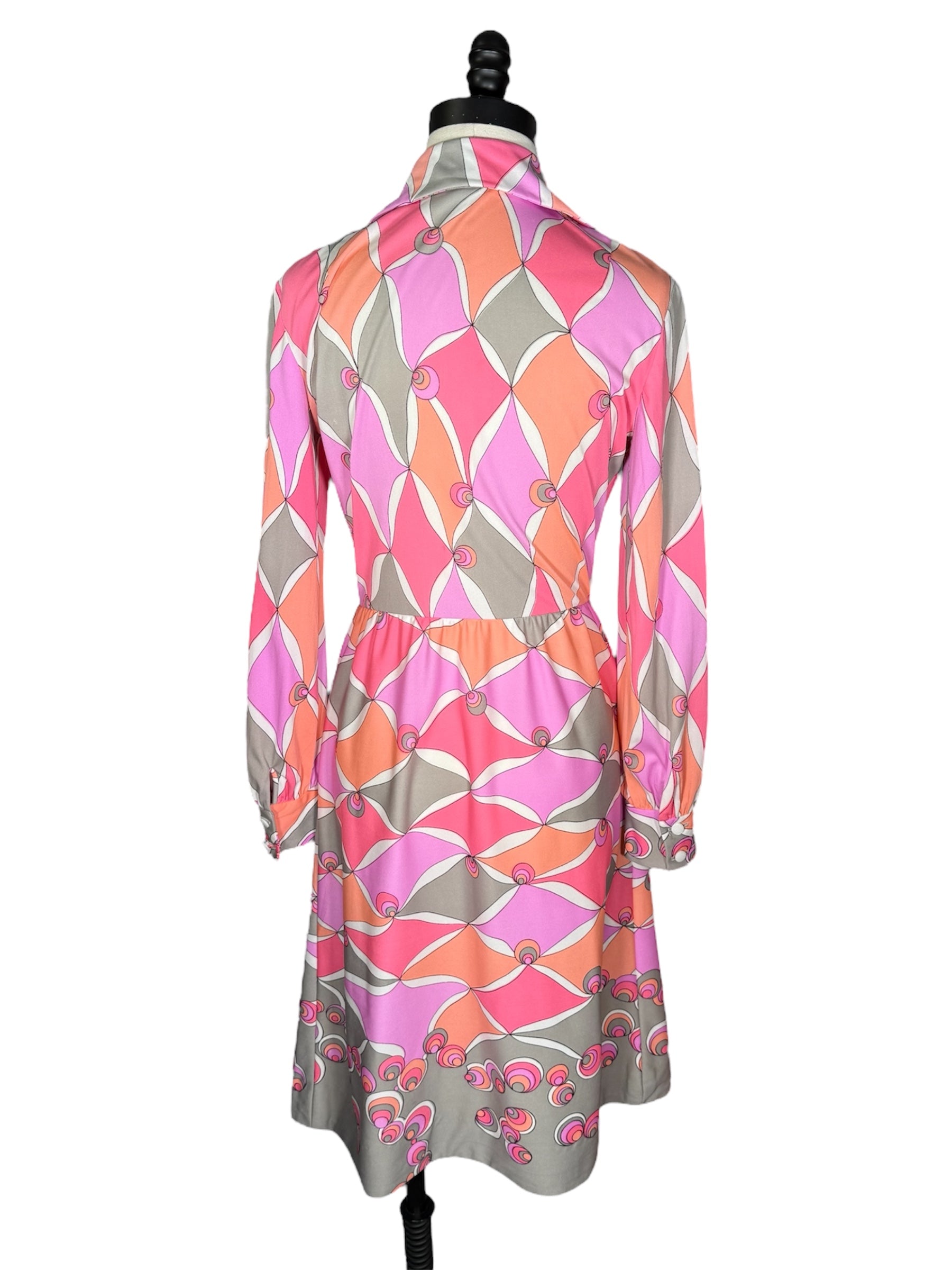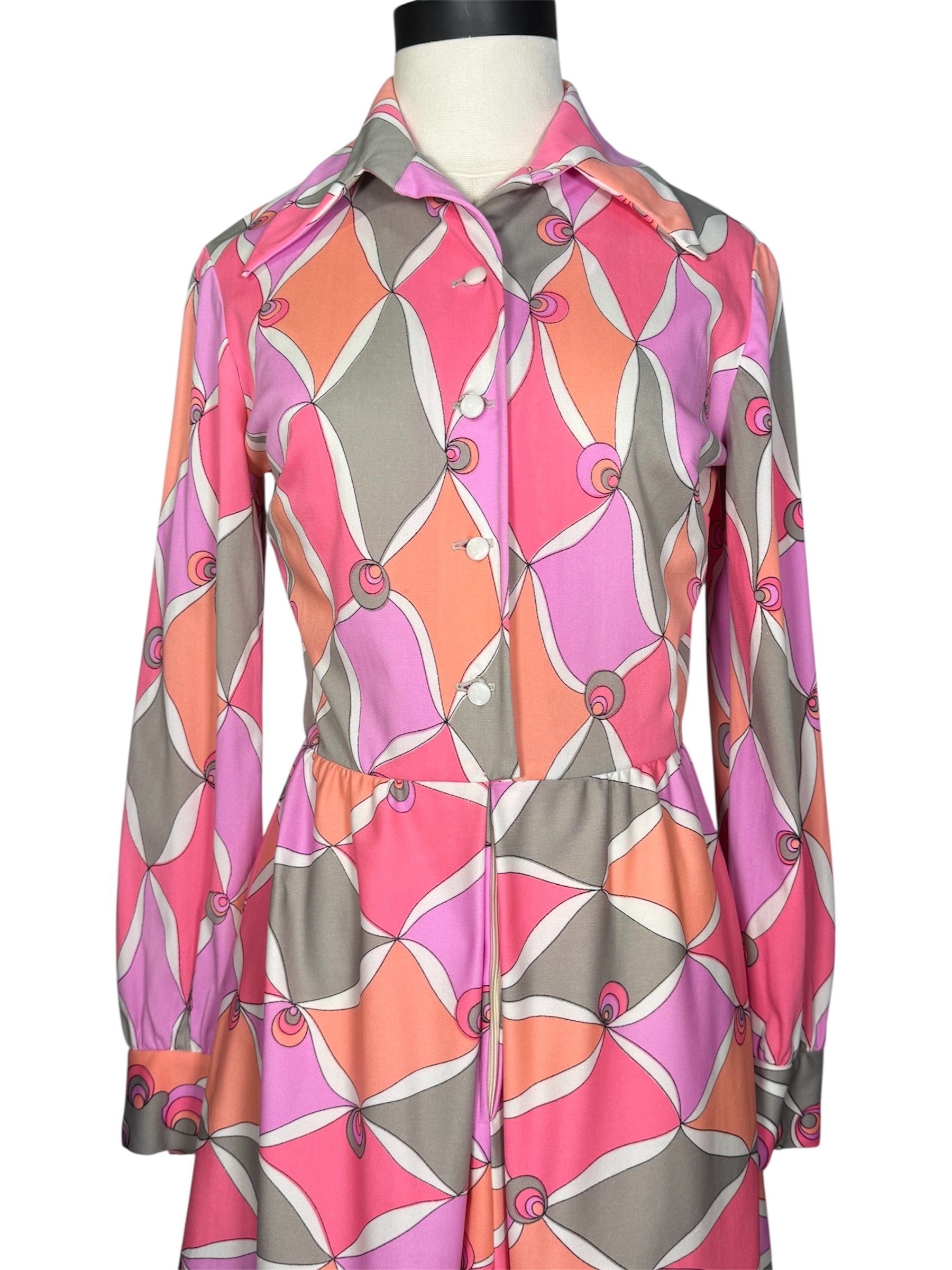 1970s abstract, unlabeled dress. This dress features pink, orange, gray, and white colors. It has long sleeves, a dagger collar, and a skirt with draping in the middle. It attaches at the front with white buttons and then a zipper going down the skirt. The material of the dress is polyester. There was no noticed flaws in this piece.