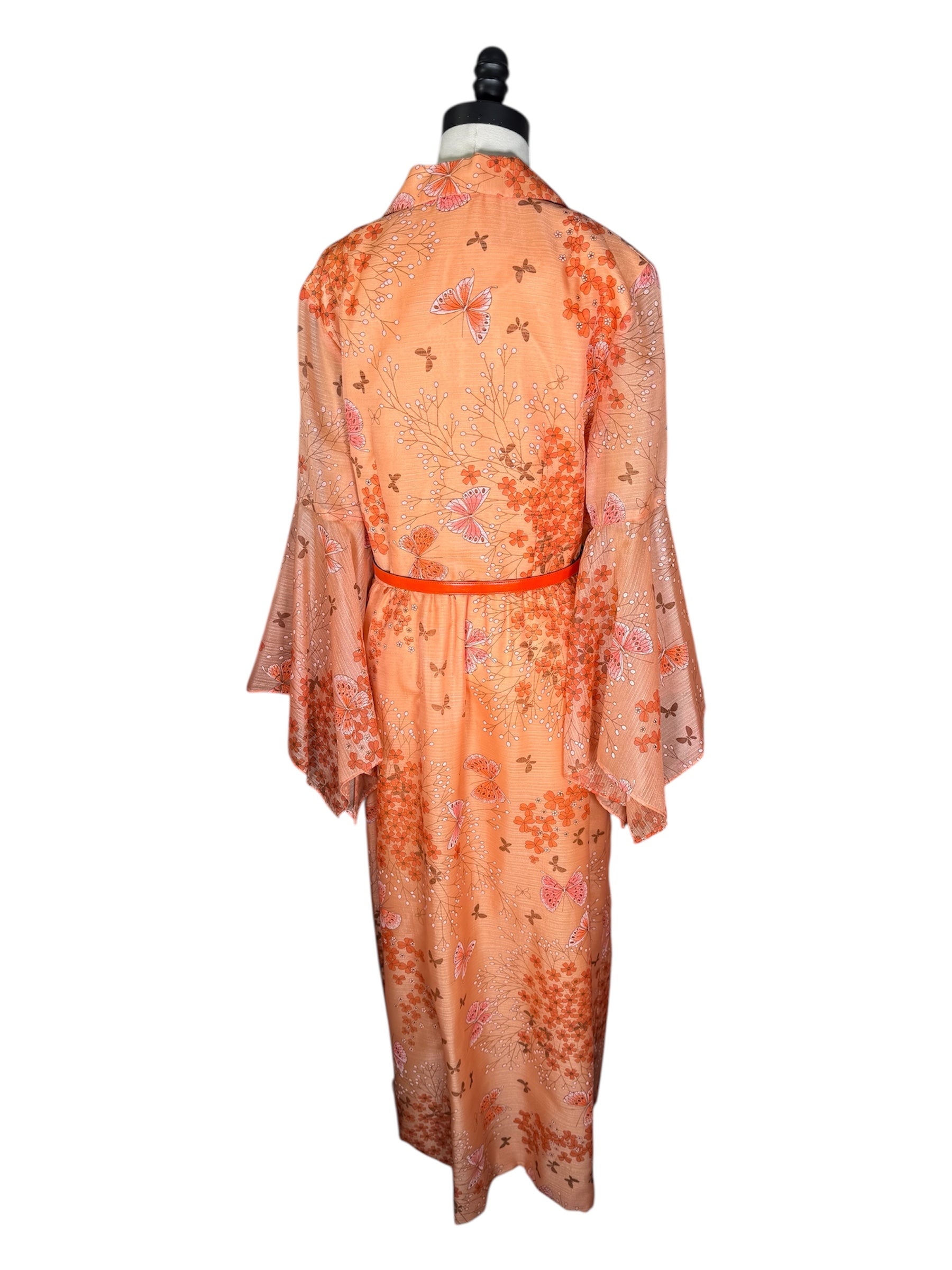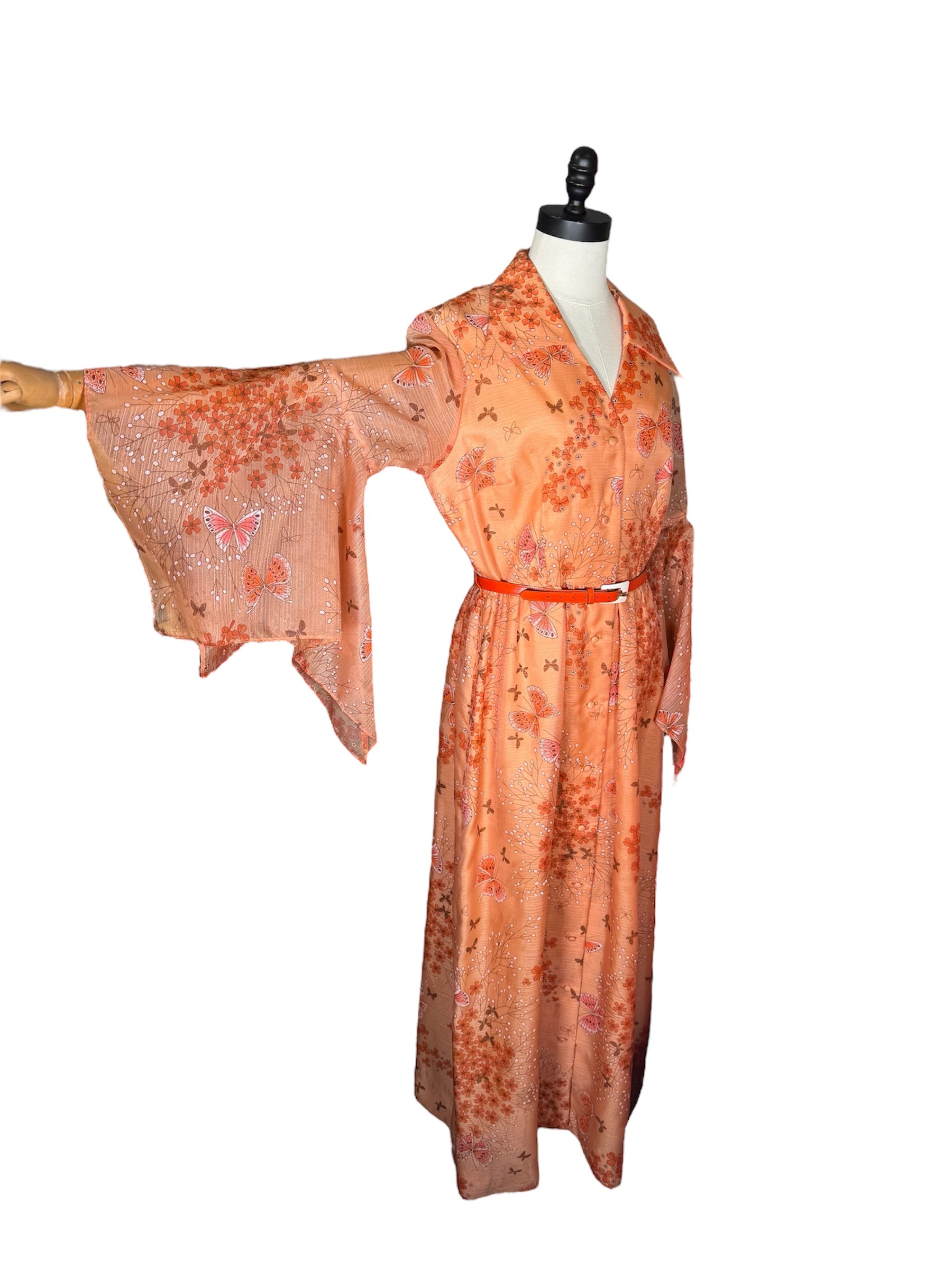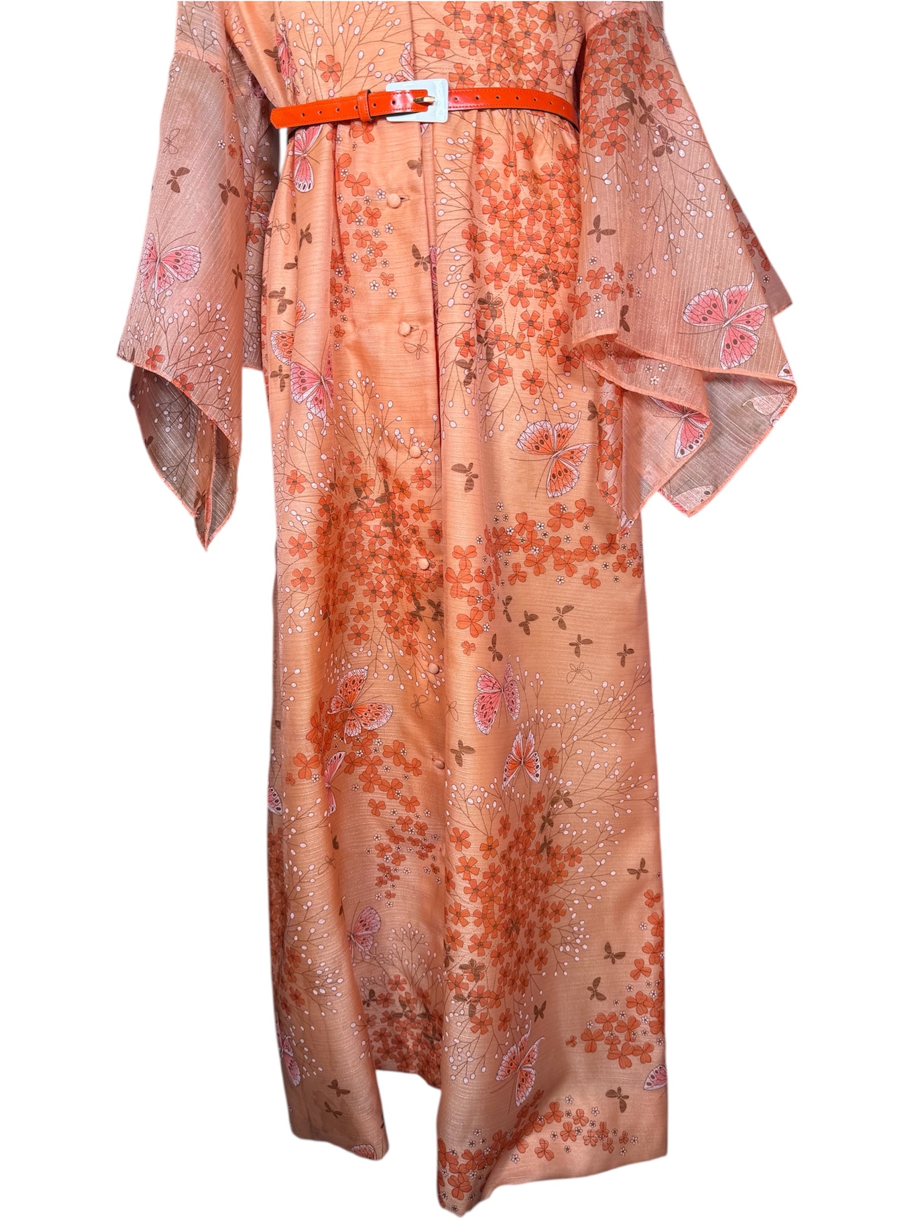 1970s Alfred Shaheen dress. This long, floral dress features orange and pink colors and butterflies. The dress has flowing butterfly, bell sleeves, a dagger collar, and comes with the original belt. It secures at the front with buttons starting at the bottom of the v-neck and going down the dress. There is also one hidden hook and eye closure in the middle of the buttons. This piece is in excellent condition!