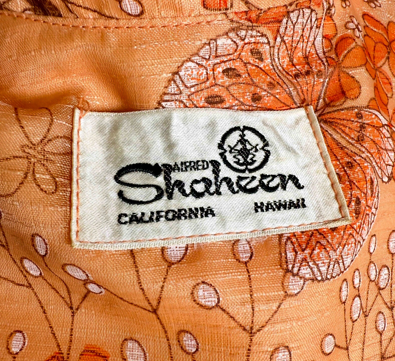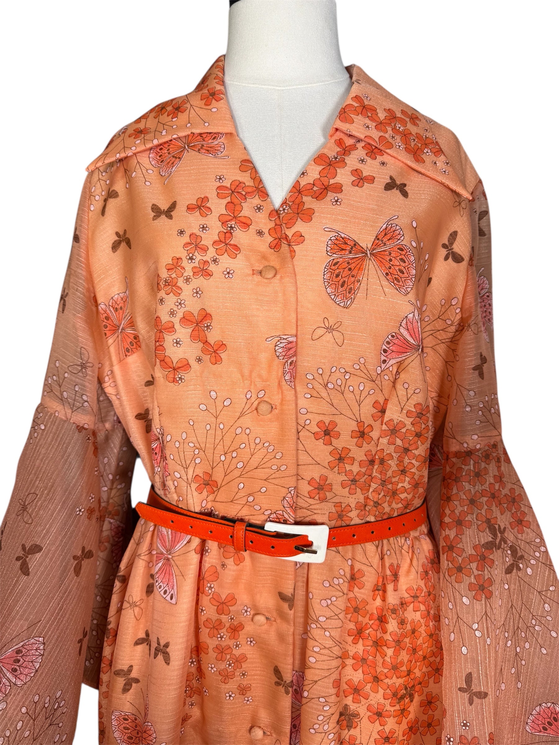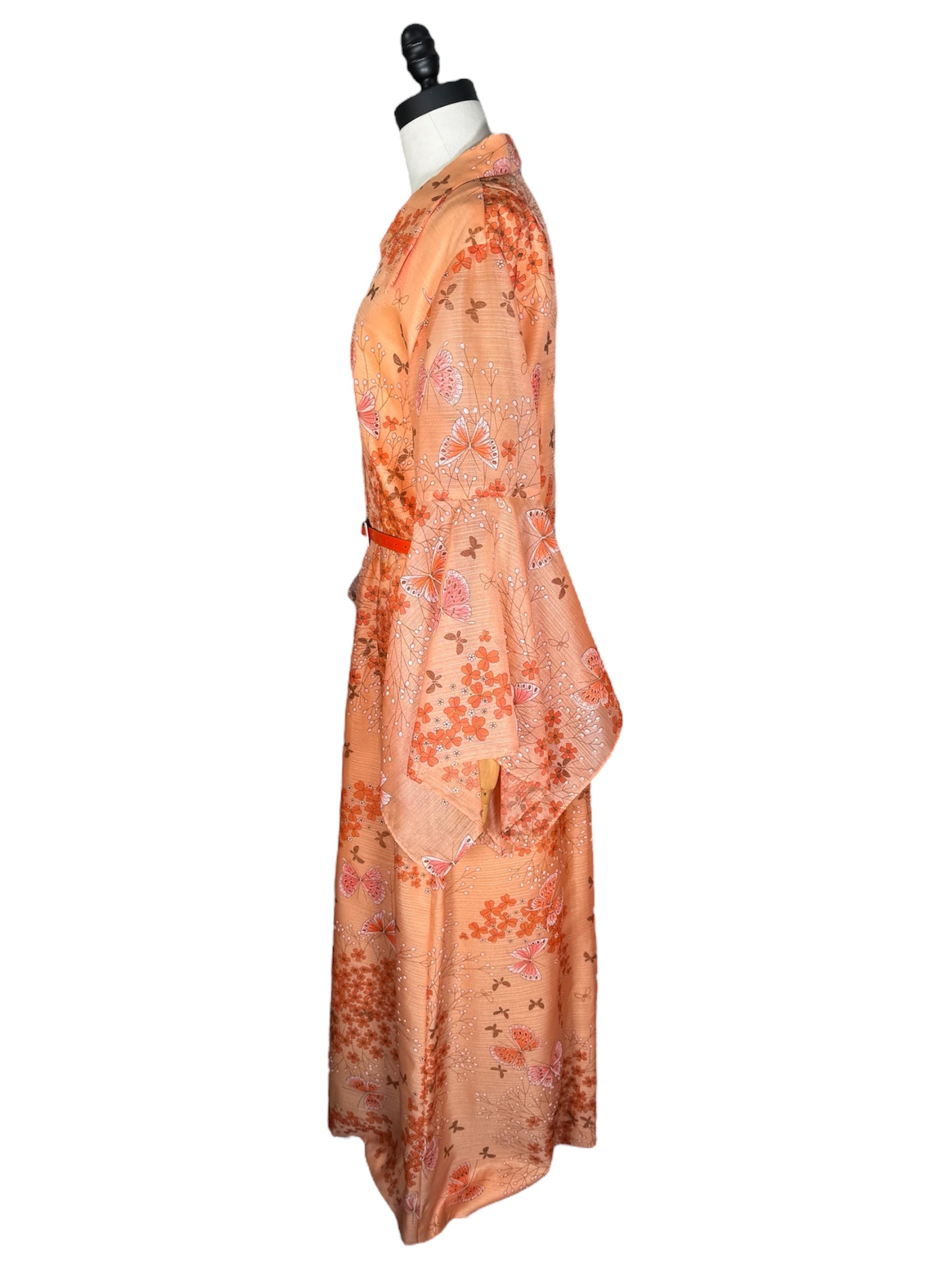 1970s Alfred Shaheen dress. This long, floral dress features orange and pink colors and butterflies. The dress has flowing butterfly, bell sleeves, a dagger collar, and comes with the original belt. It secures at the front with buttons starting at the bottom of the v-neck and going down the dress. There is also one hidden hook and eye closure in the middle of the buttons. This piece is in excellent condition!