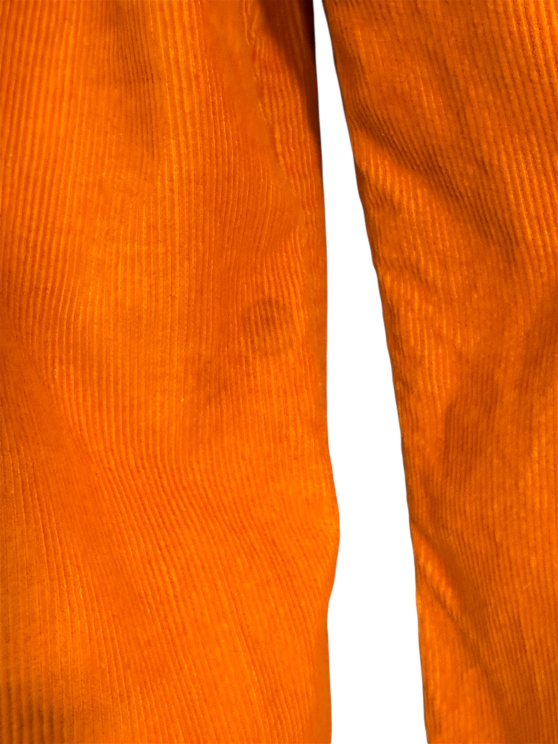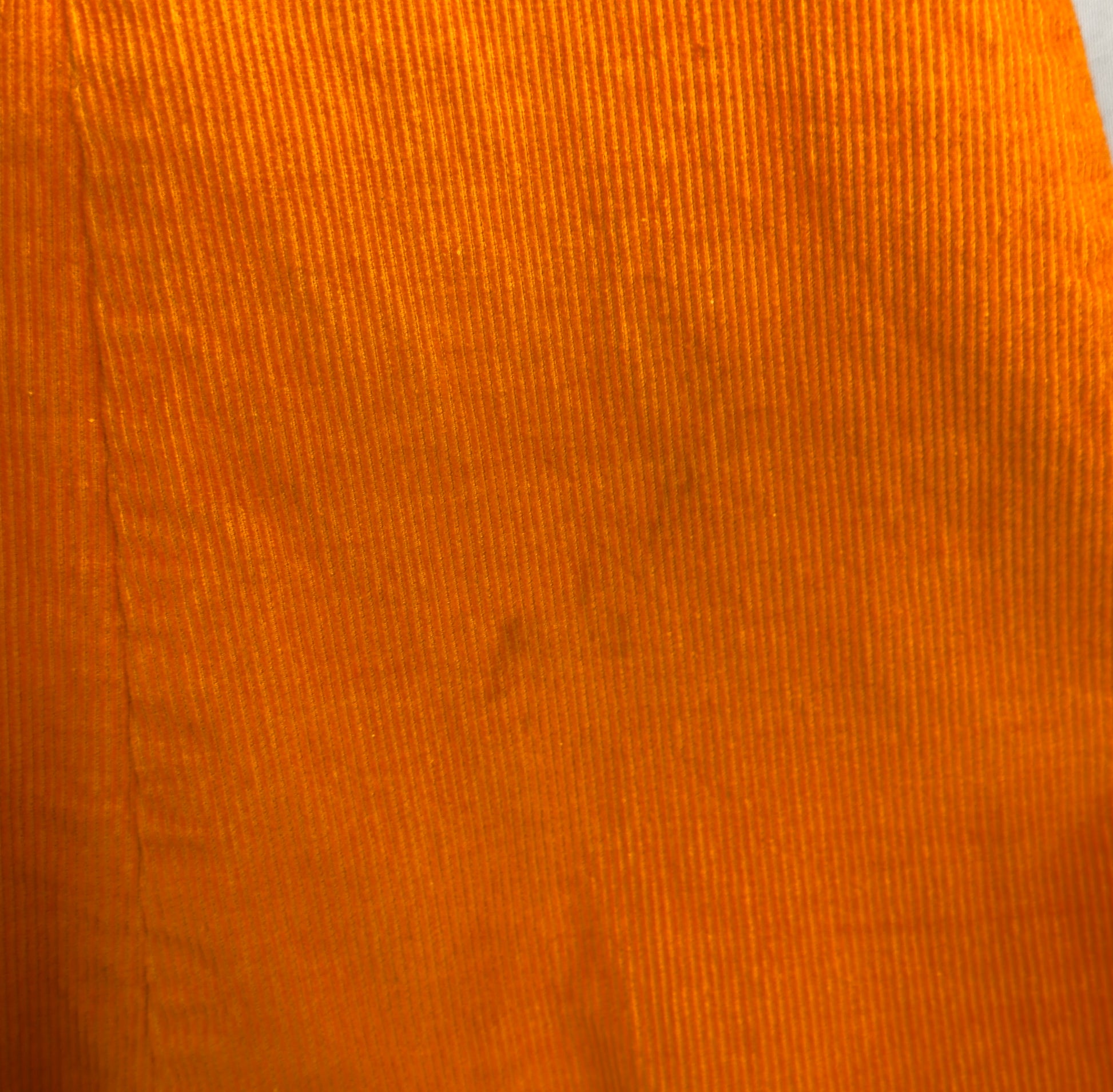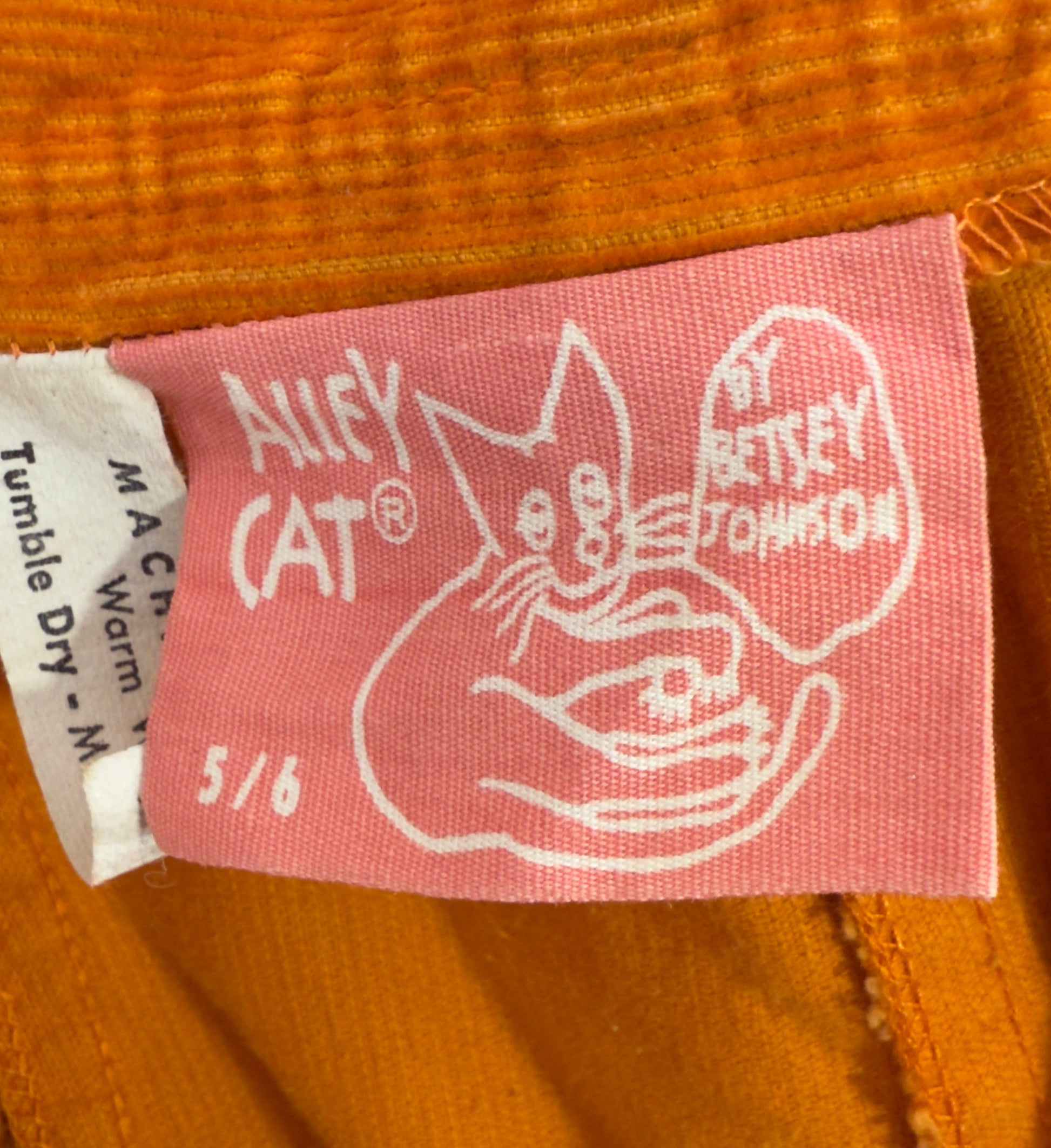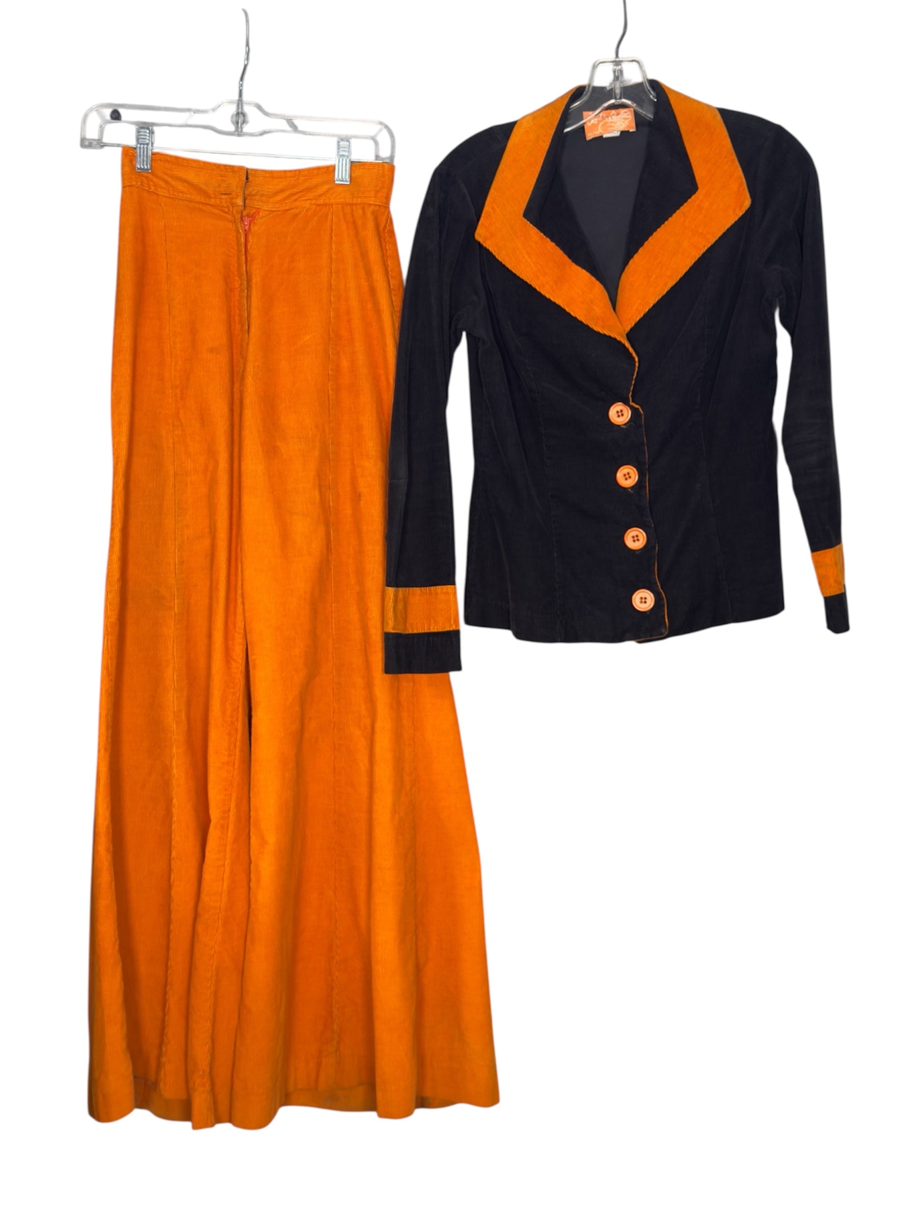 1970s Alley Cat by Betsey Johnson pantsuit. This corduroy set features orange bell-bottom pants and a black and orange jacket. The jacket has orange buttons that attach it, orange around the neckline, and orange striped cuffs. The pants attach with a metal zipper and two metal fastenings above it. The jacket is marked size 11/12 and the pants are marked size 5/6, but please refer to the measurements. There are some condition issues with the pants, shown in the last four photos. There is a scattering of marks on the pants, which is reflected in the price.