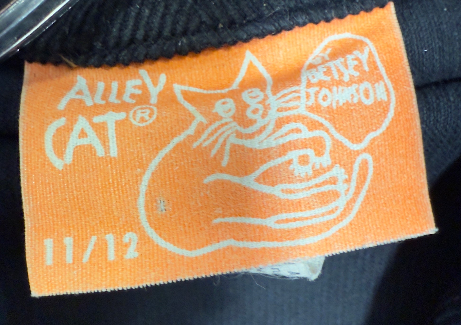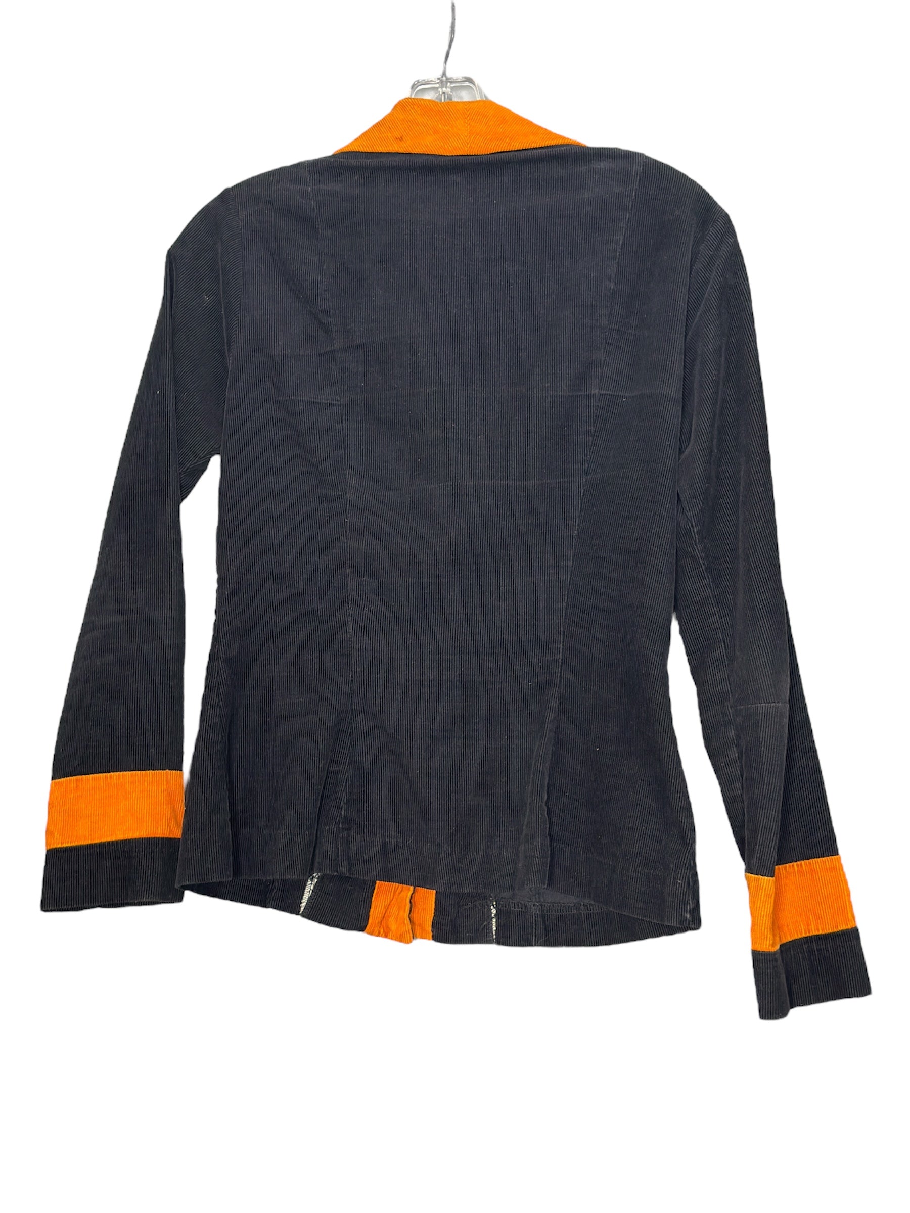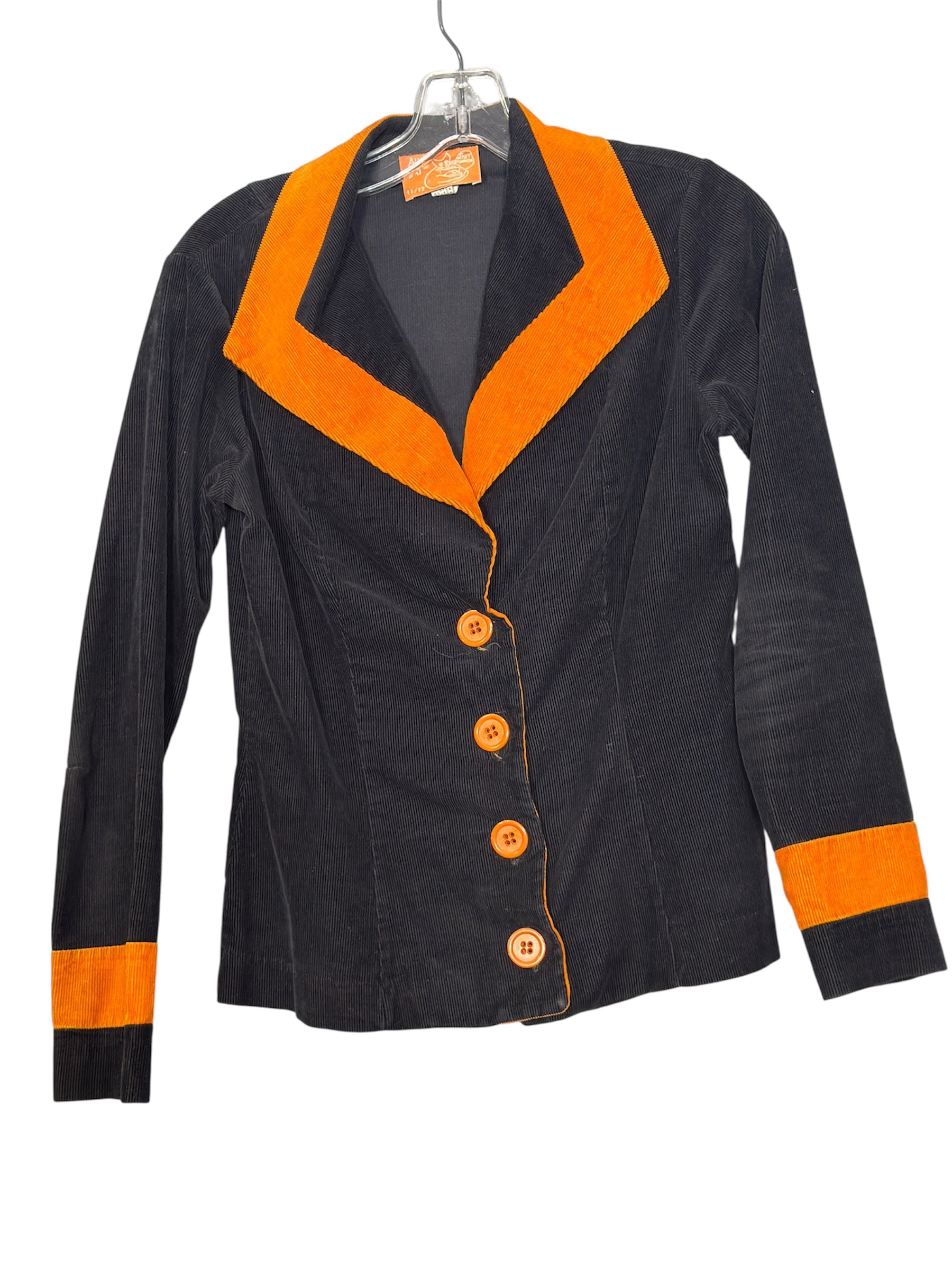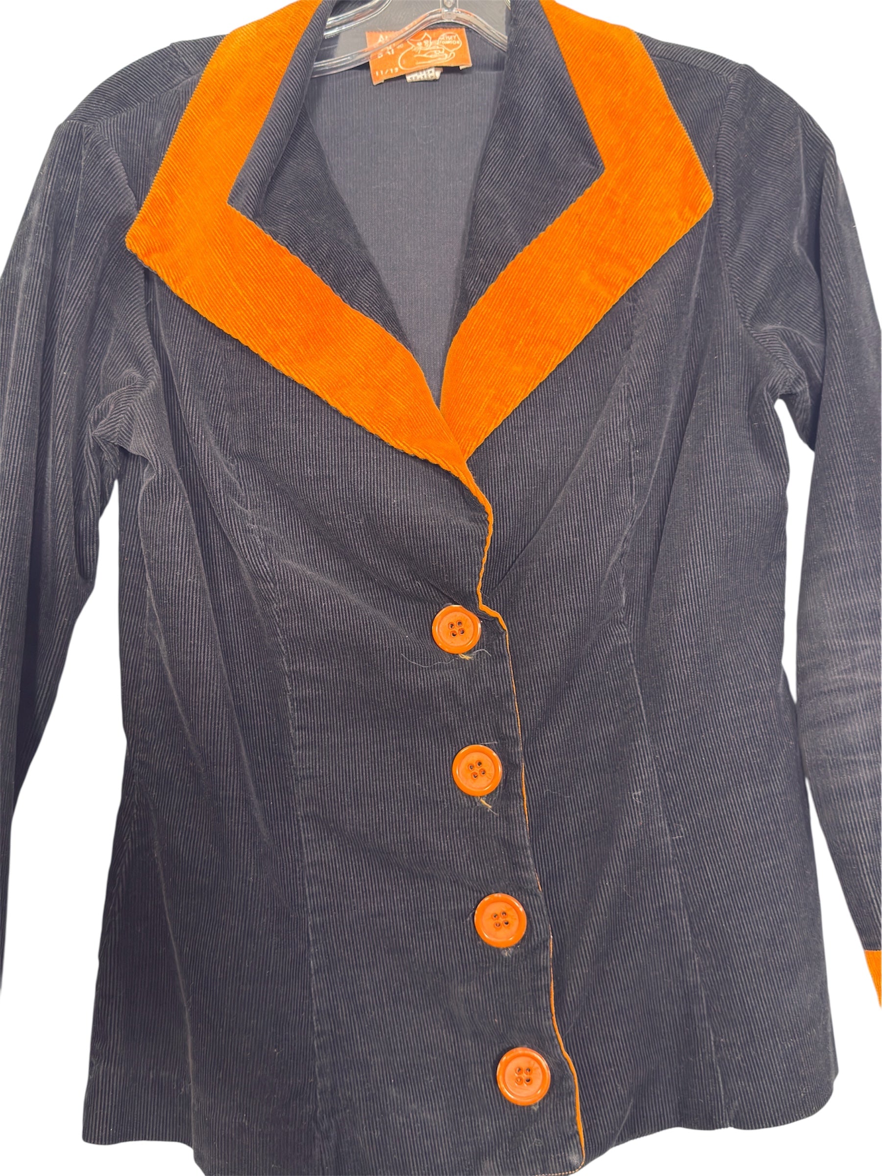 1970s Alley Cat by Betsey Johnson pantsuit. This corduroy set features orange bell-bottom pants and a black and orange jacket. The jacket has orange buttons that attach it, orange around the neckline, and orange striped cuffs. The pants attach with a metal zipper and two metal fastenings above it. The jacket is marked size 11/12 and the pants are marked size 5/6, but please refer to the measurements. There are some condition issues with the pants, shown in the last four photos. There is a scattering of marks on the pants, which is reflected in the price.
