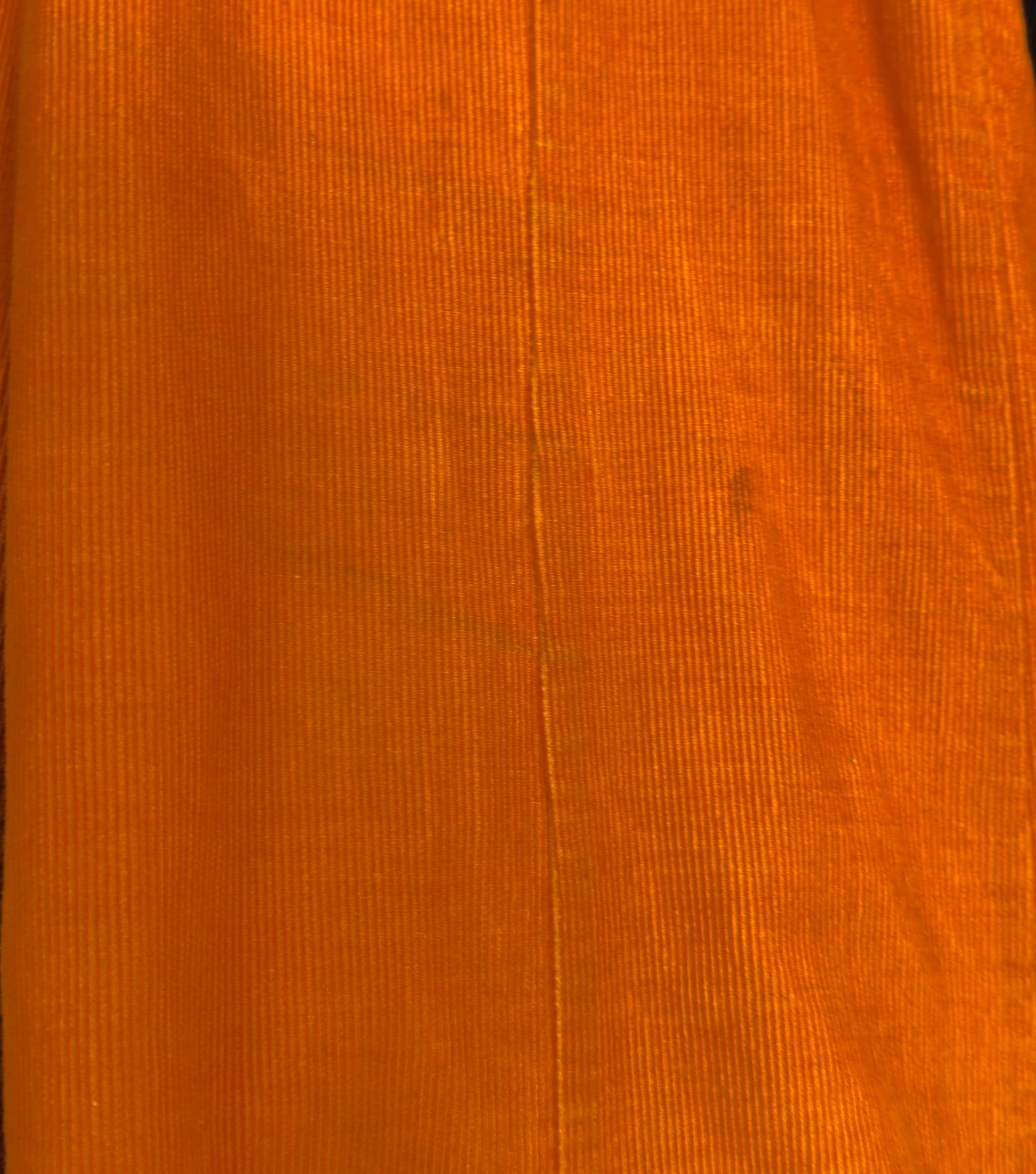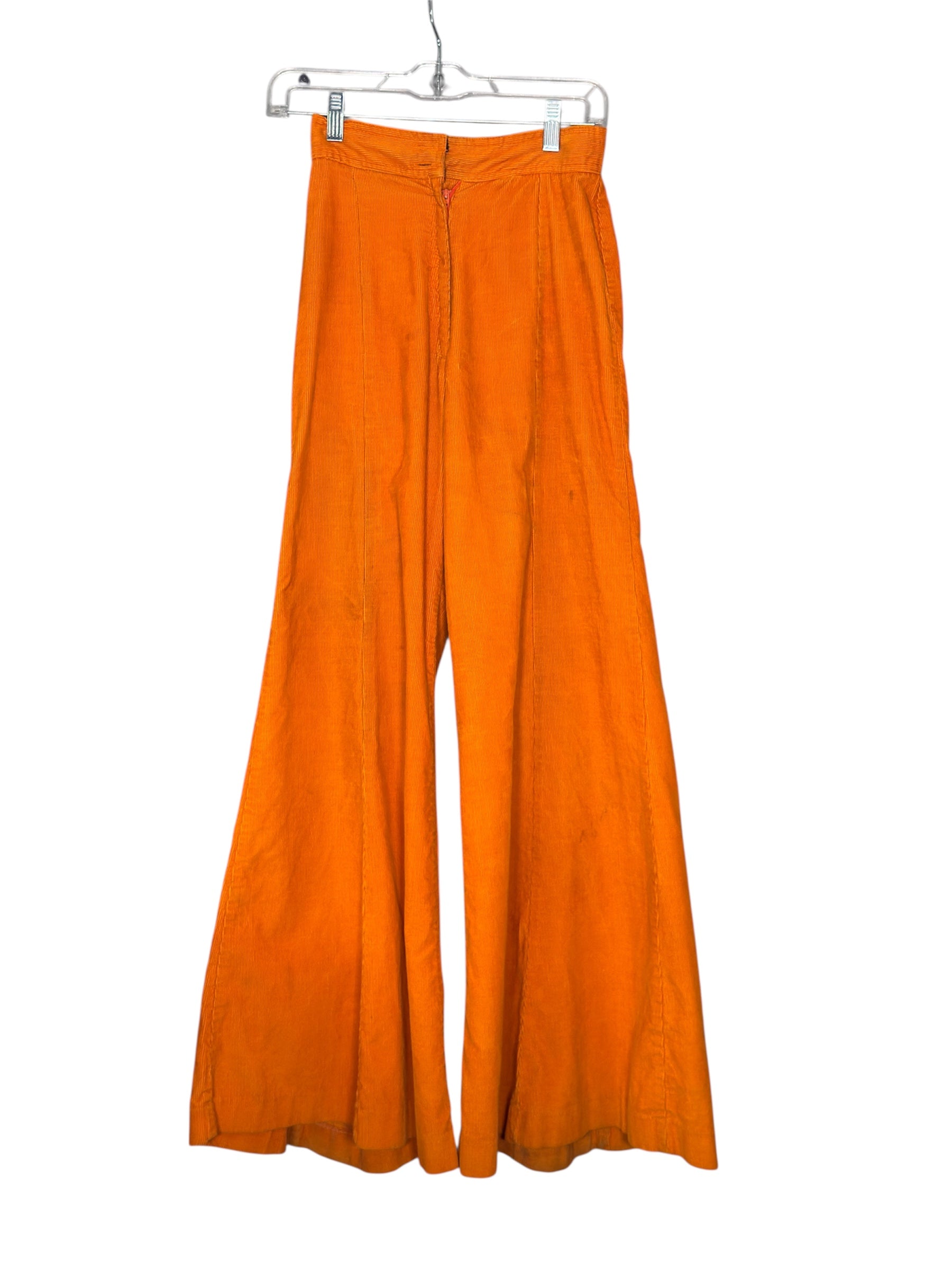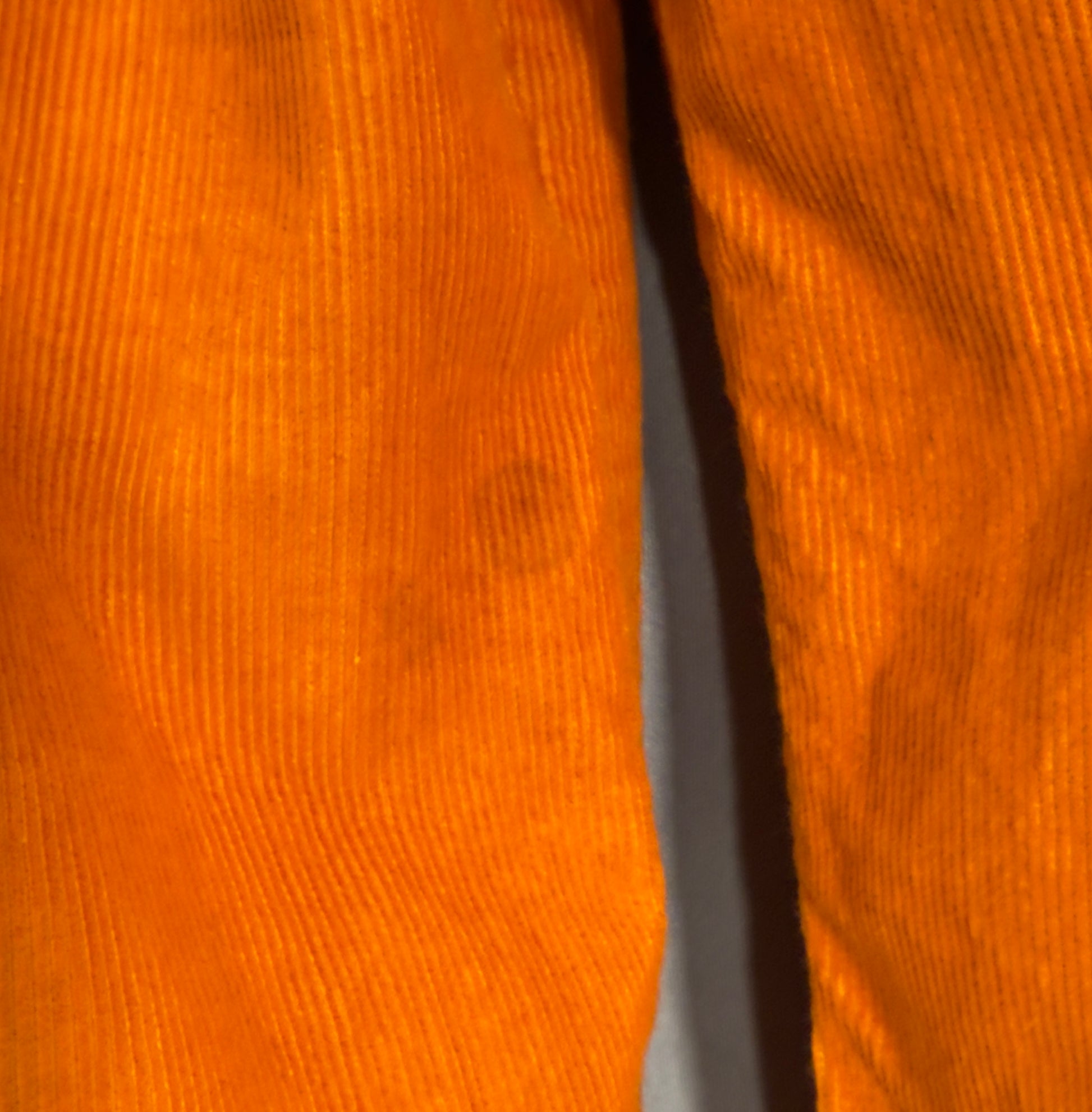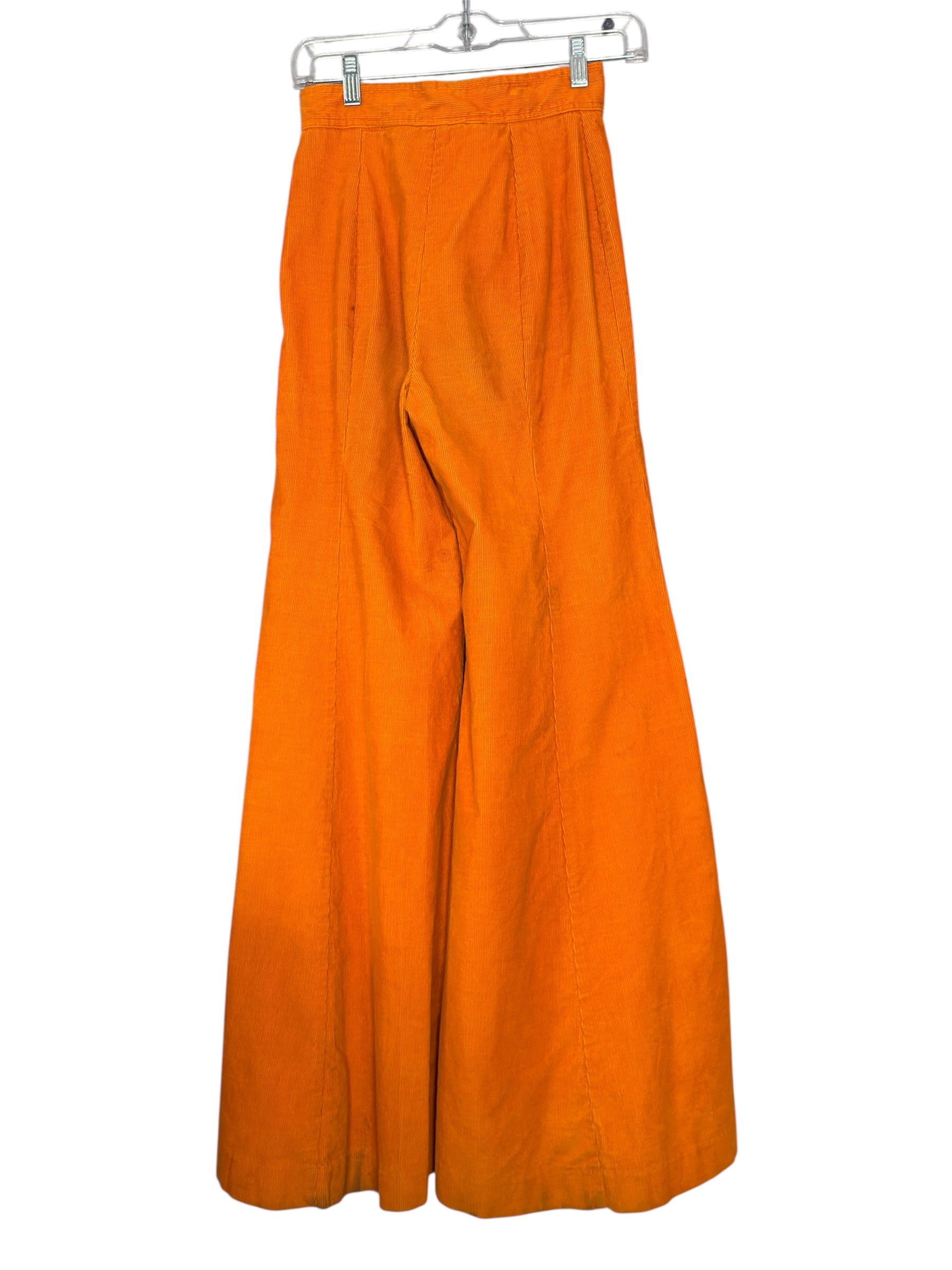 1970s Alley Cat by Betsey Johnson pantsuit. This corduroy set features orange bell-bottom pants and a black and orange jacket. The jacket has orange buttons that attach it, orange around the neckline, and orange striped cuffs. The pants attach with a metal zipper and two metal fastenings above it. The jacket is marked size 11/12 and the pants are marked size 5/6, but please refer to the measurements. There are some condition issues with the pants, shown in the last four photos. There is a scattering of marks on the pants, which is reflected in the price.