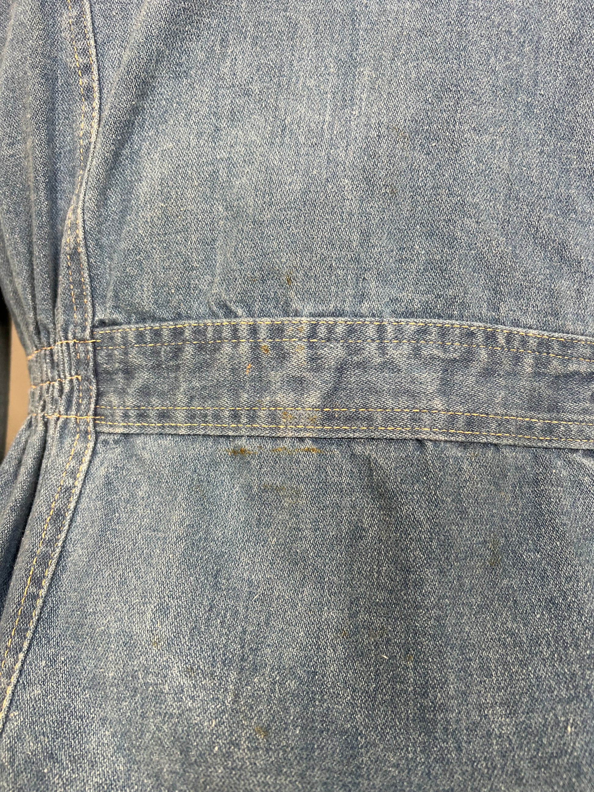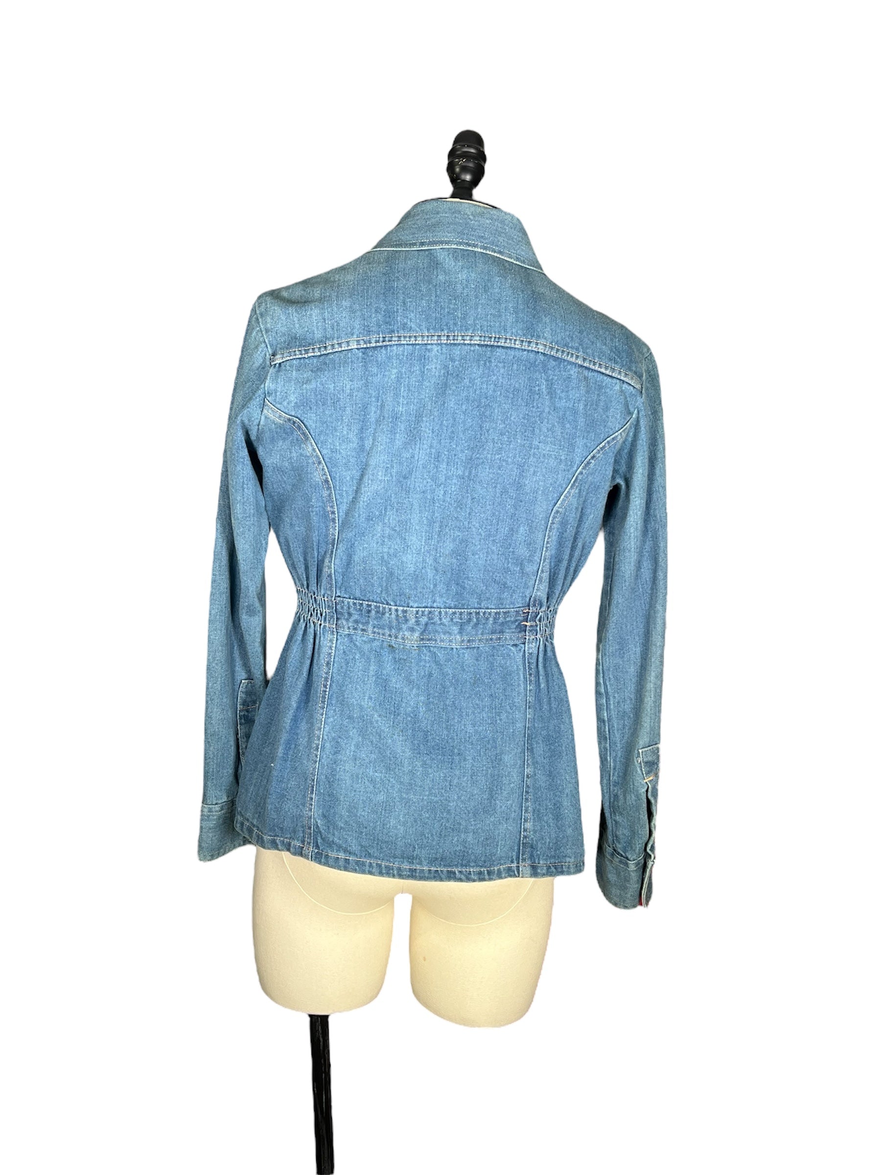 1970s Martin Bernard denim jacket. This jacket features a slight dagger collar and pockets on either breast and either hip. It closes with a zipper that starts part way up the jacket. It has gathered side details to finish out the impressive design. This jacket is made in Hong Kong. There is a slight condition issue, pictured in the last photo. There is a minor stain on the back, just under the waistband.
