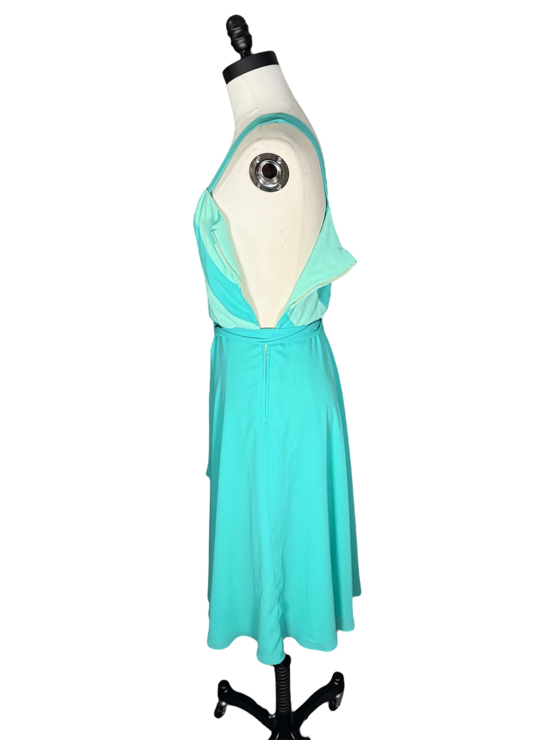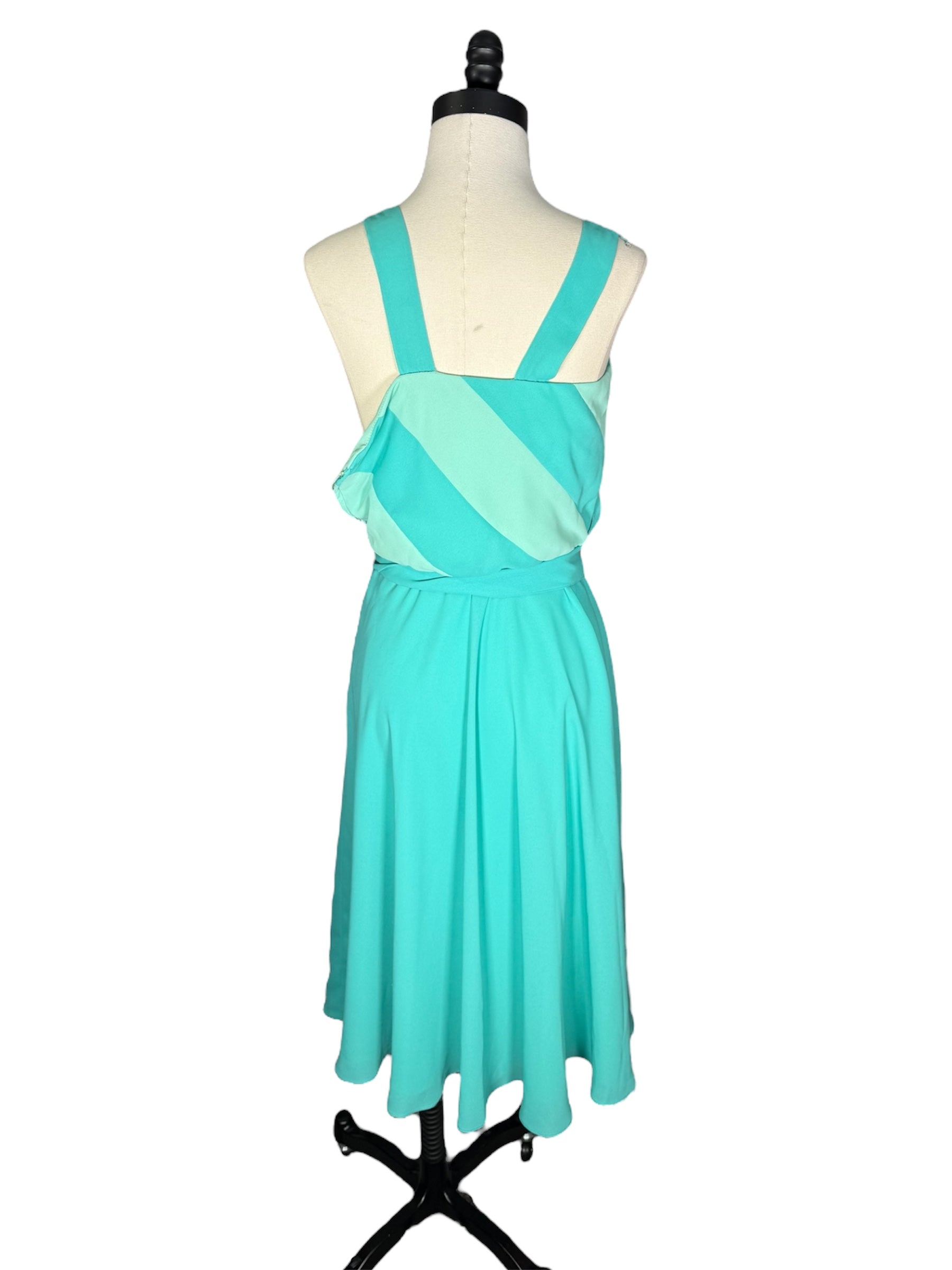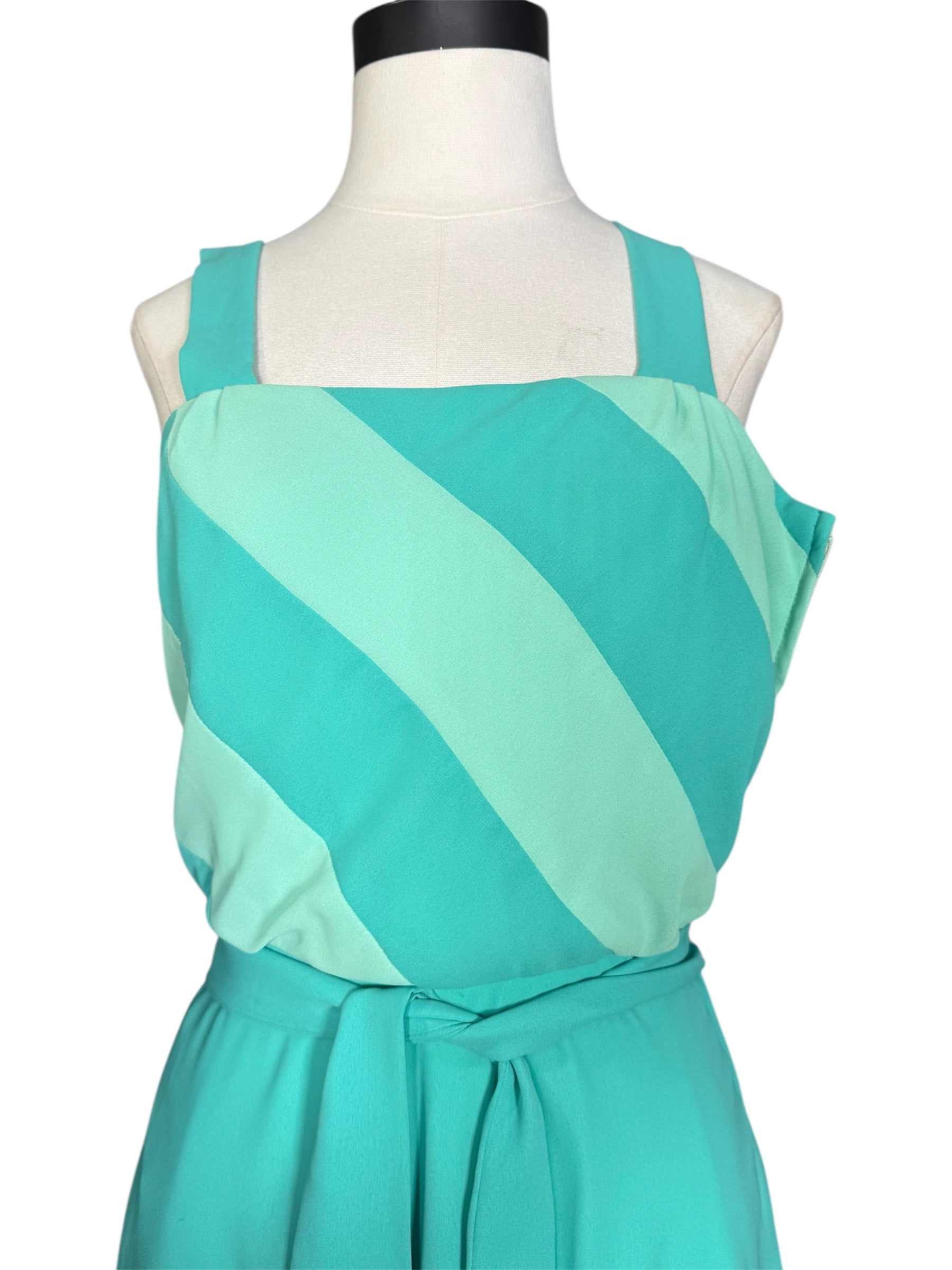 1970s doncaster disco dress. This teal dress is striped on the bust and is sleeveless. It has a square neckline and comes with a matching fabric belt. It attaches with a metal side zipper, which functions properly. It is not fully zipped in the photos due to the small size of the dress. It is marked a size 4 but please refer to the measurements as sizing changes across decades.