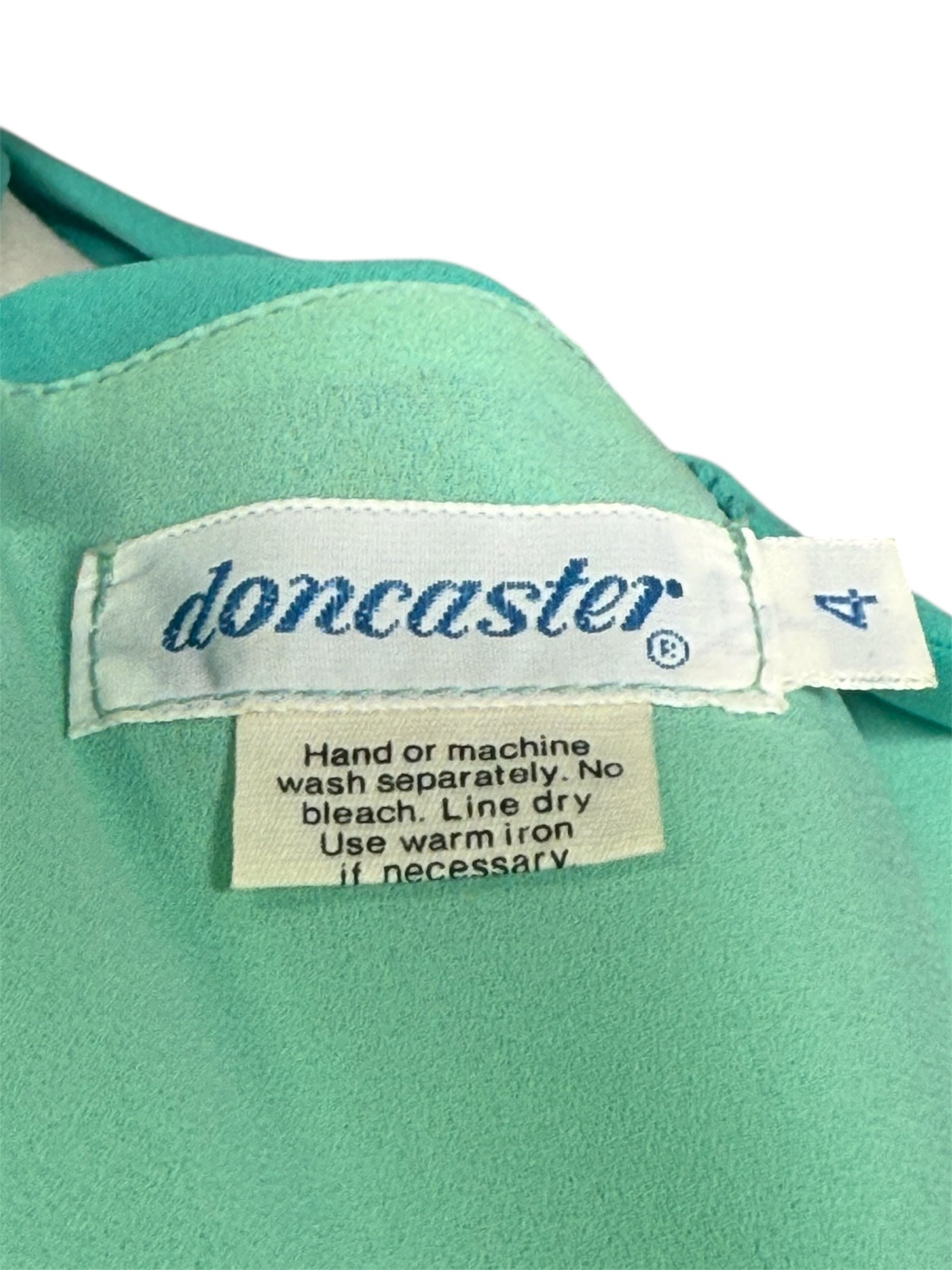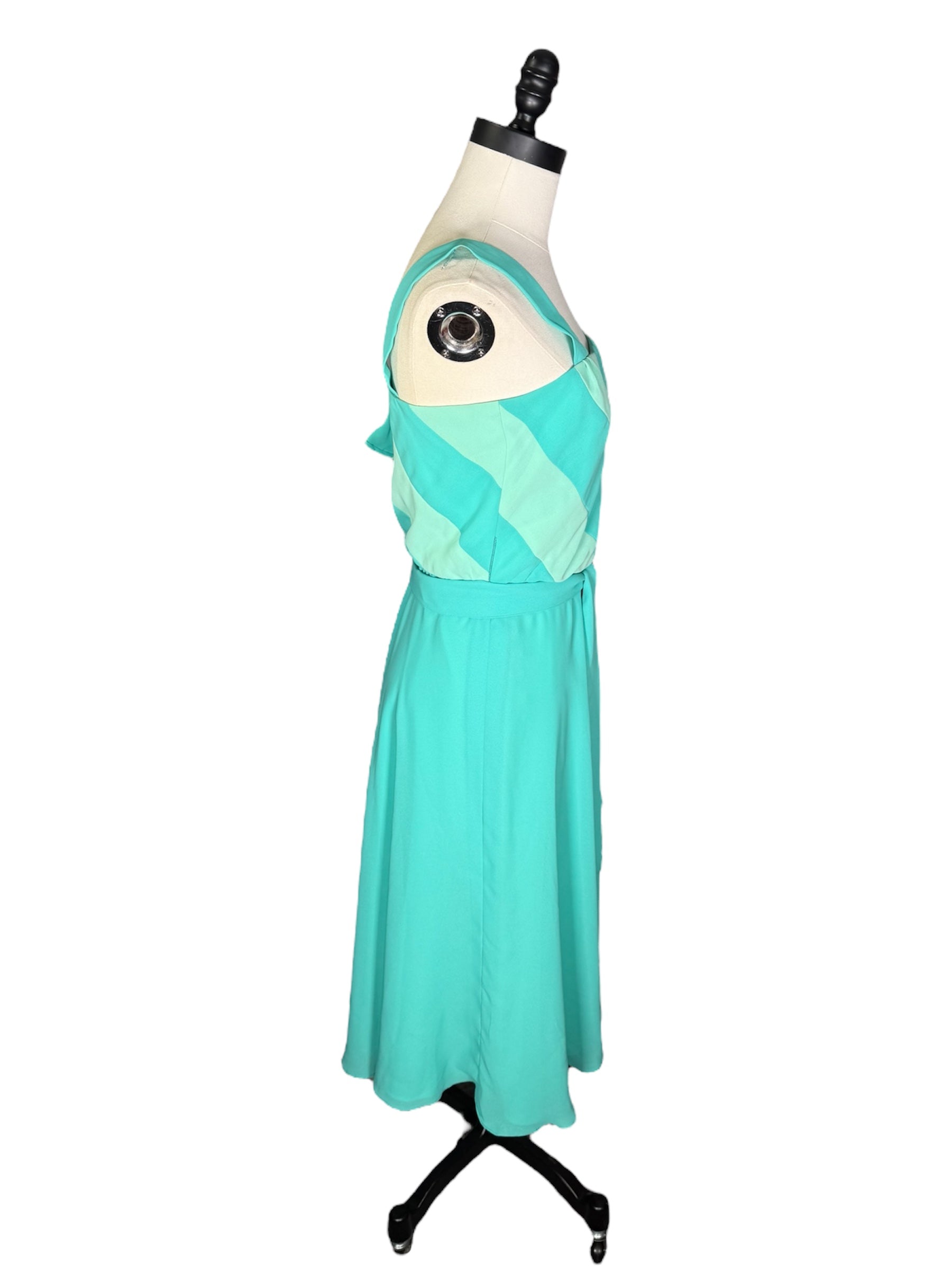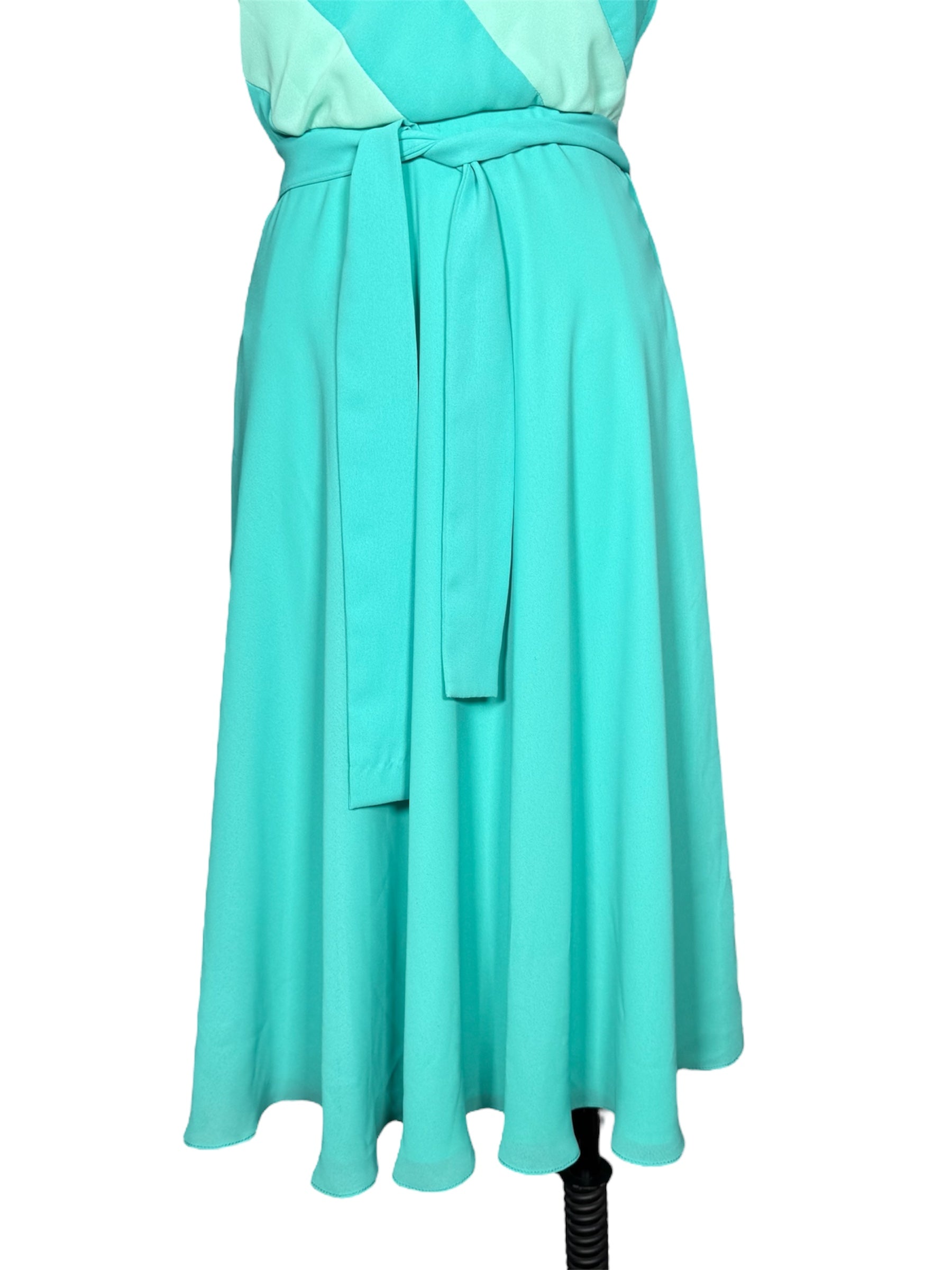 1970s doncaster disco dress. This teal dress is striped on the bust and is sleeveless. It has a square neckline and comes with a matching fabric belt. It attaches with a metal side zipper, which functions properly. It is not fully zipped in the photos due to the small size of the dress. It is marked a size 4 but please refer to the measurements as sizing changes across decades.