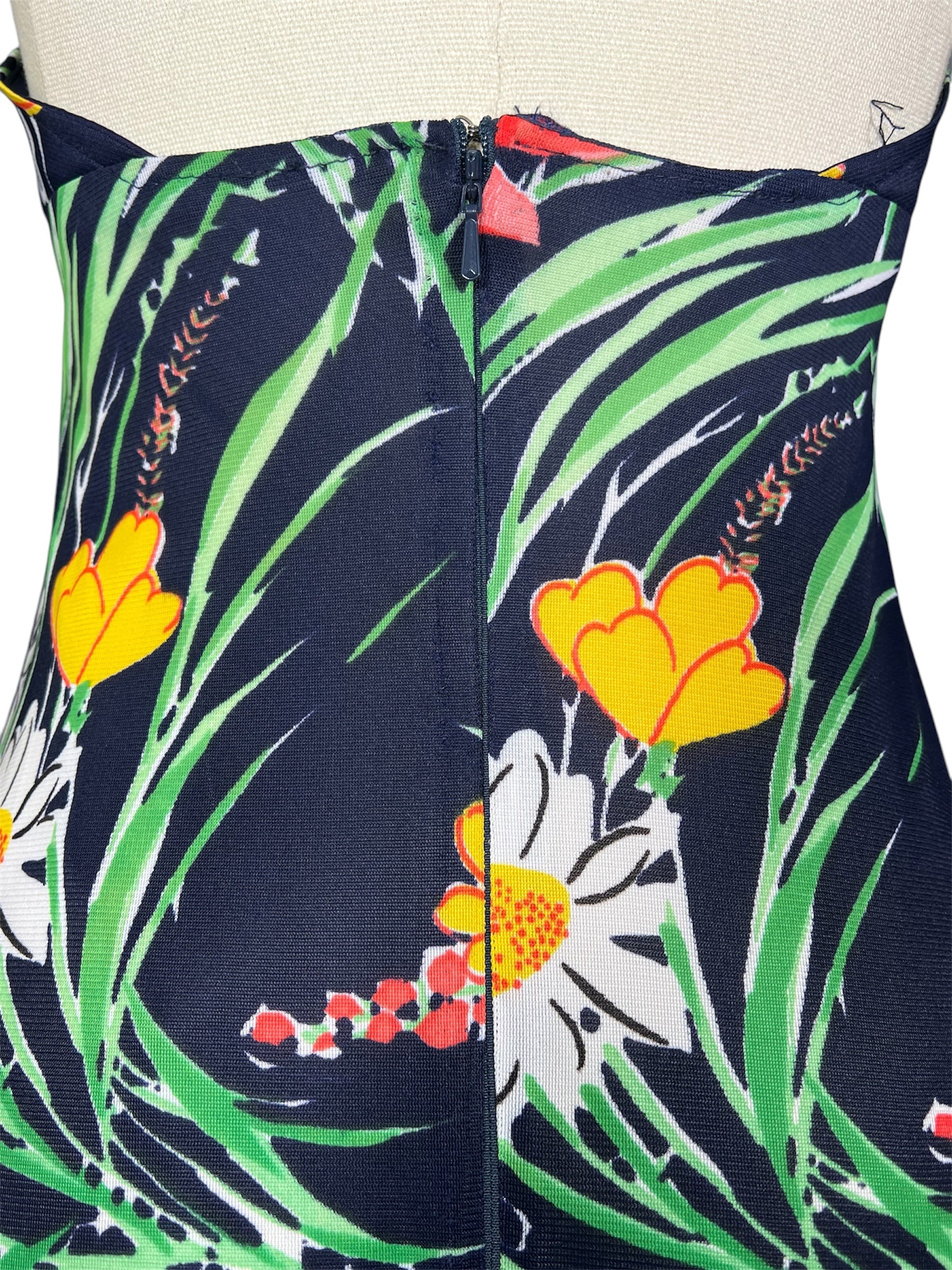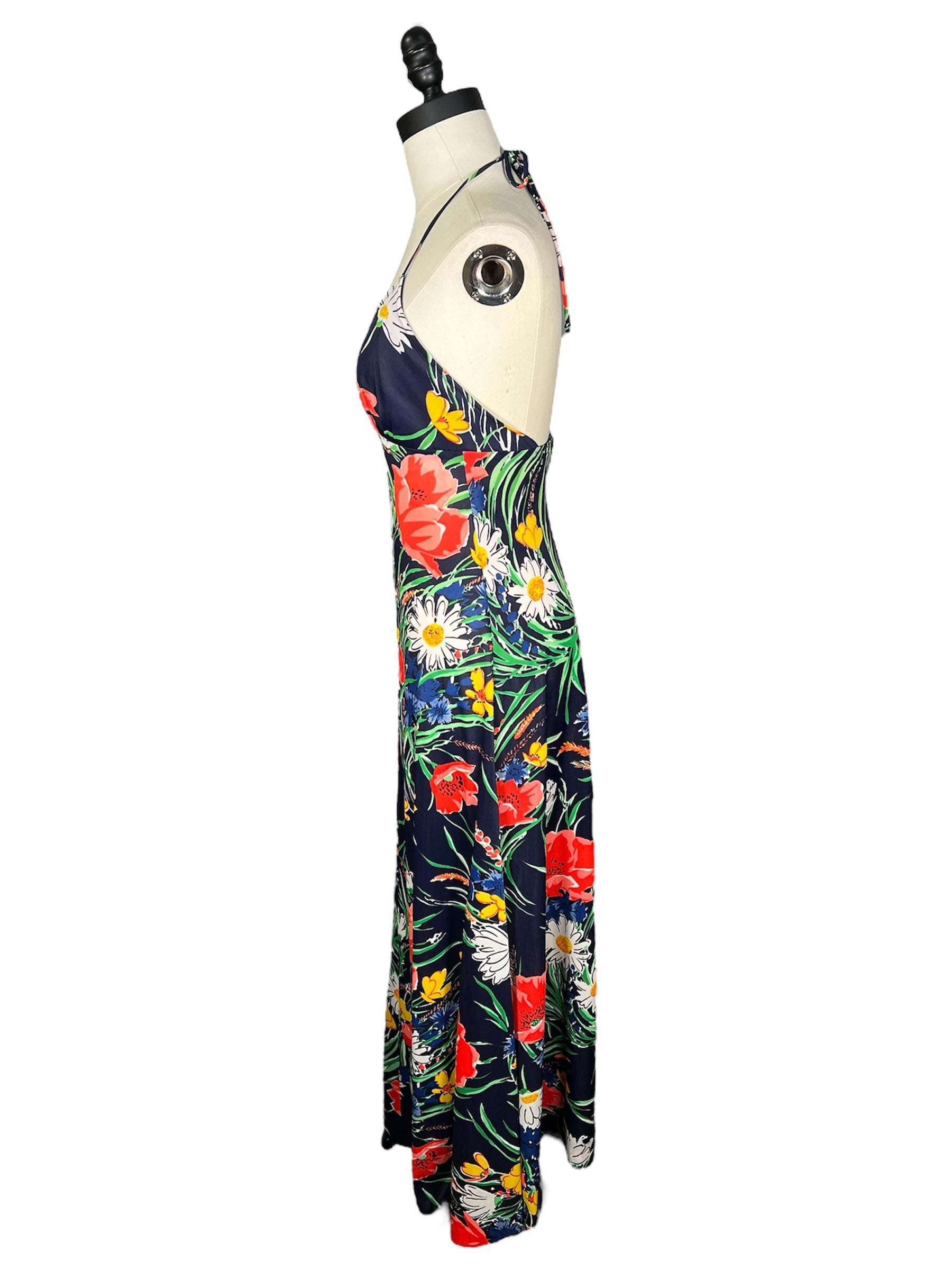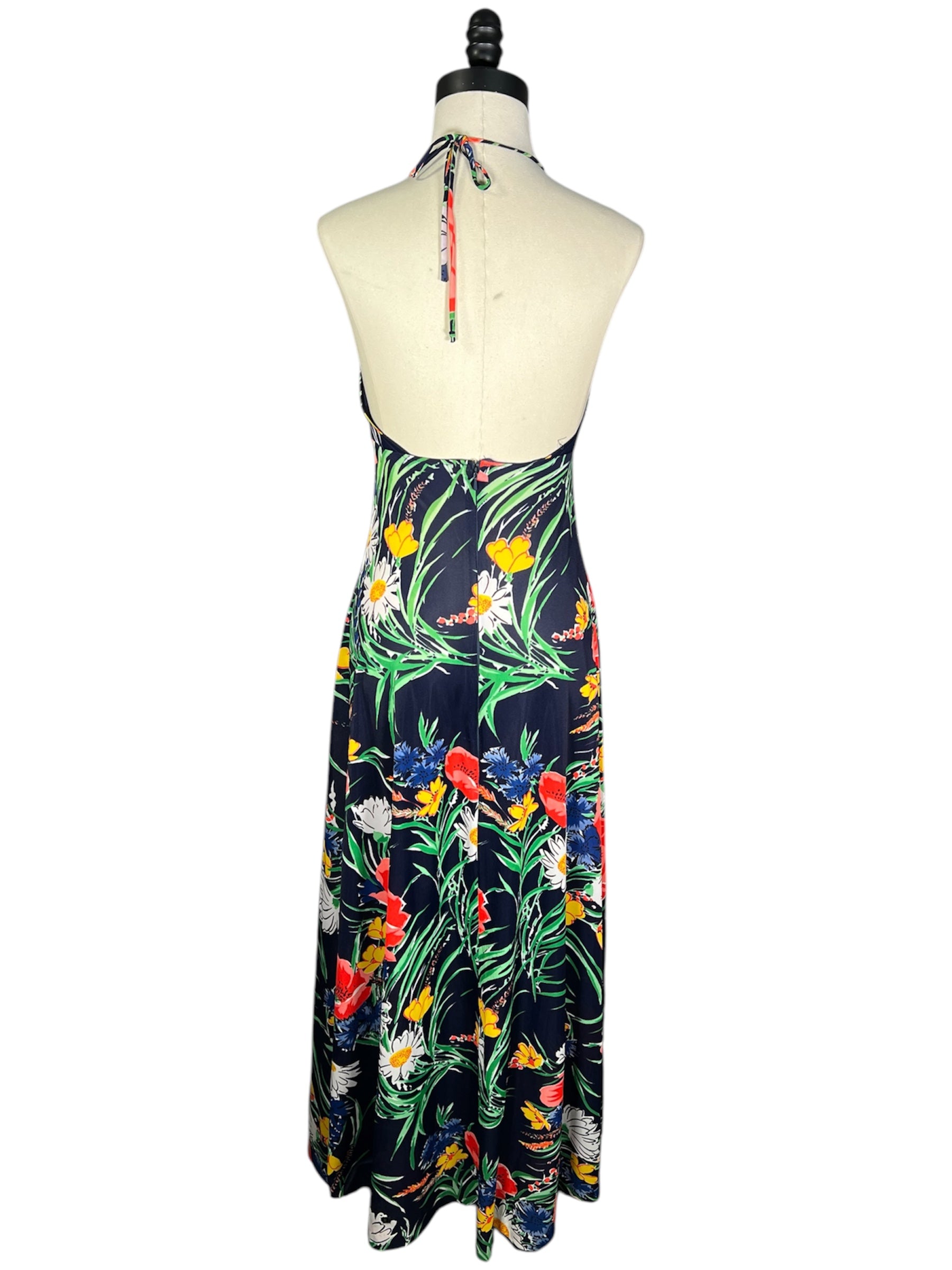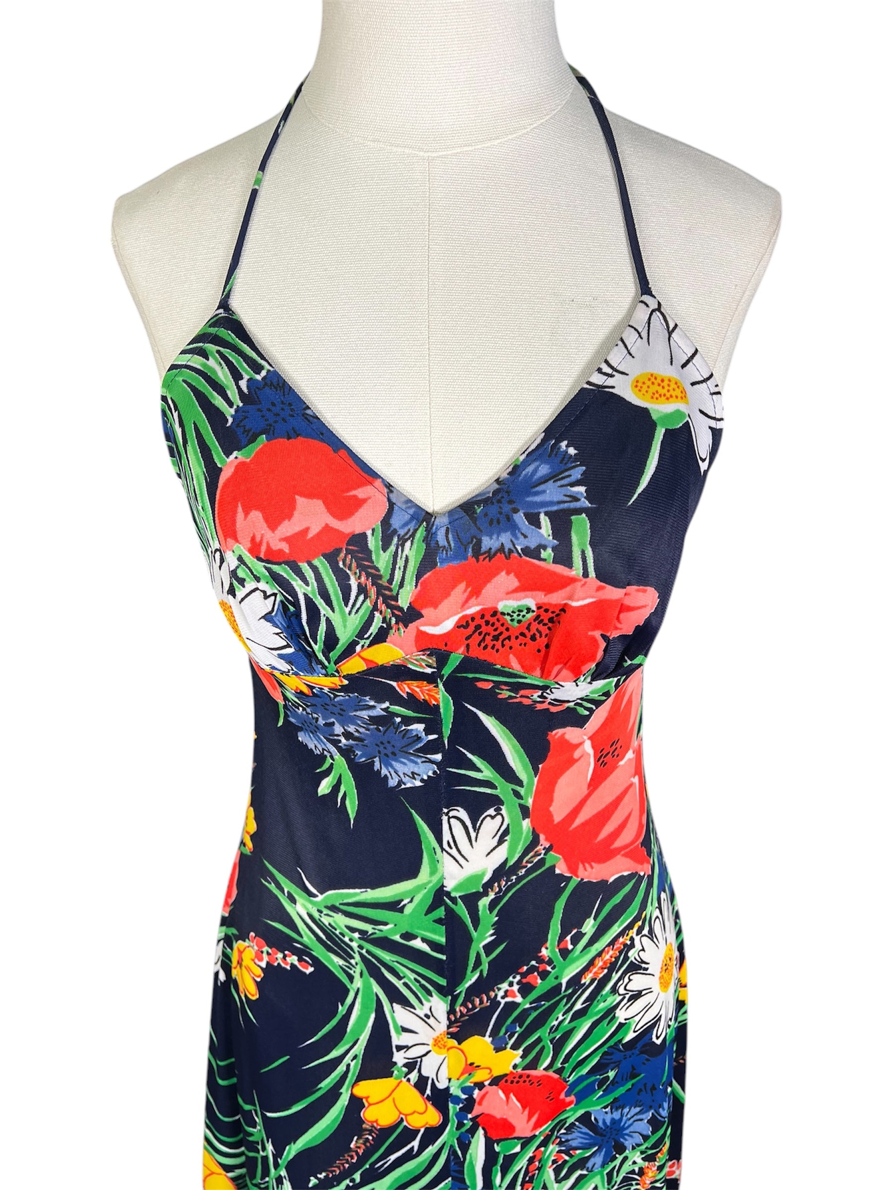 1970s unlabeled, floral, halter top dress. This summery dress features navy, red, yellow, green, and white colors. The dress is a maxi cut with with a low back and an empire waist. It has v-neck and attaches at the back with a zipper.